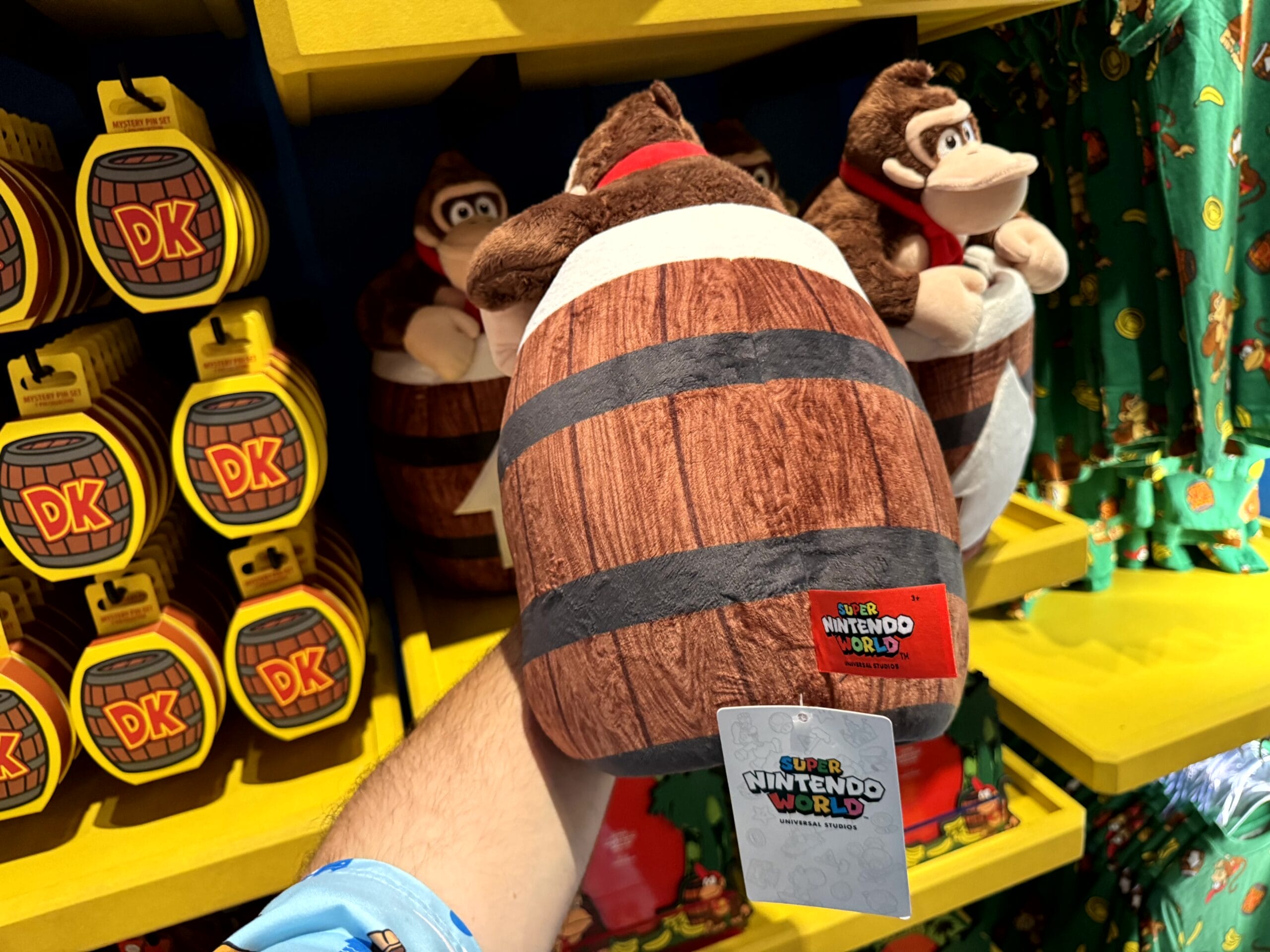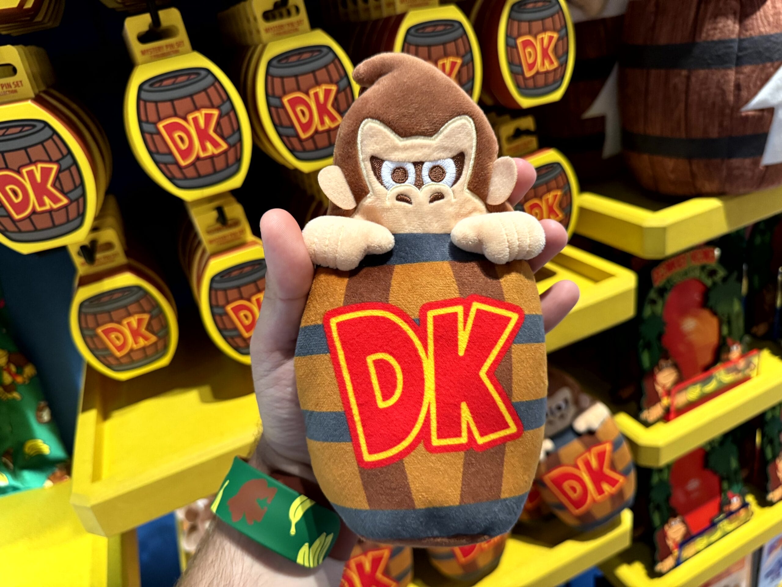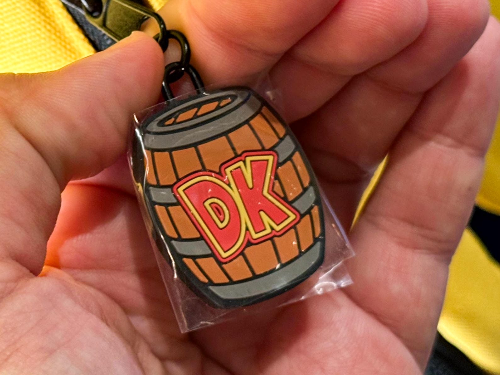 Donkey Kong is pictured against a yellow background on a charm dangling from a “DK” barrel charm.