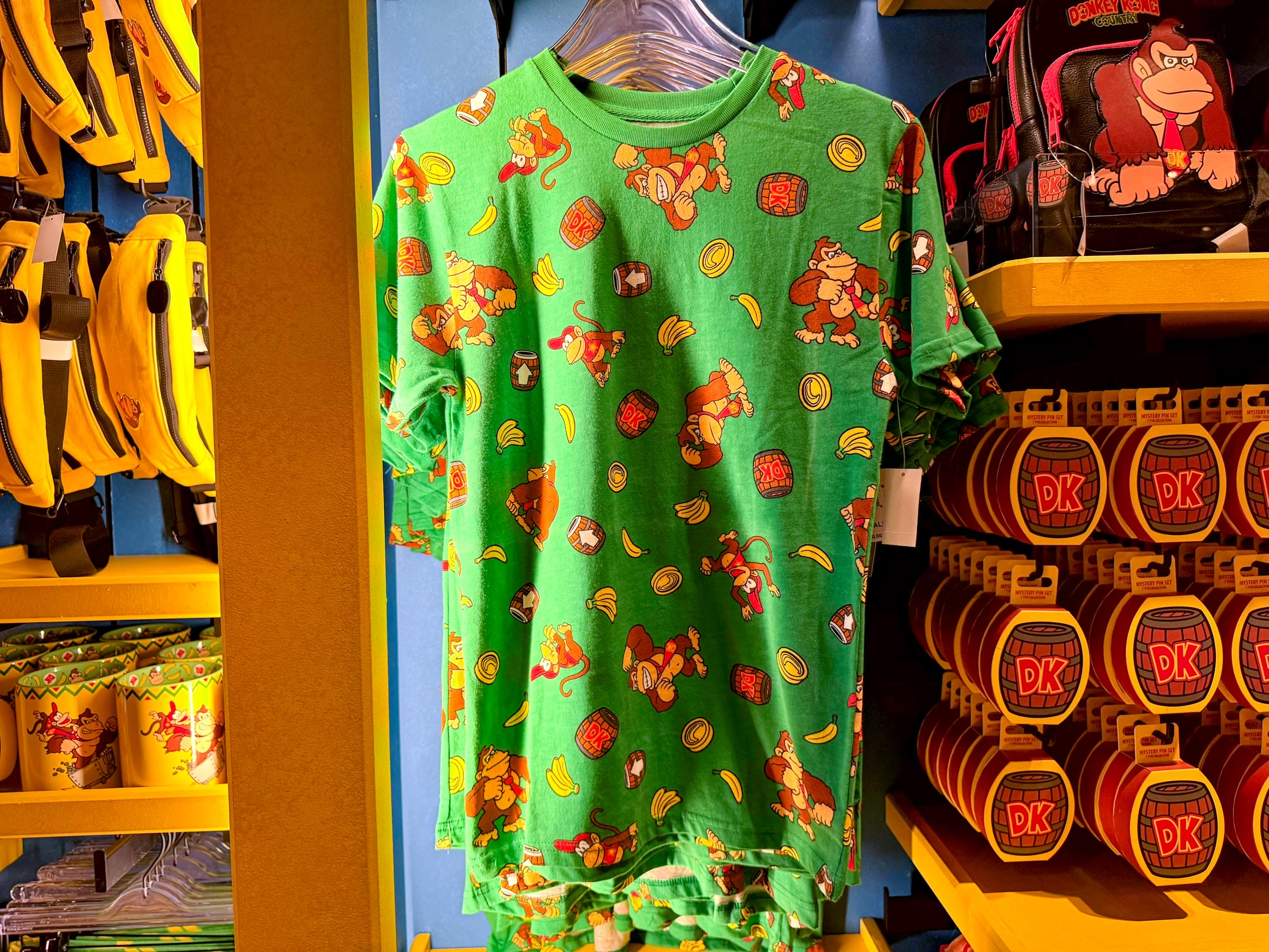 This tee features a render of Super Nintendo World characters in the land with Mt. Beanpole and the Donkey Kong Country temple behind them. There are fireworks and balloons in the sky.