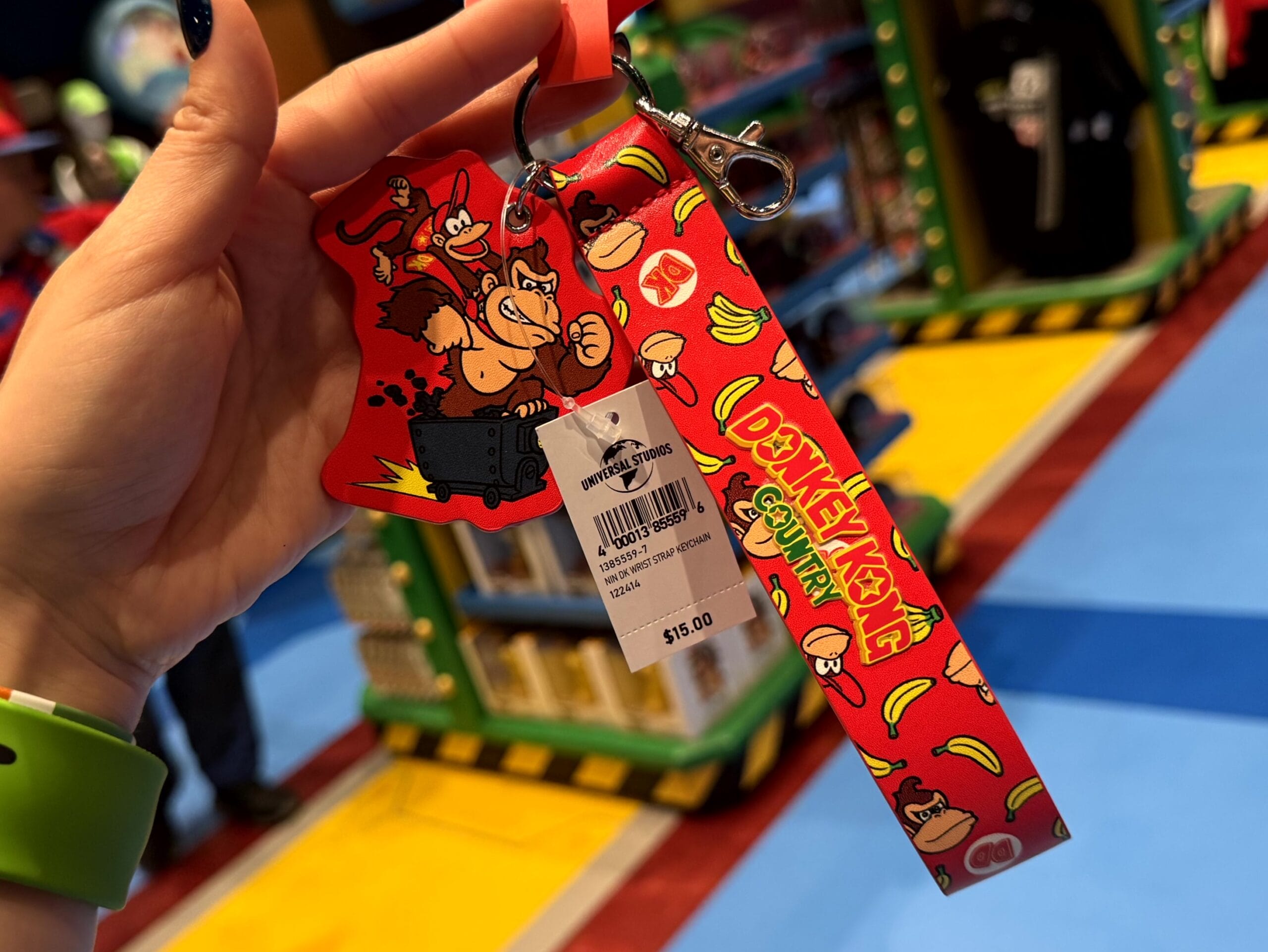 This keychain has a red wristlet lanyard patterned with Donkey Kong icons and a silicone charm of Donkey and Diddy in the mine cart.