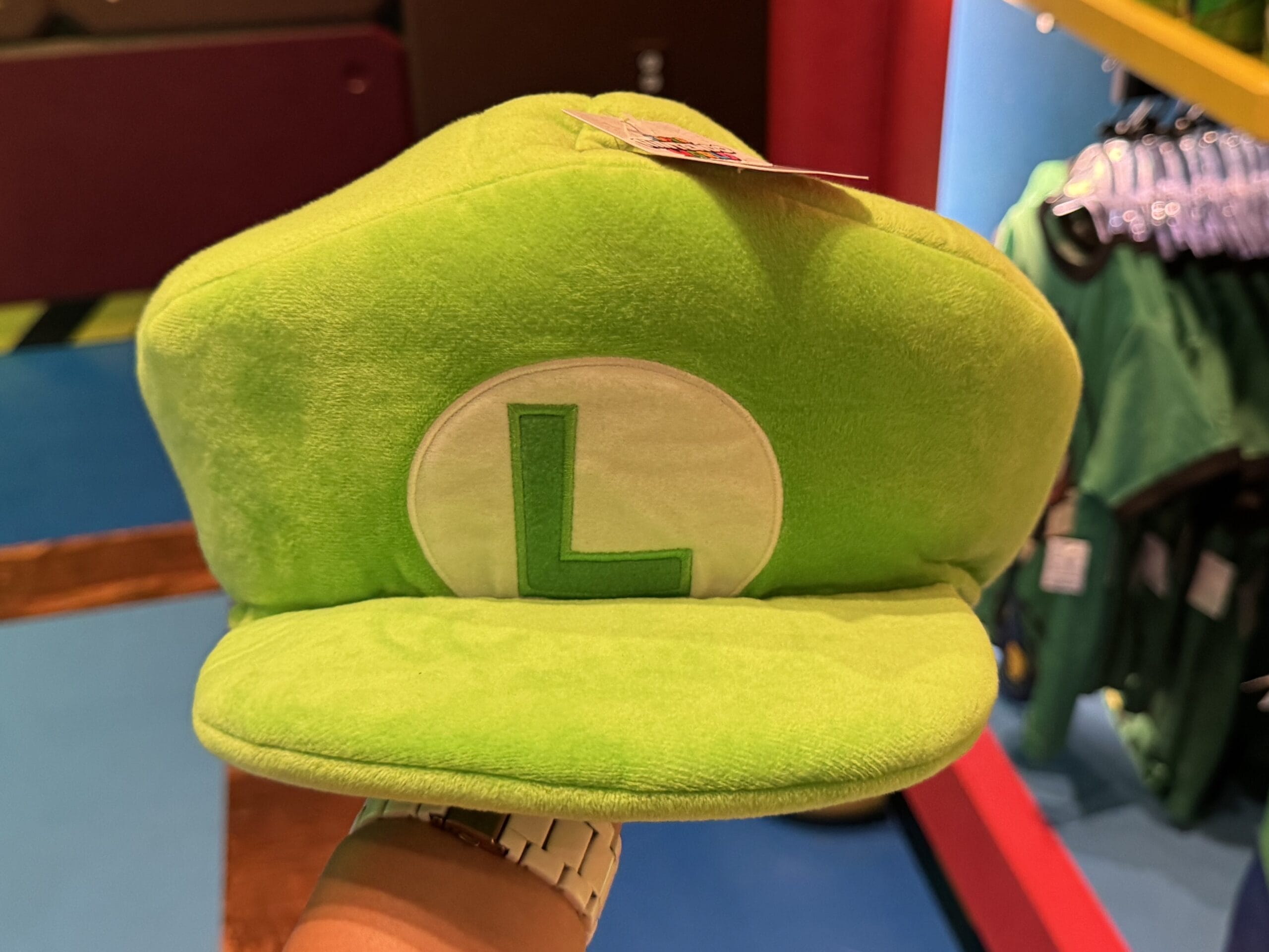 This hat is a large plush mushroom cap, just like Toad’s. It’s white with red spots.