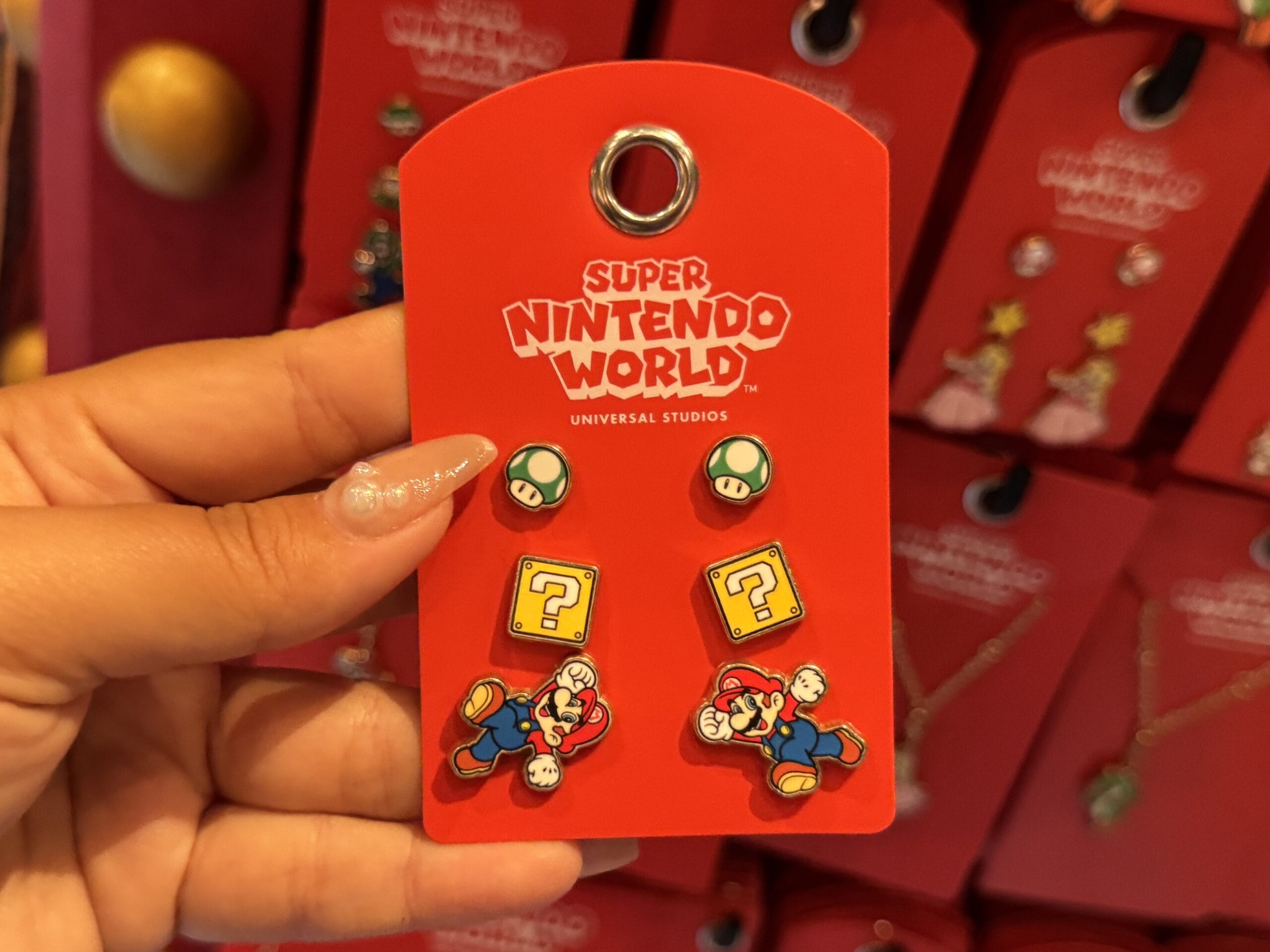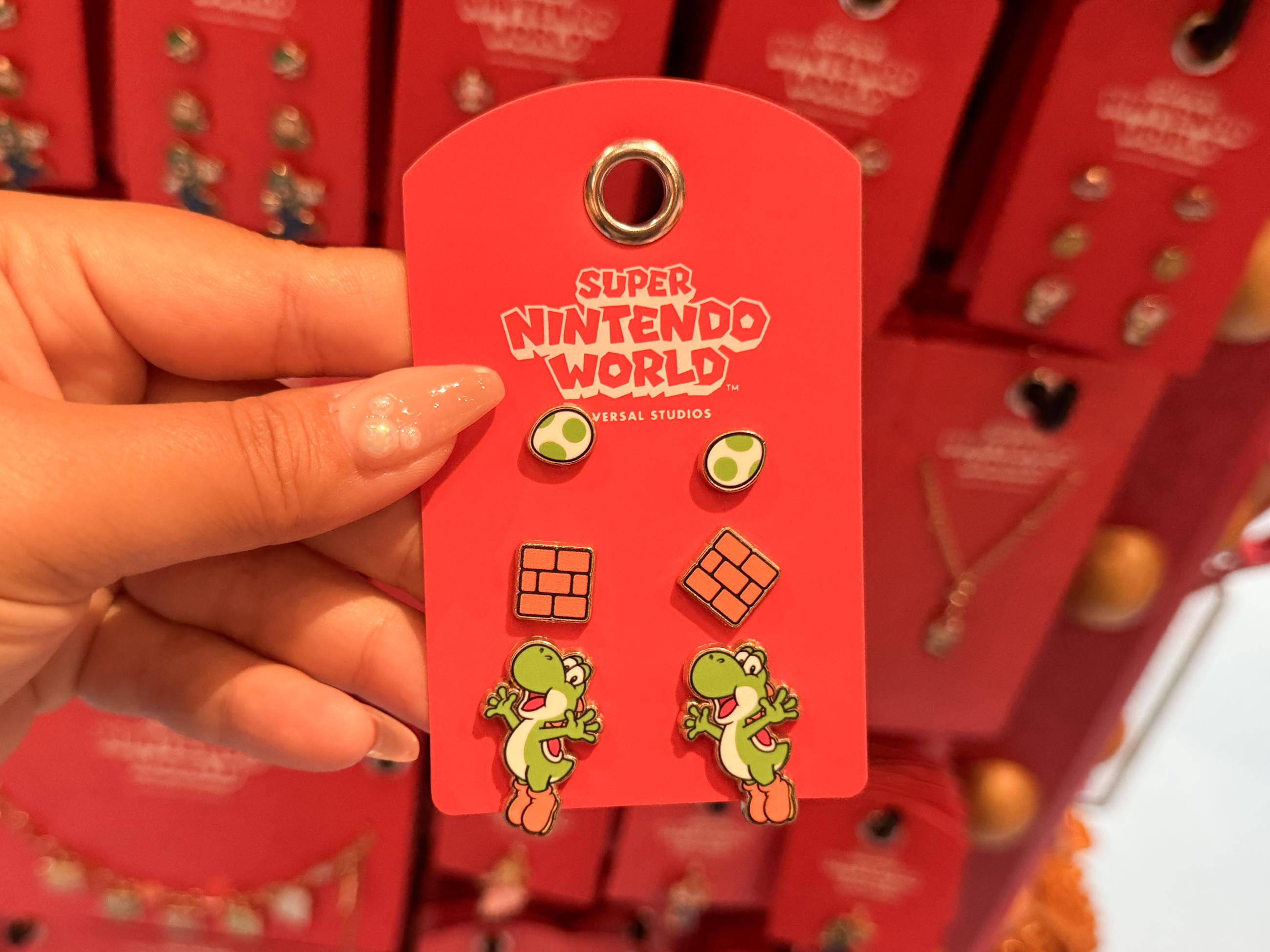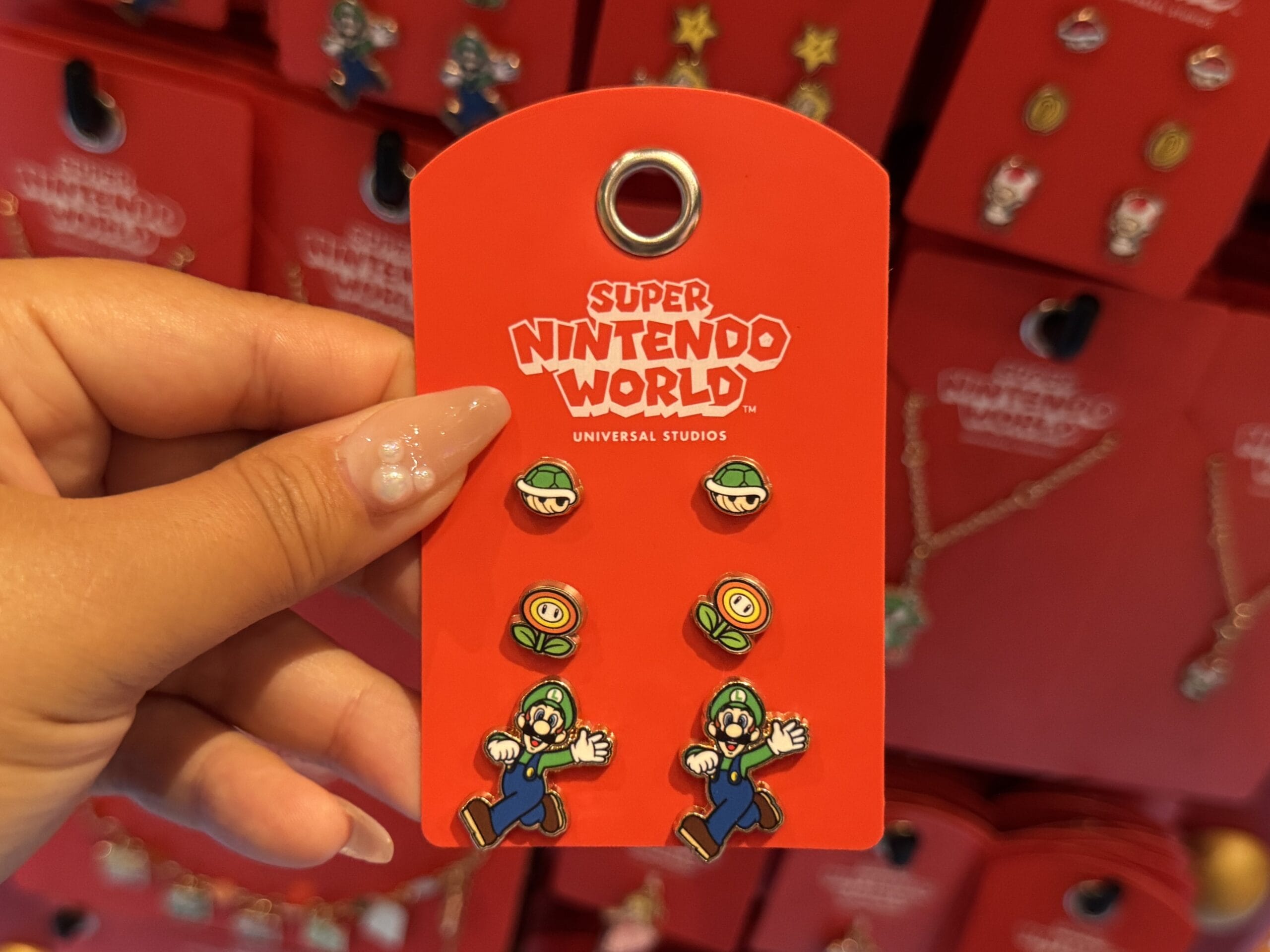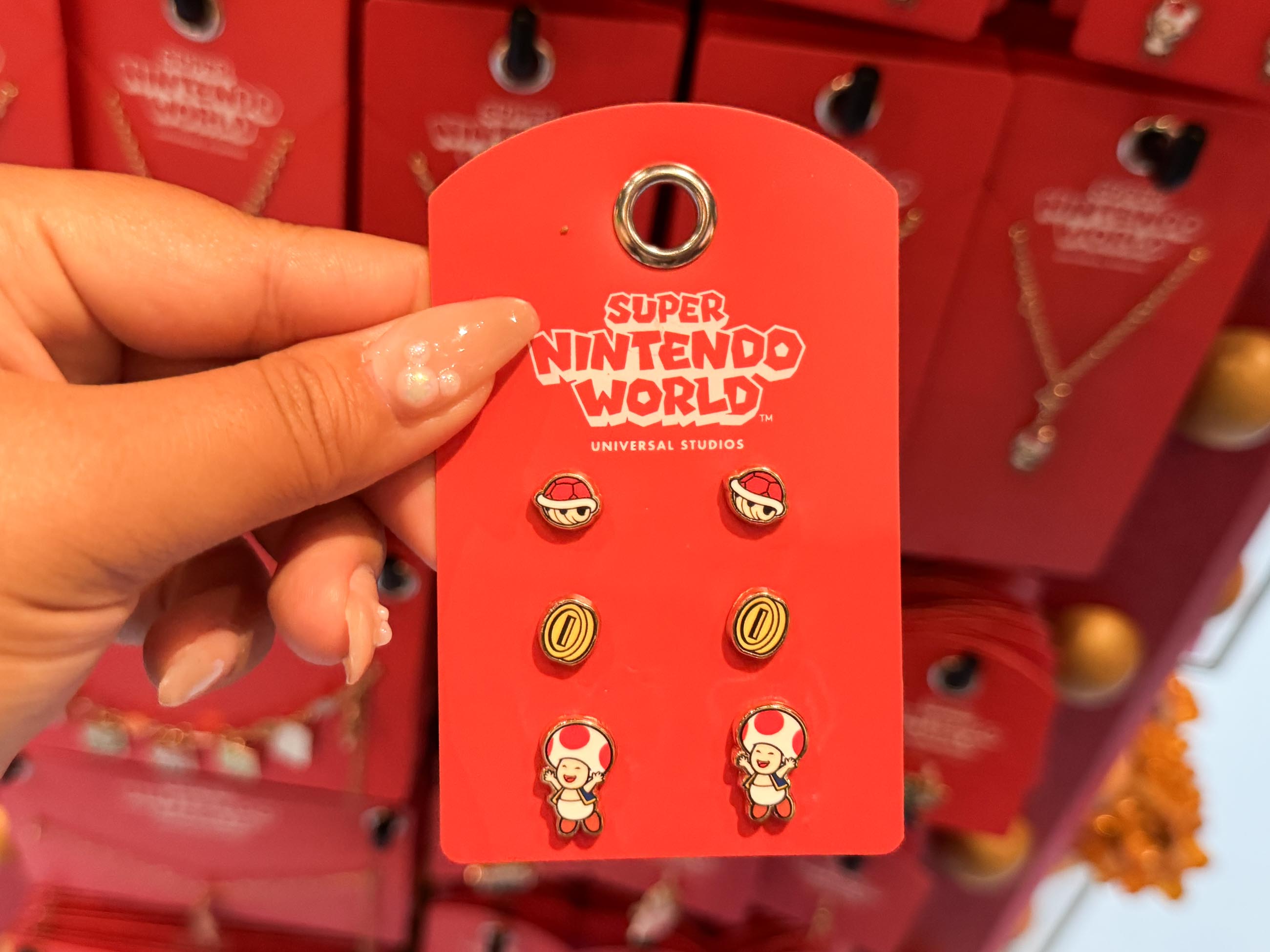 This set includes three earrings of a red Koopa shell, gold coins, and Toad.