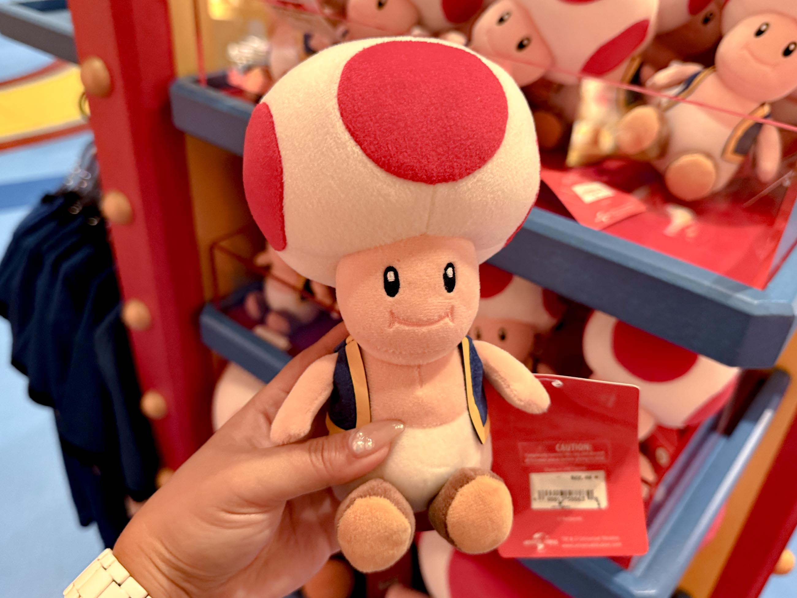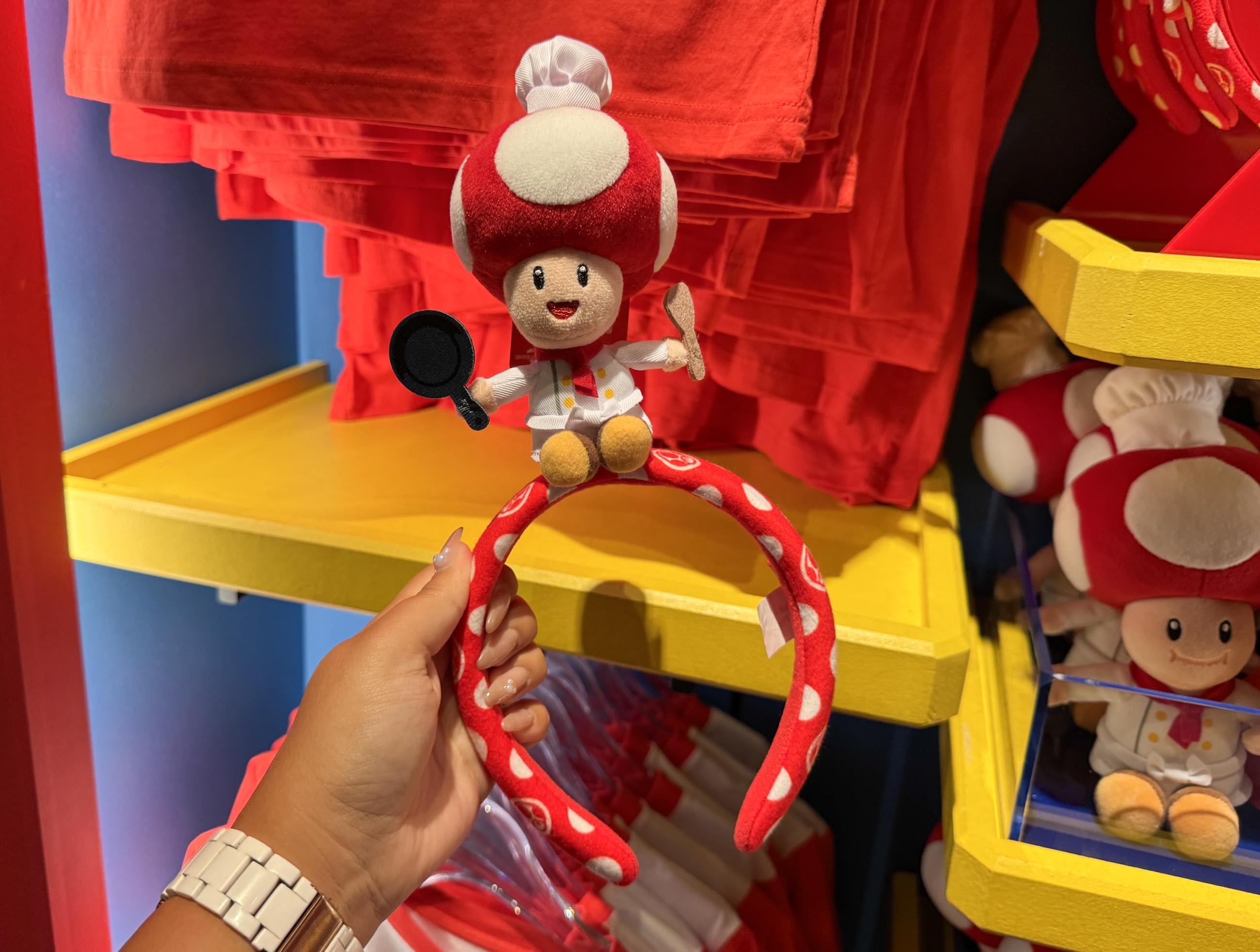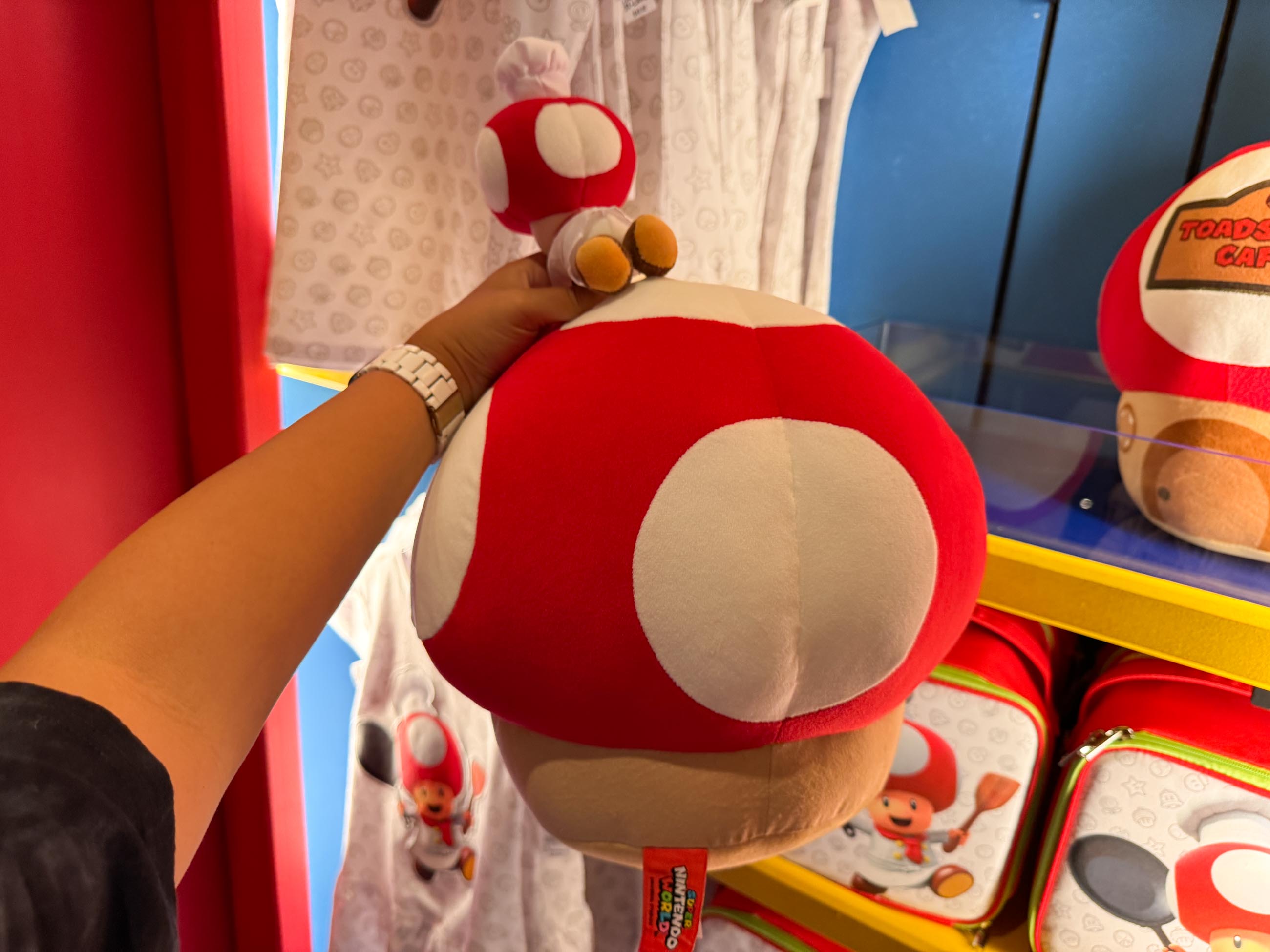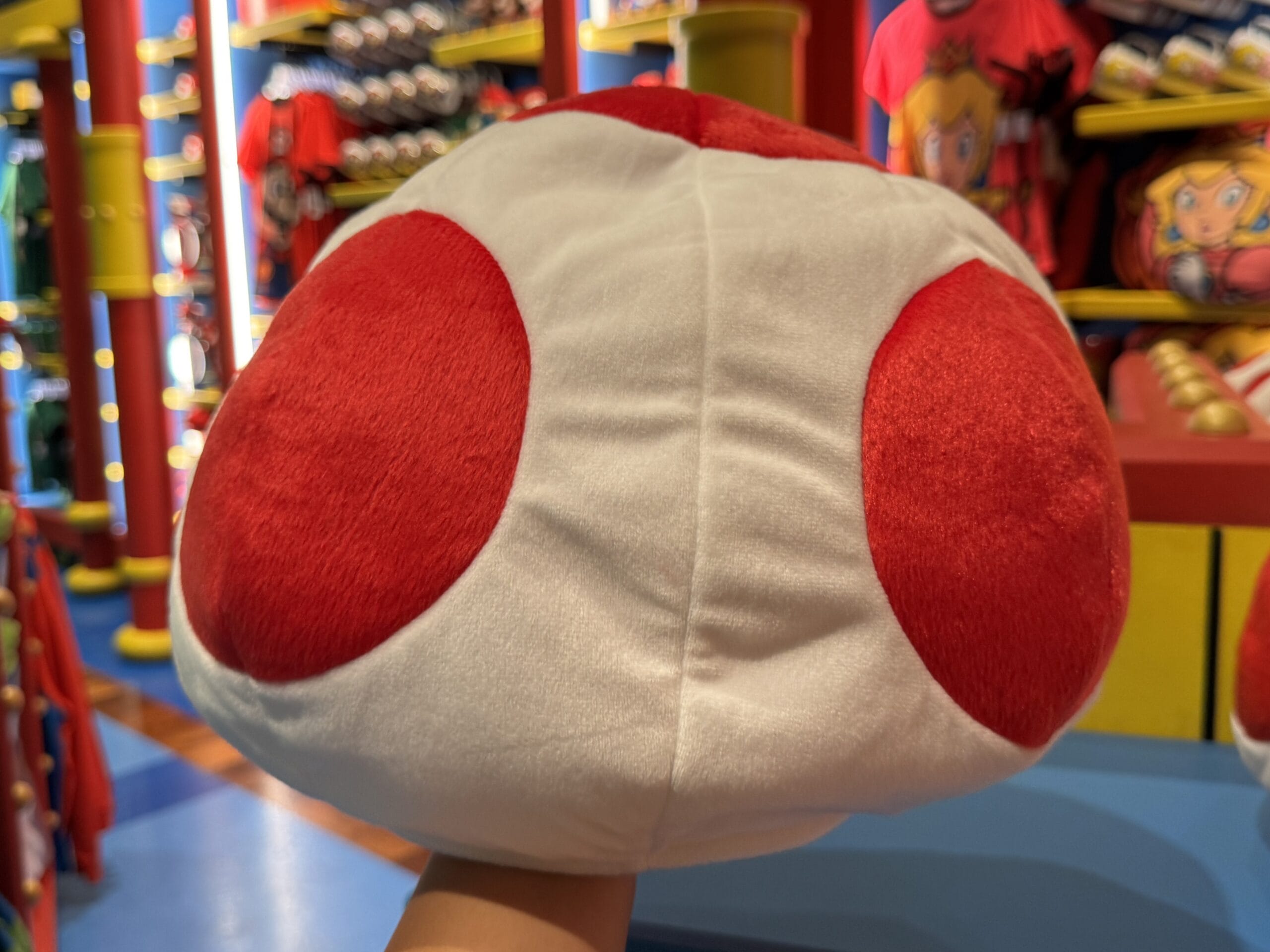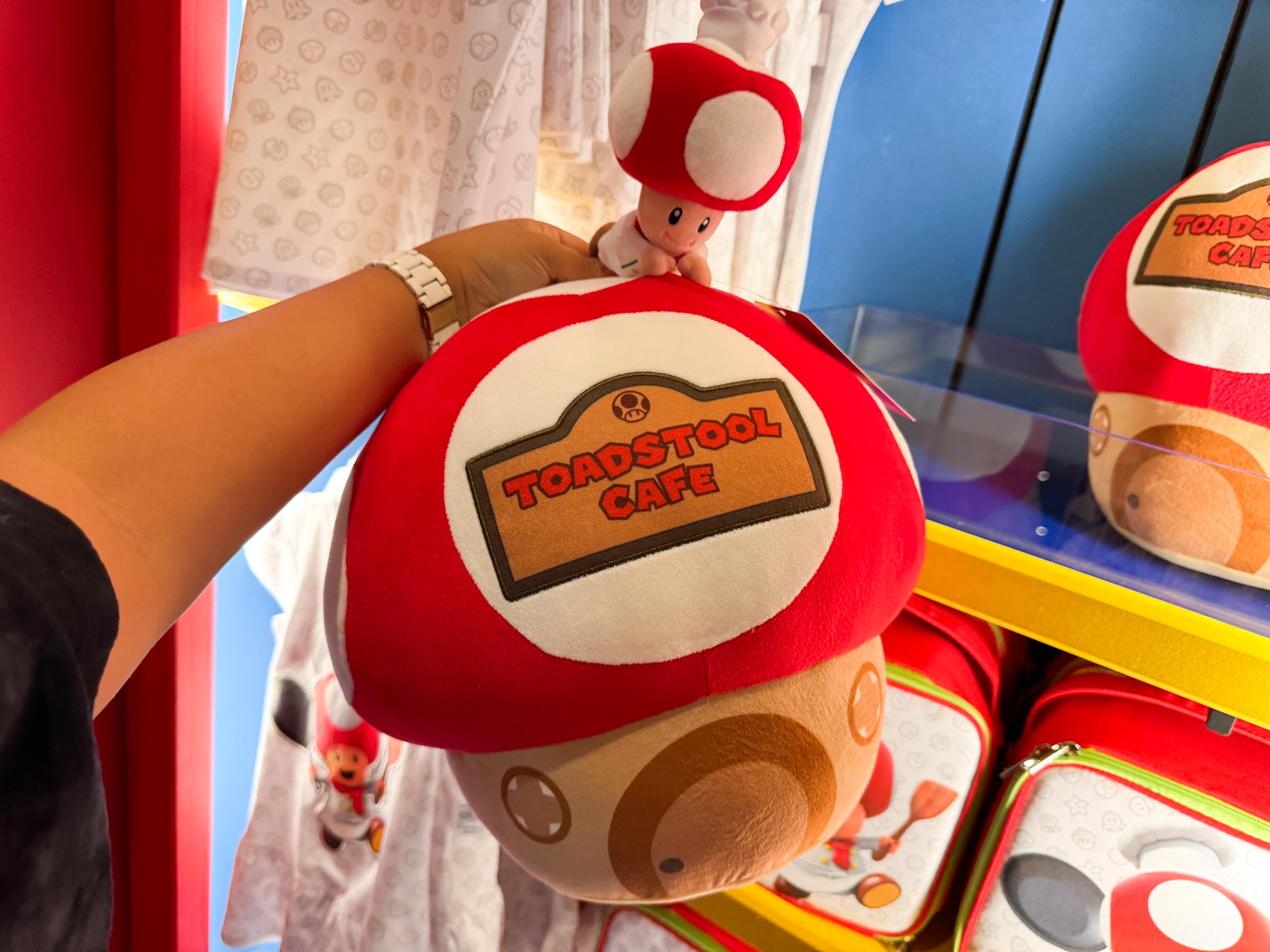 This is a large plush version of Toadstool Cafe, where guests can dine in Super Nintendo World. A small Chef Toad plush is attached to the mushroom roof.