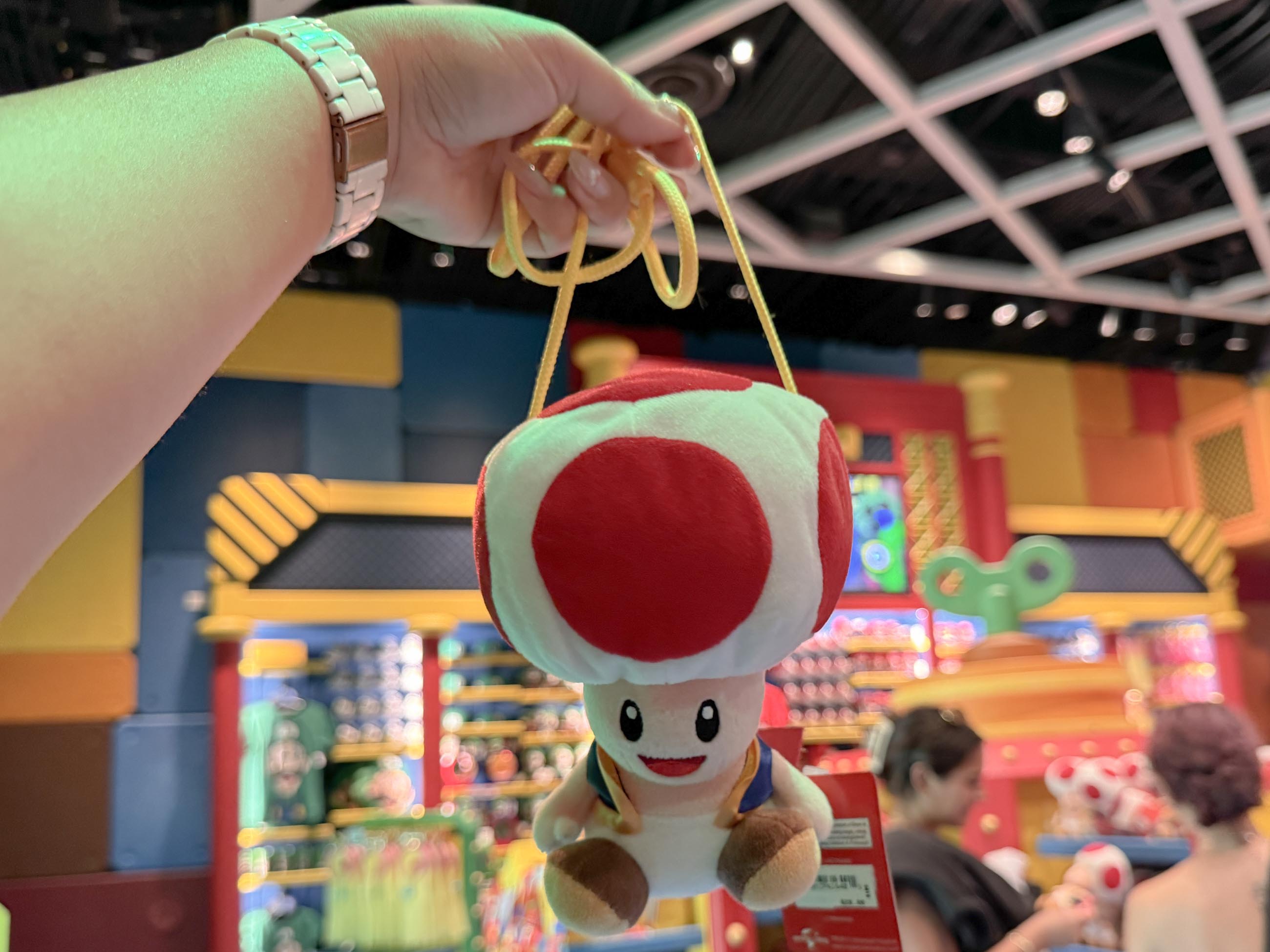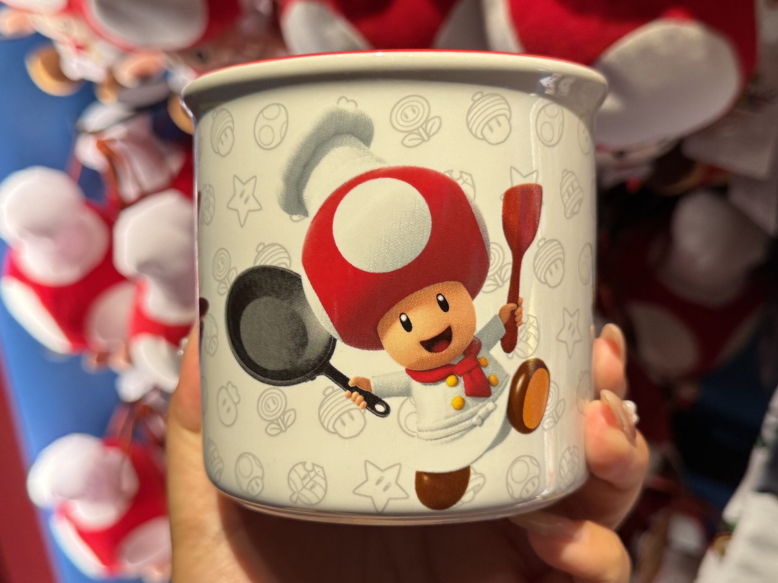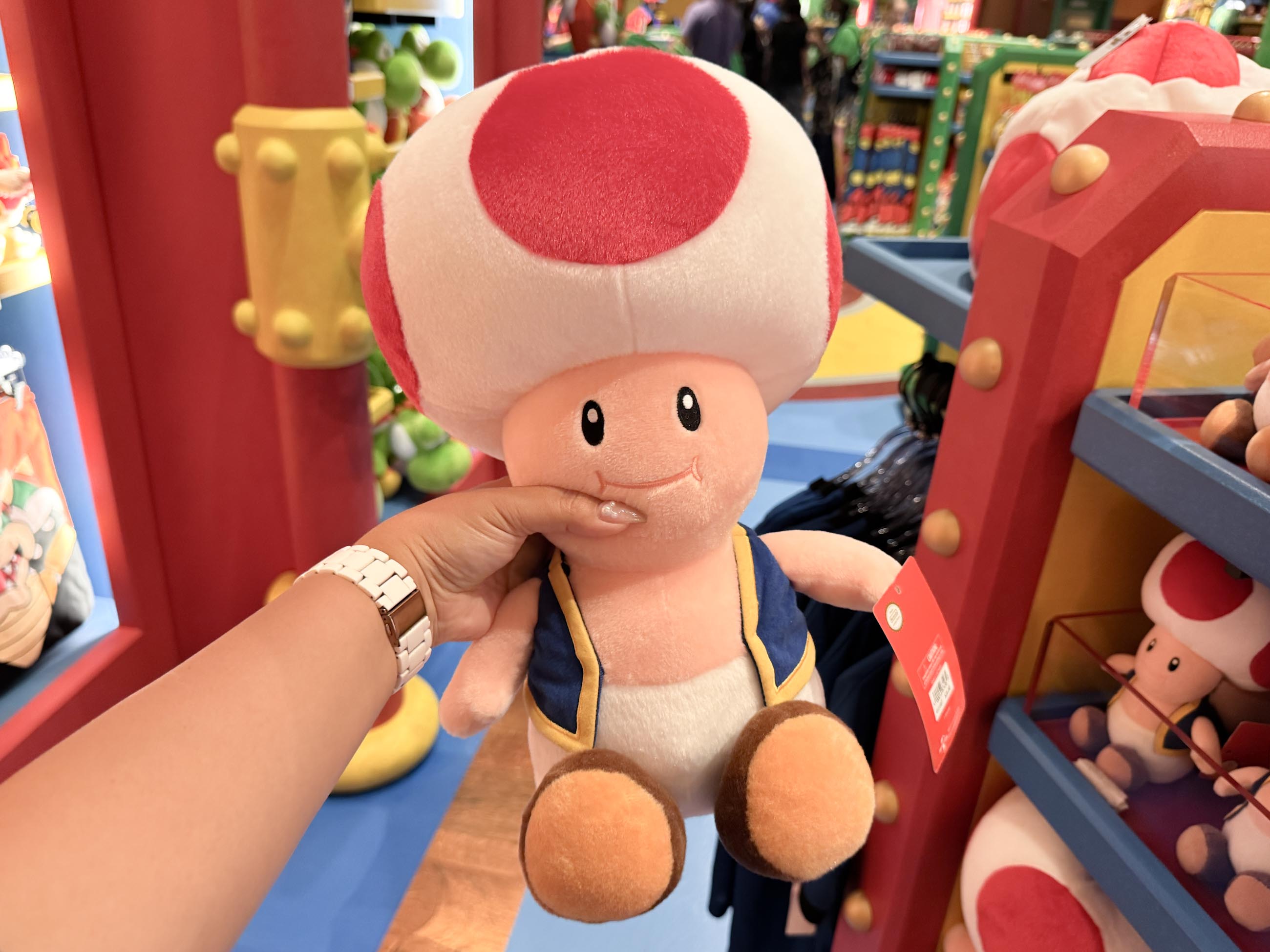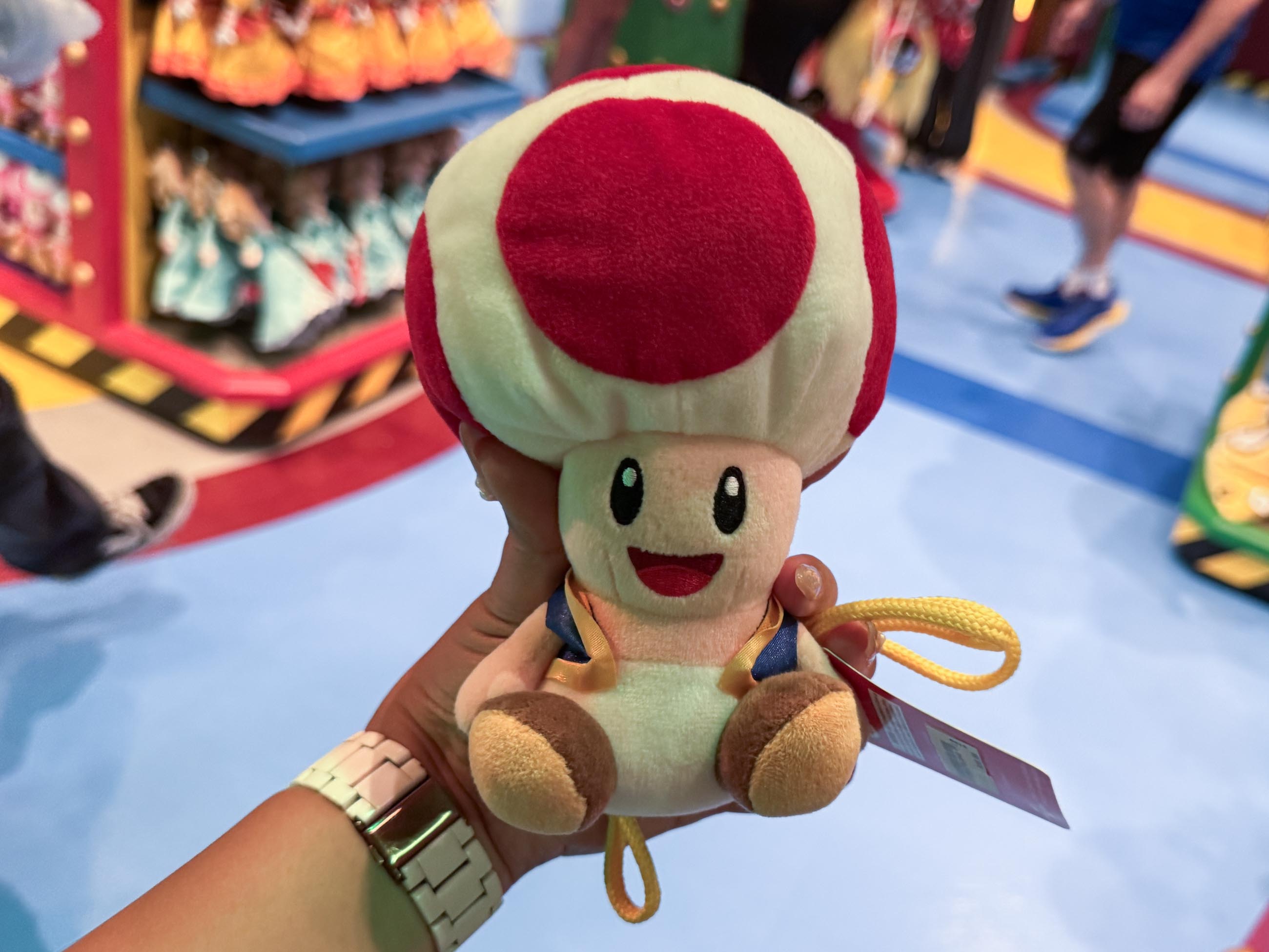 This is a large plush version of Toadstool Cafe, where guests can dine in Super Nintendo World. A small Chef Toad plush is attached to the mushroom roof.