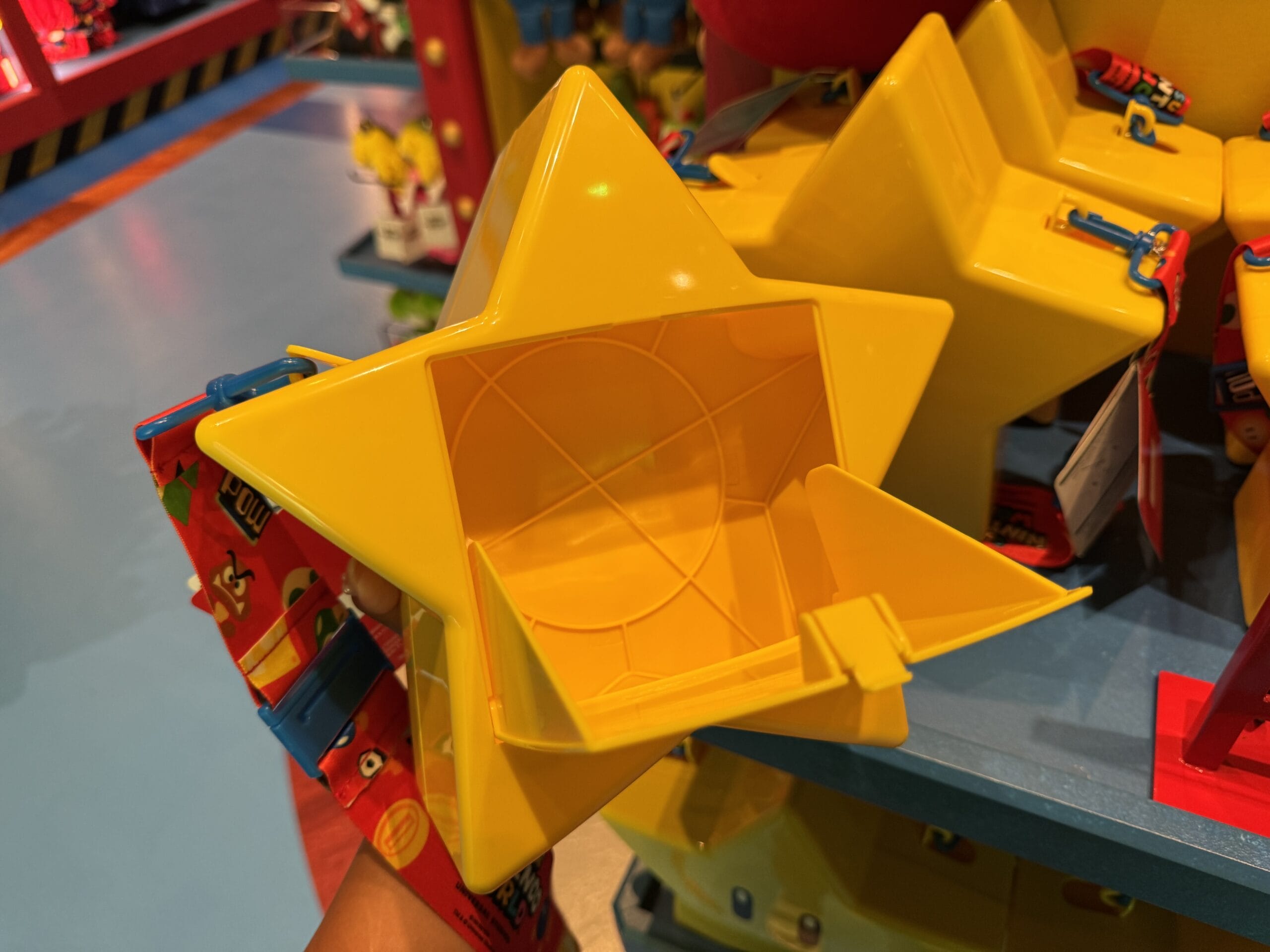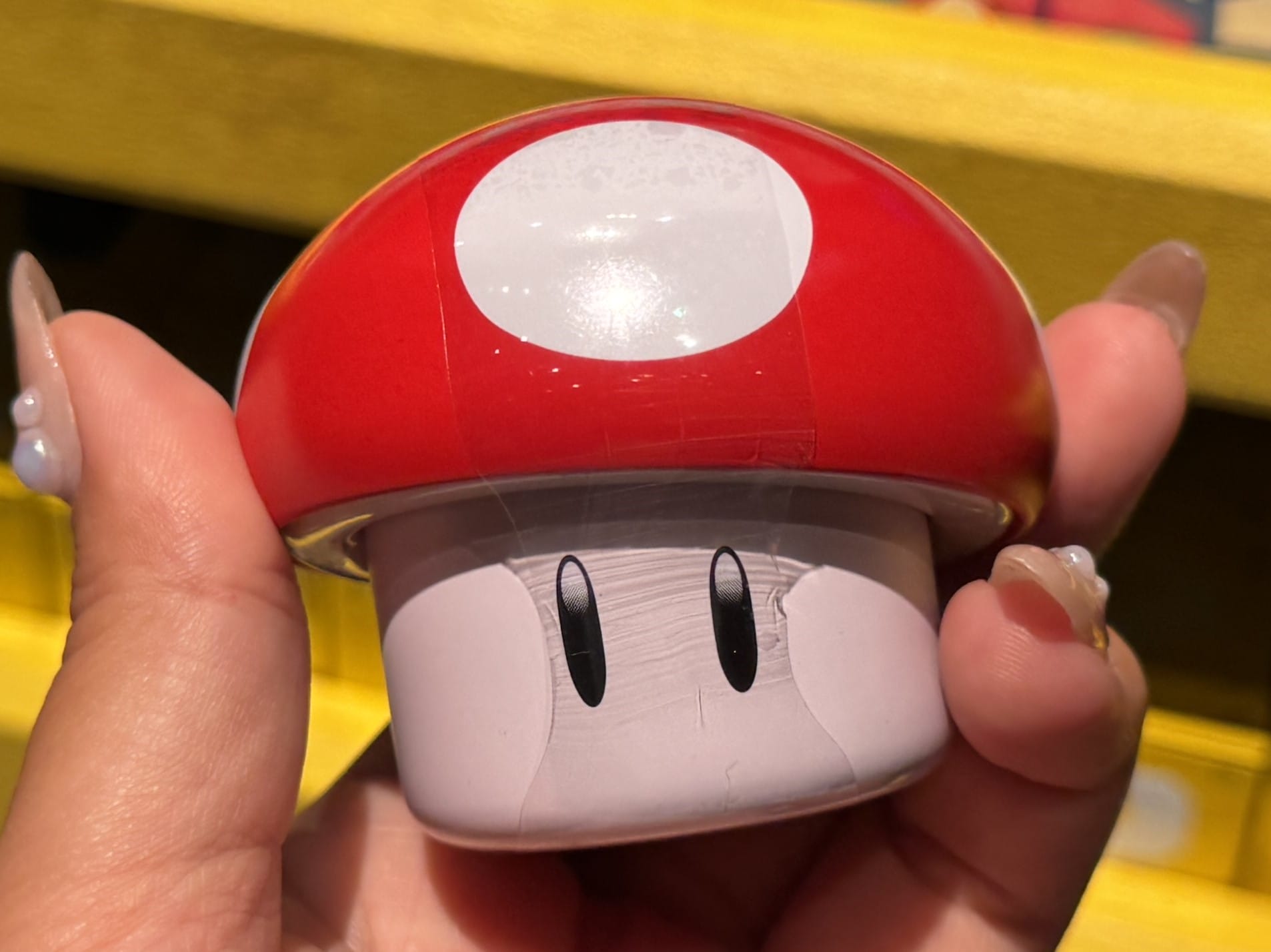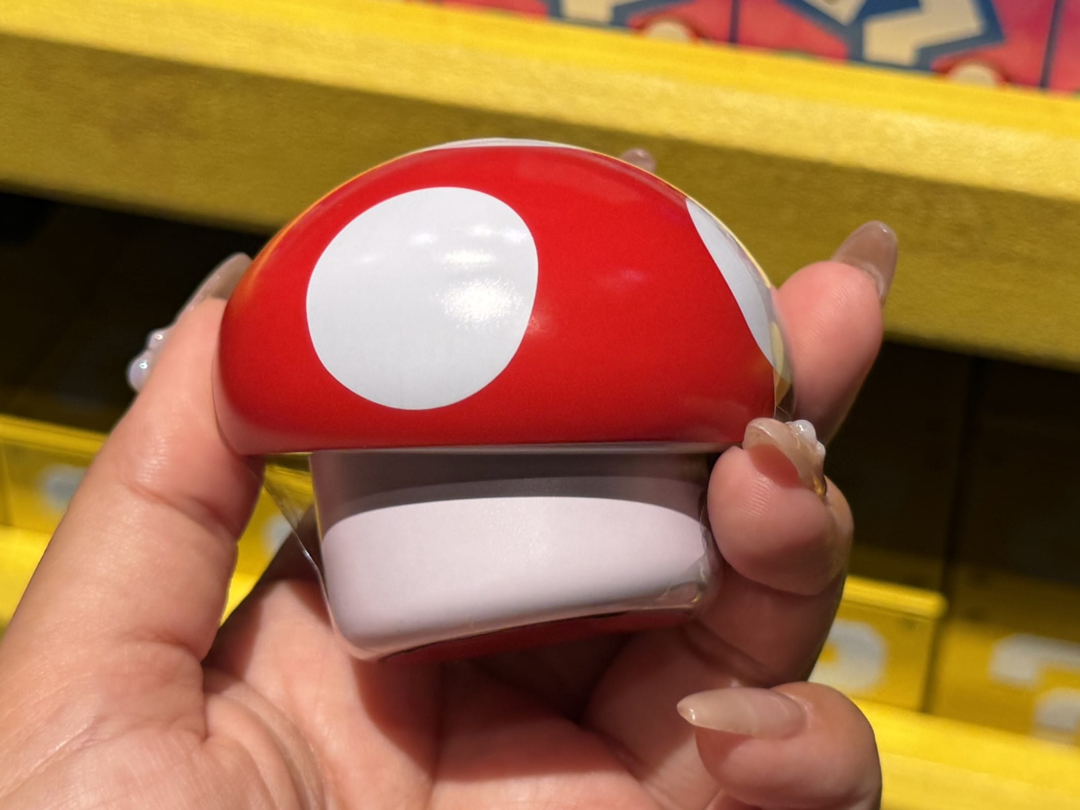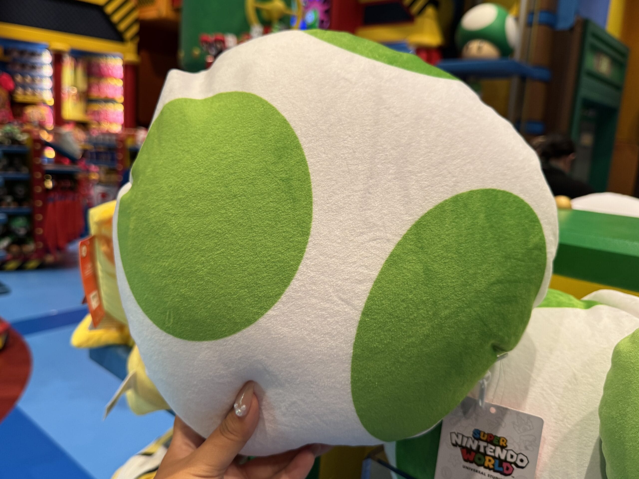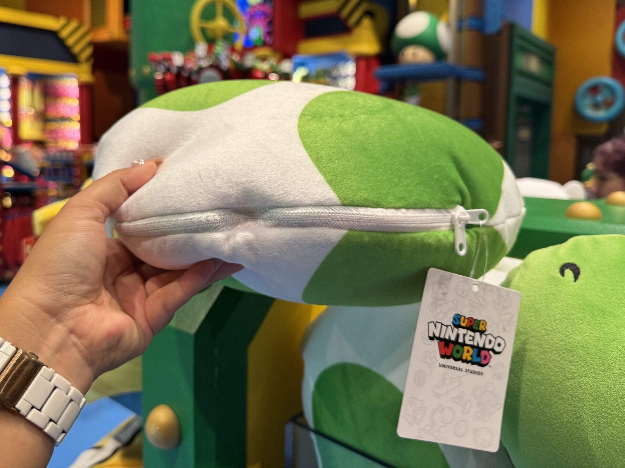 This is a large plush version of Toadstool Cafe, where guests can dine in Super Nintendo World. A small Chef Toad plush is attached to the mushroom roof.