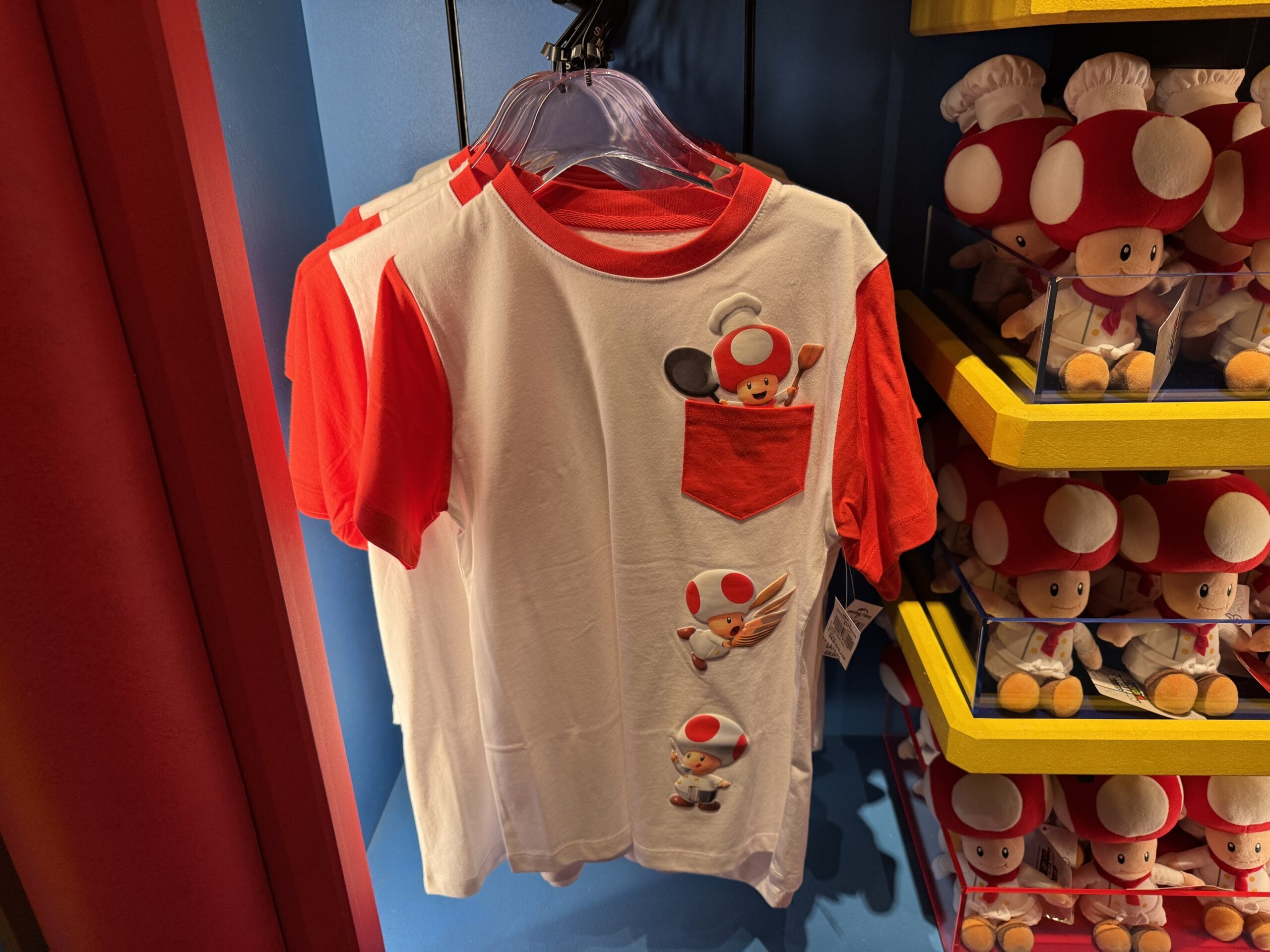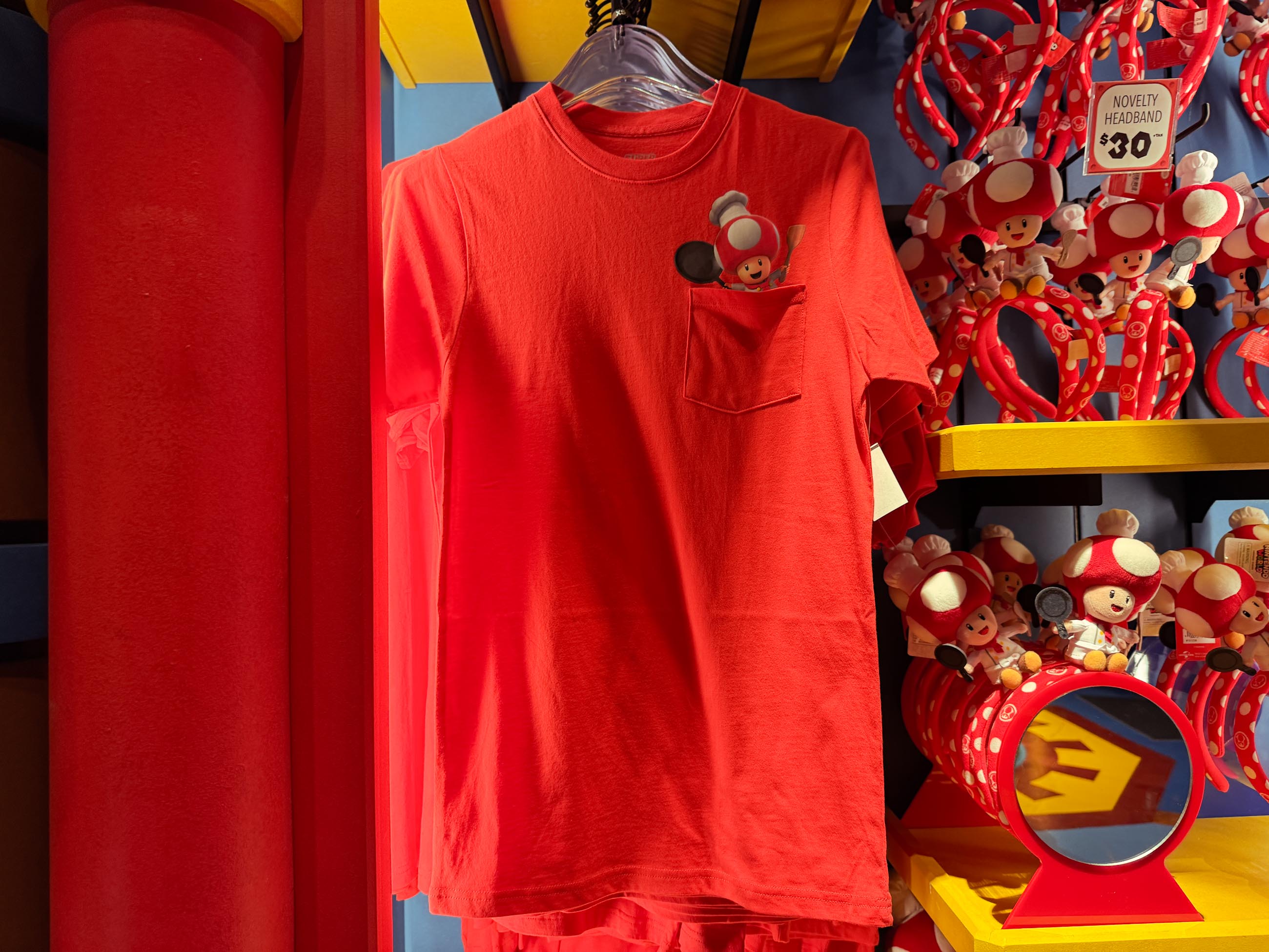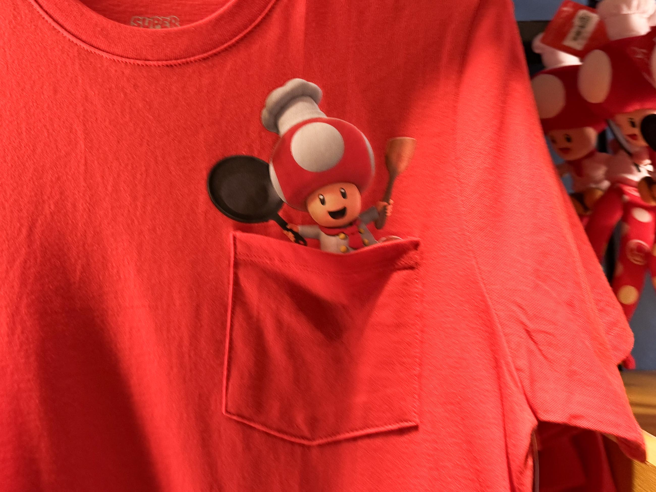 This is a red T-shirt with a left chest pocket. Chef Toad is pictured peeking out of the pocket, holding a frying pan and wooden spoon.