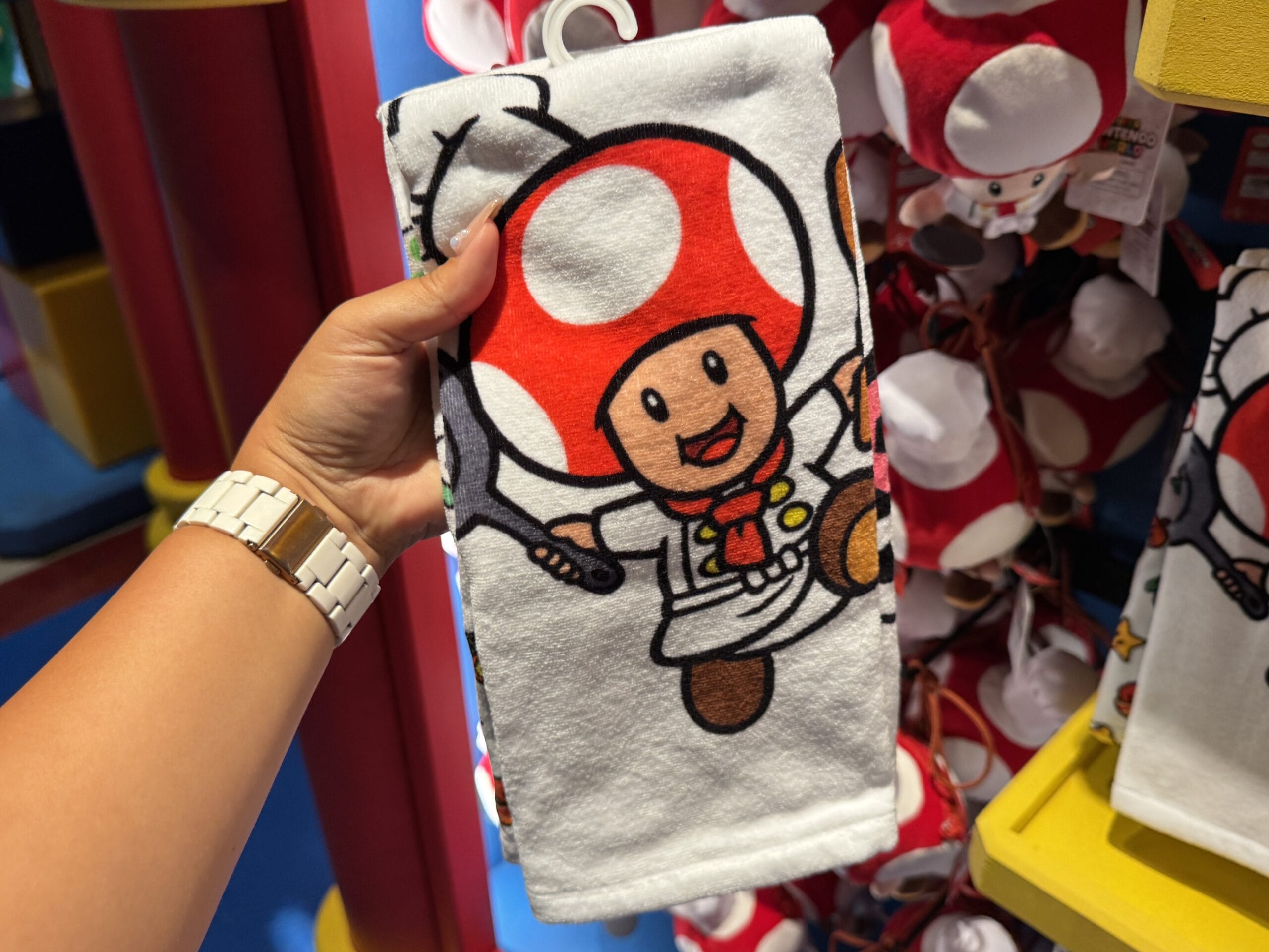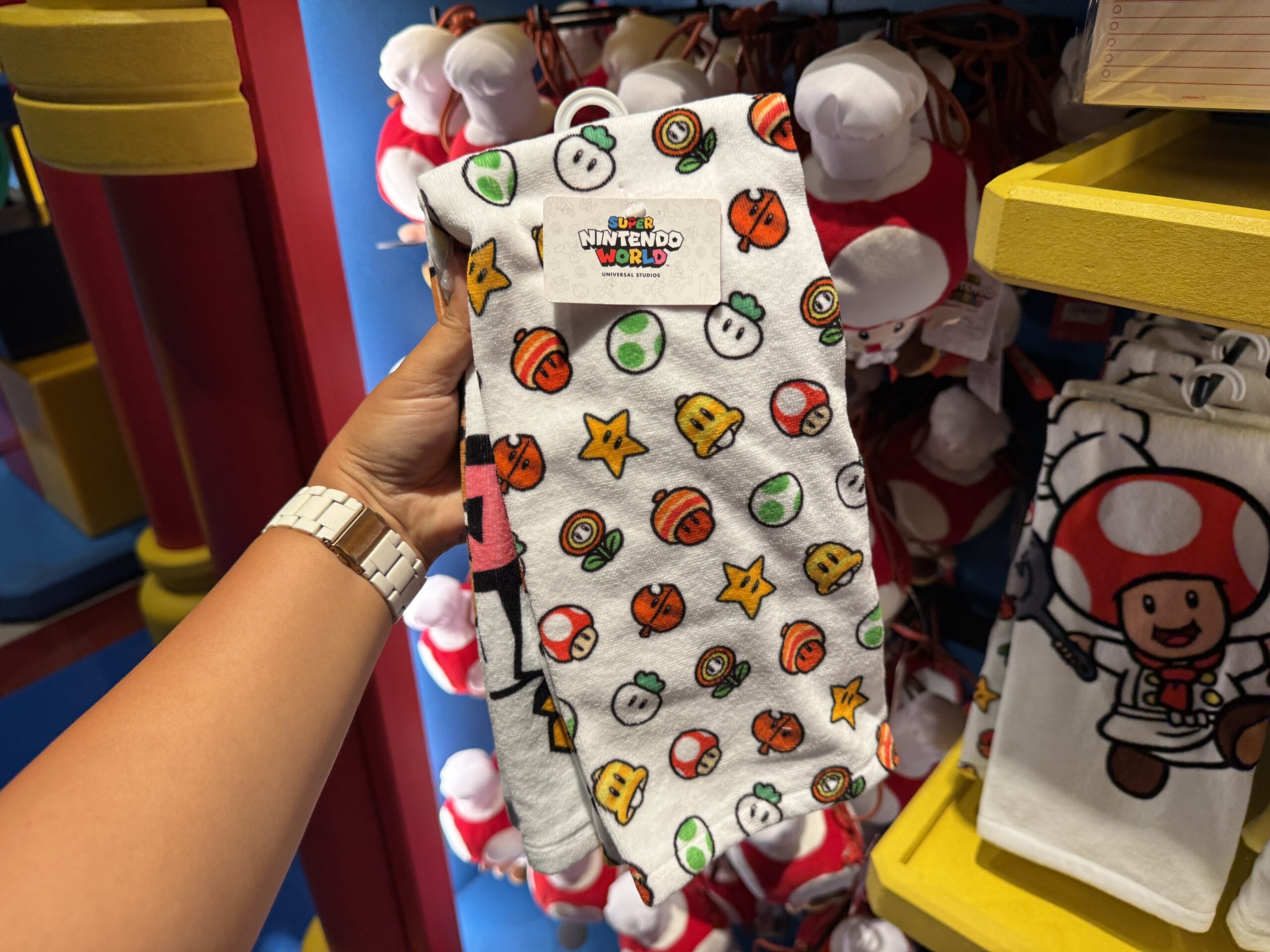 There are two towels in this set. One features a large image of Chef Toad. The other has a colorful pattern of Super Nintendo World icons including mushrooms, eggs, stars, and bells.