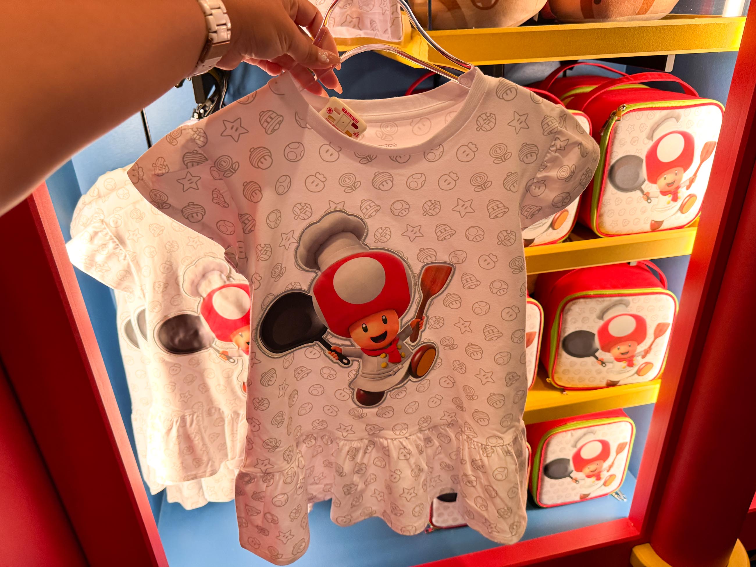 This is a white dress with a frill skirt and puffy short sleeves. Chef Toad is on the chest, against a pattern of Super Nintendo World icons.