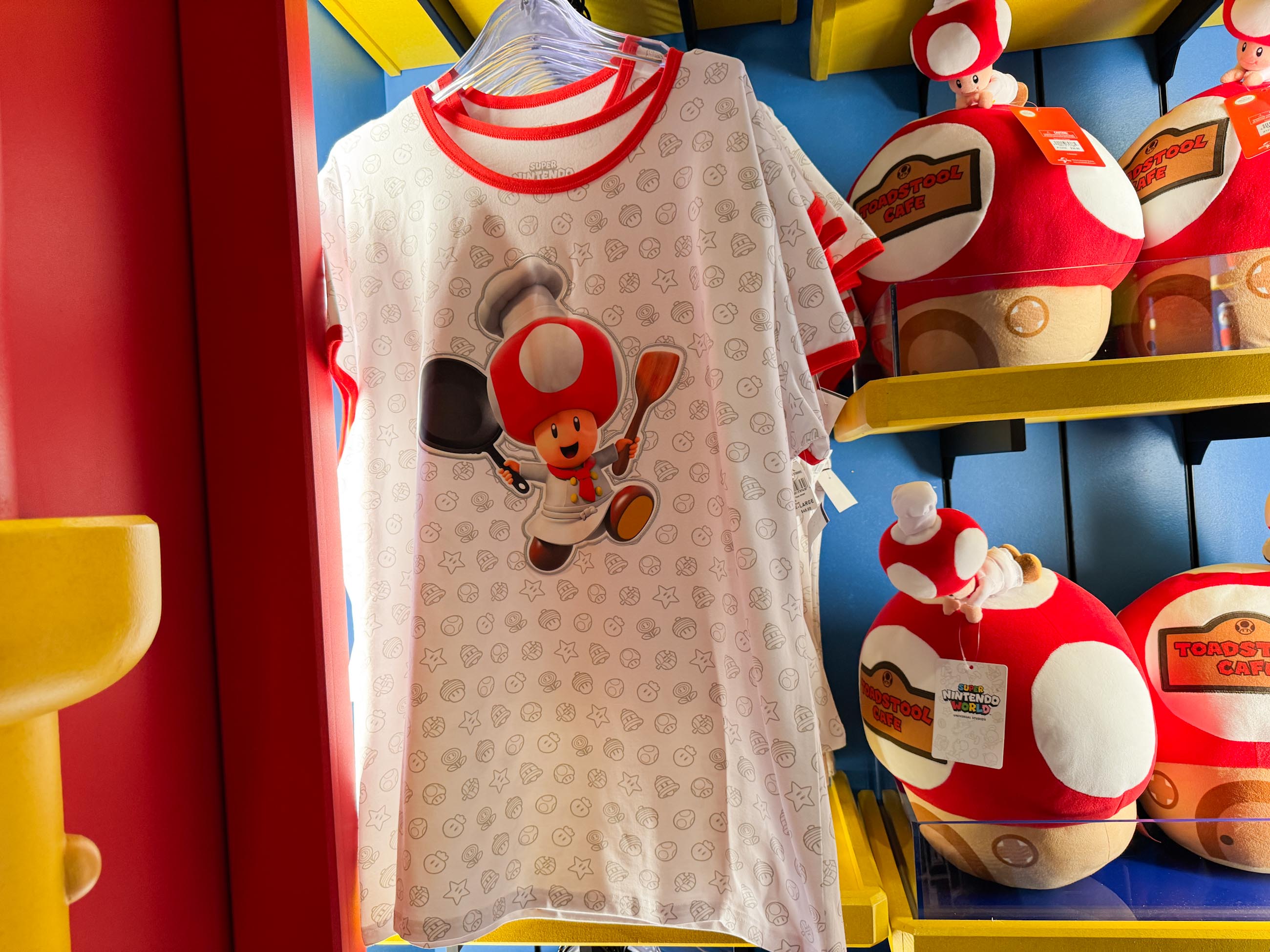 The same artwork of Chef Toad is blown up on the chest of this tee. The rest of the shirt is patterned with small Super Nintendo World icons. It has red trim on the neck and cuffs.