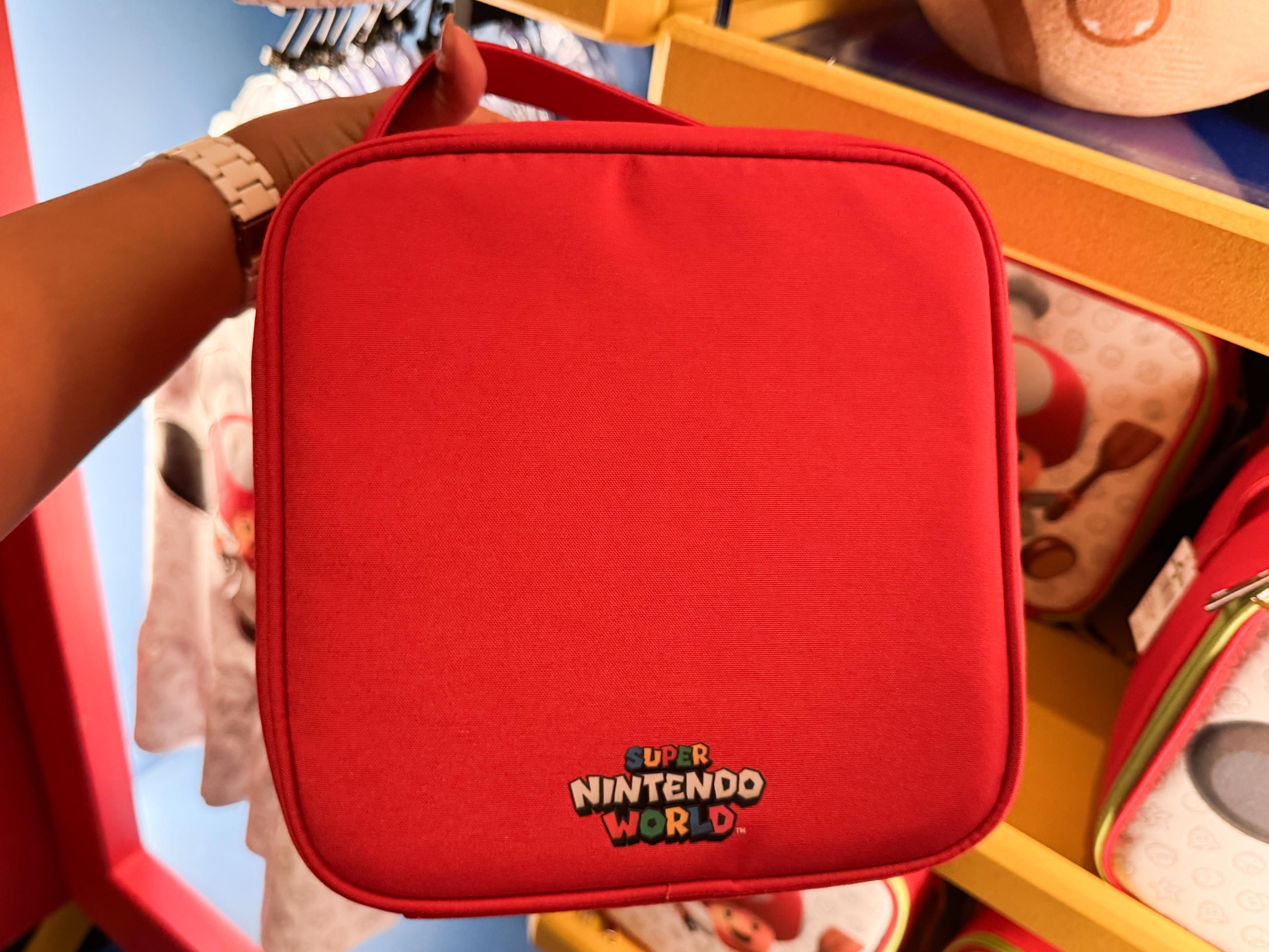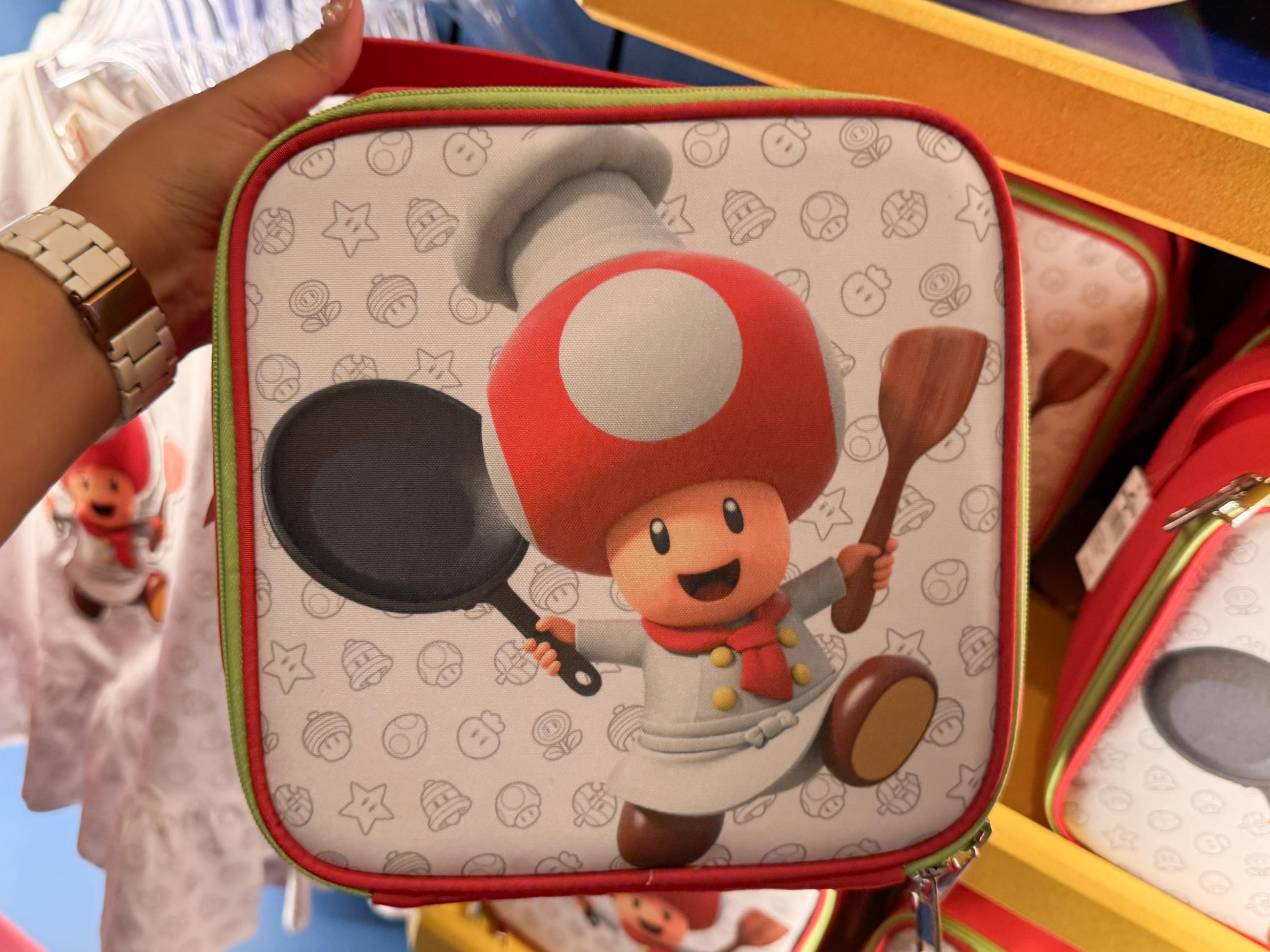 Chef Toad is pictured against the icons pattern on one side of this lunch box. The other side is red with the Super Nintendo World logo. It has red piping trim and a green zipper. A red handle is on top.