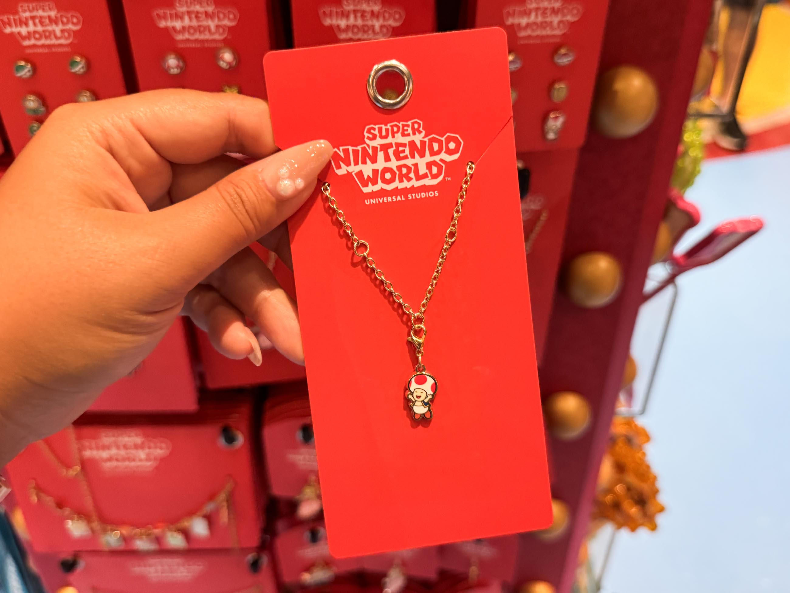 Toad is pictured against a dark blue spotted background on a charm hanging from a gold coin.