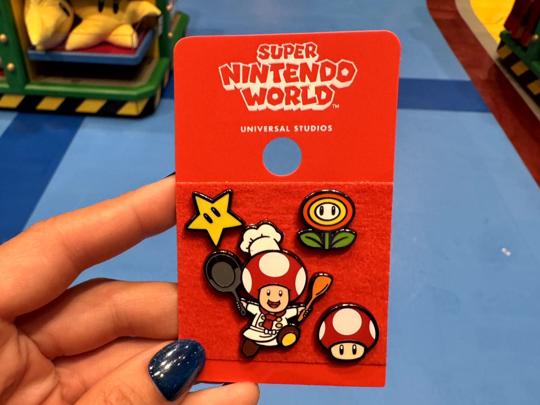 This set includes four pins. The largest is Chef Toad. The other three are a Super Star, Fire Flower, and mushroom.