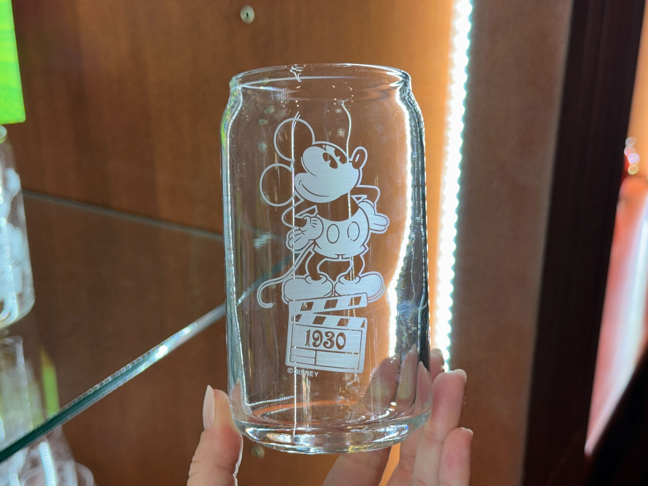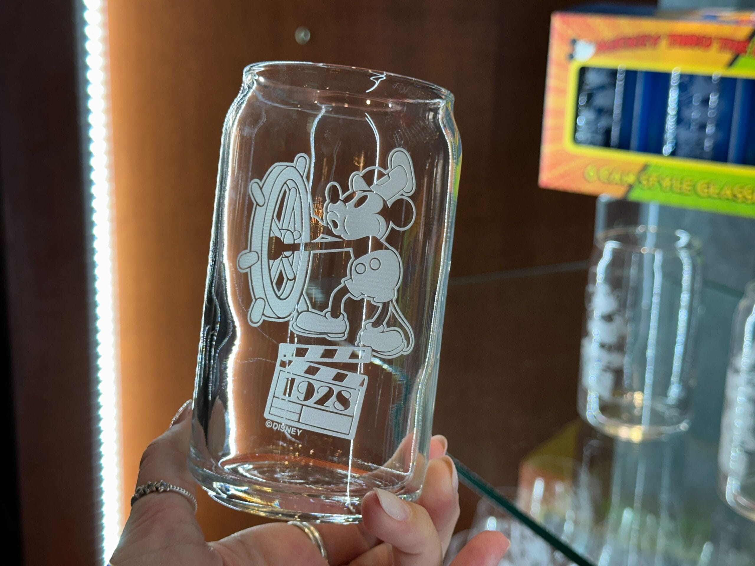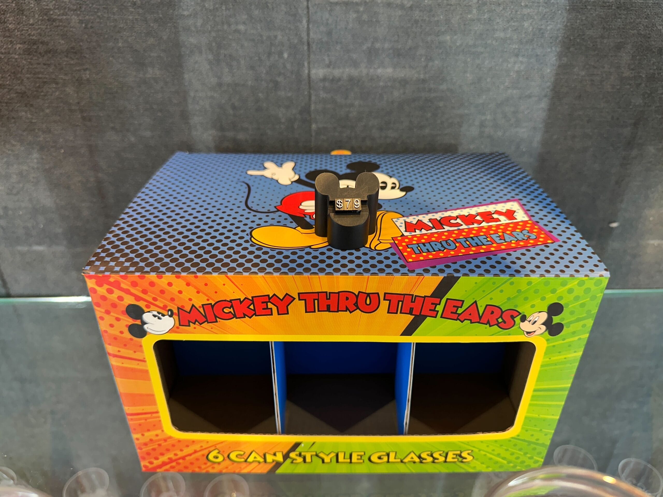 A set of six can-style glass tumblers is now available at Walt Disney World. All six glasses are inspired by Mickey Mouse designs through the “ears.”
