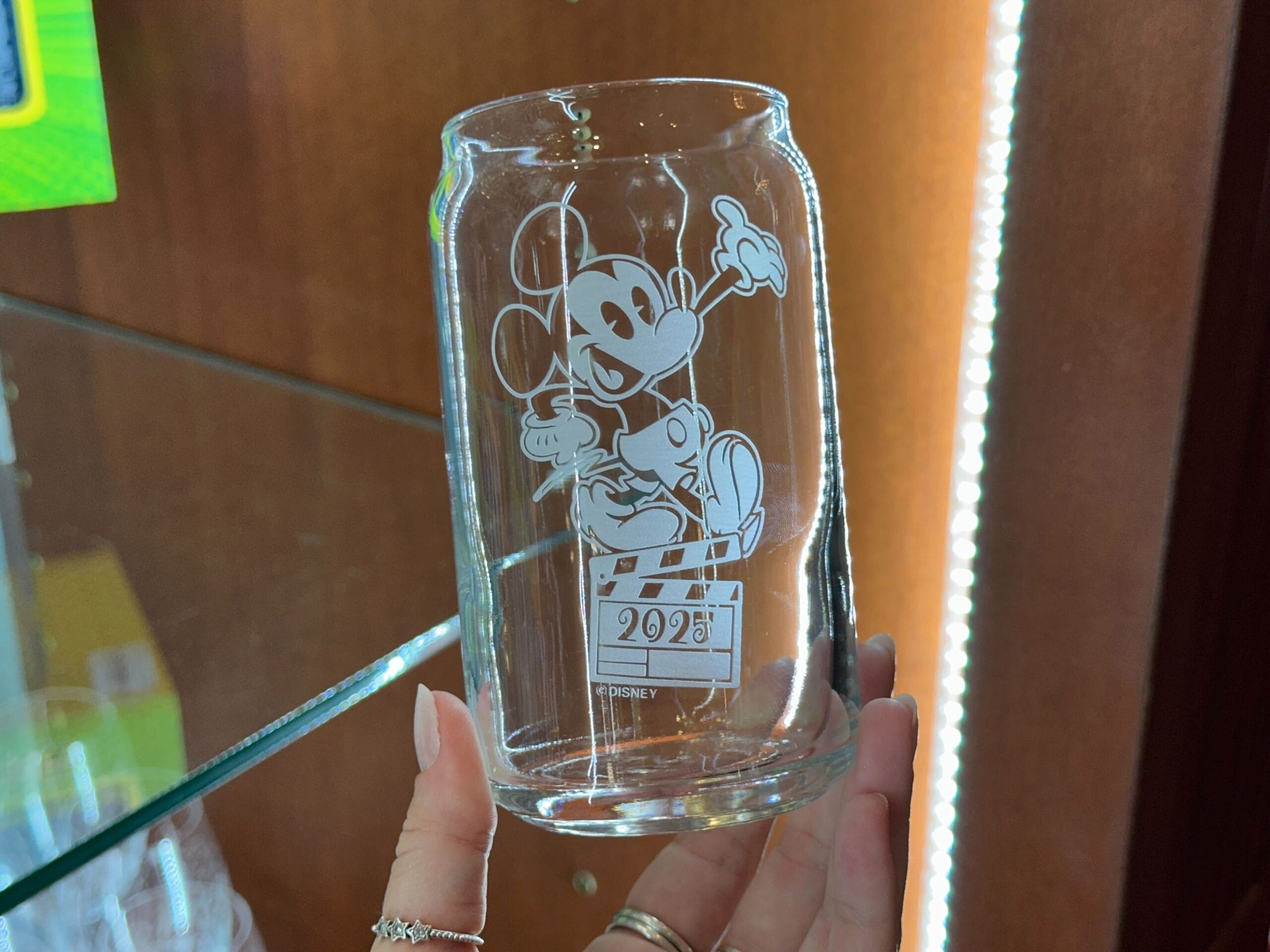 Each cup is etched with a style of Mickey Mouse matching the year on a director’s clapperboard. The first is a 1928 version of Steamboat Willie.