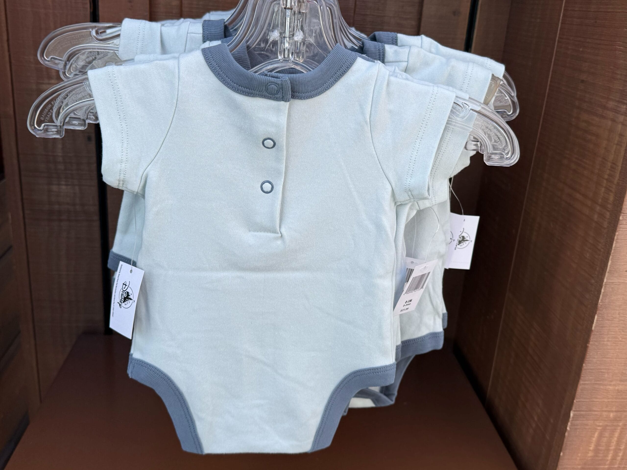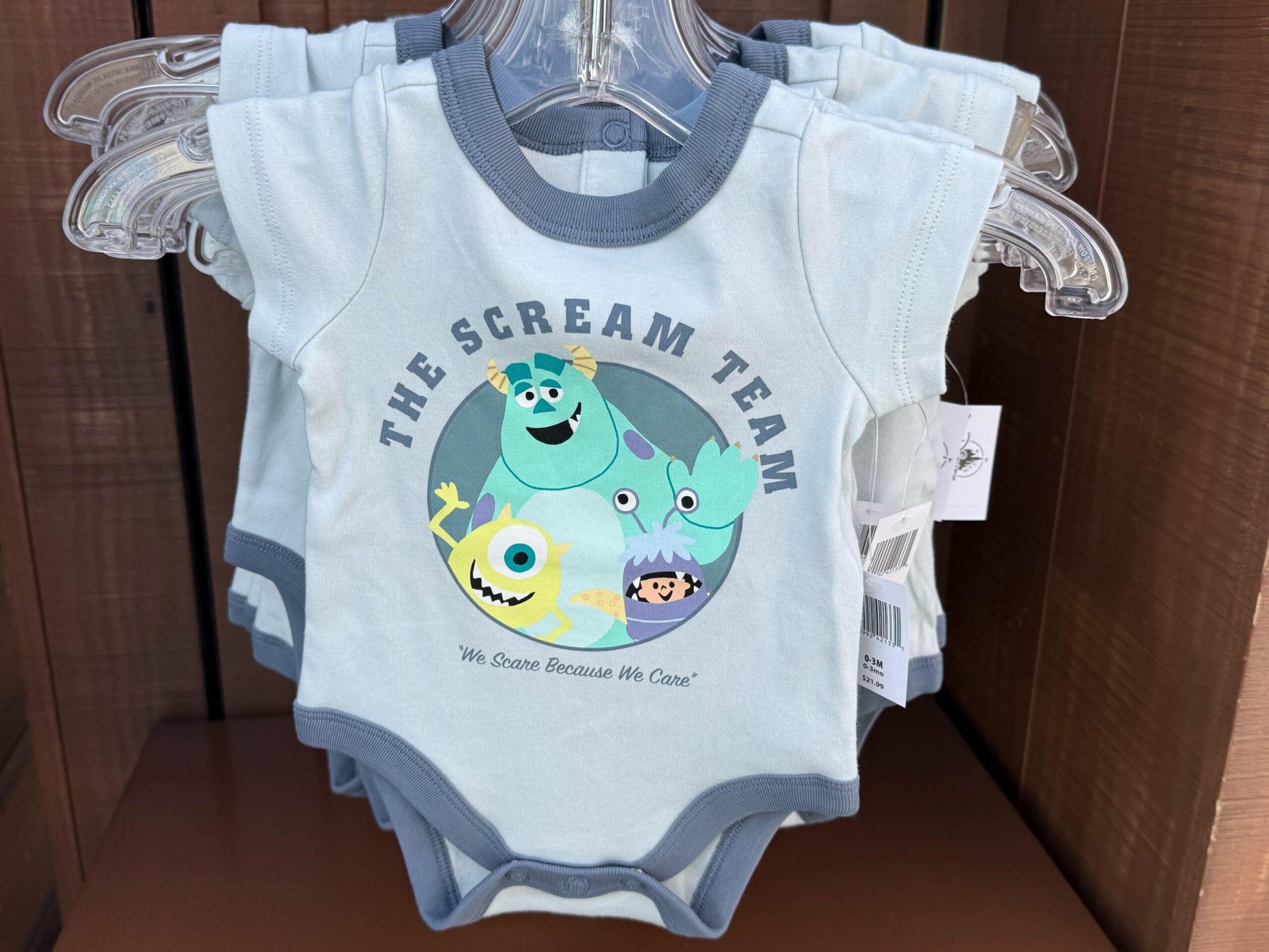 Our Disneyland reporter found a Monsters, Inc. baby onesie at Studio Store. The pale blue onesie has gray on the collar, as well as on the bottom part of the onesie, where it fits around the legs.