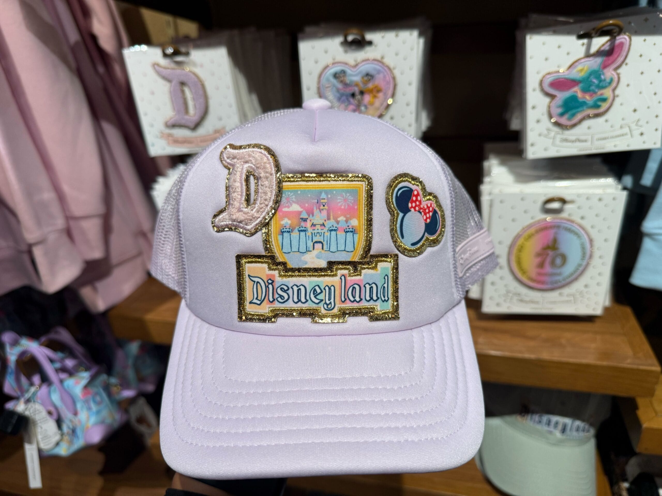 This hat by Stoney Clover is lilac with four overlapping patches on the front. They depict a fuzzy pink D, Sleeping Beauty Castle, the Disneyland marquee, and a Minnie Mouse ear headband. Each patch has a gold sequin border.