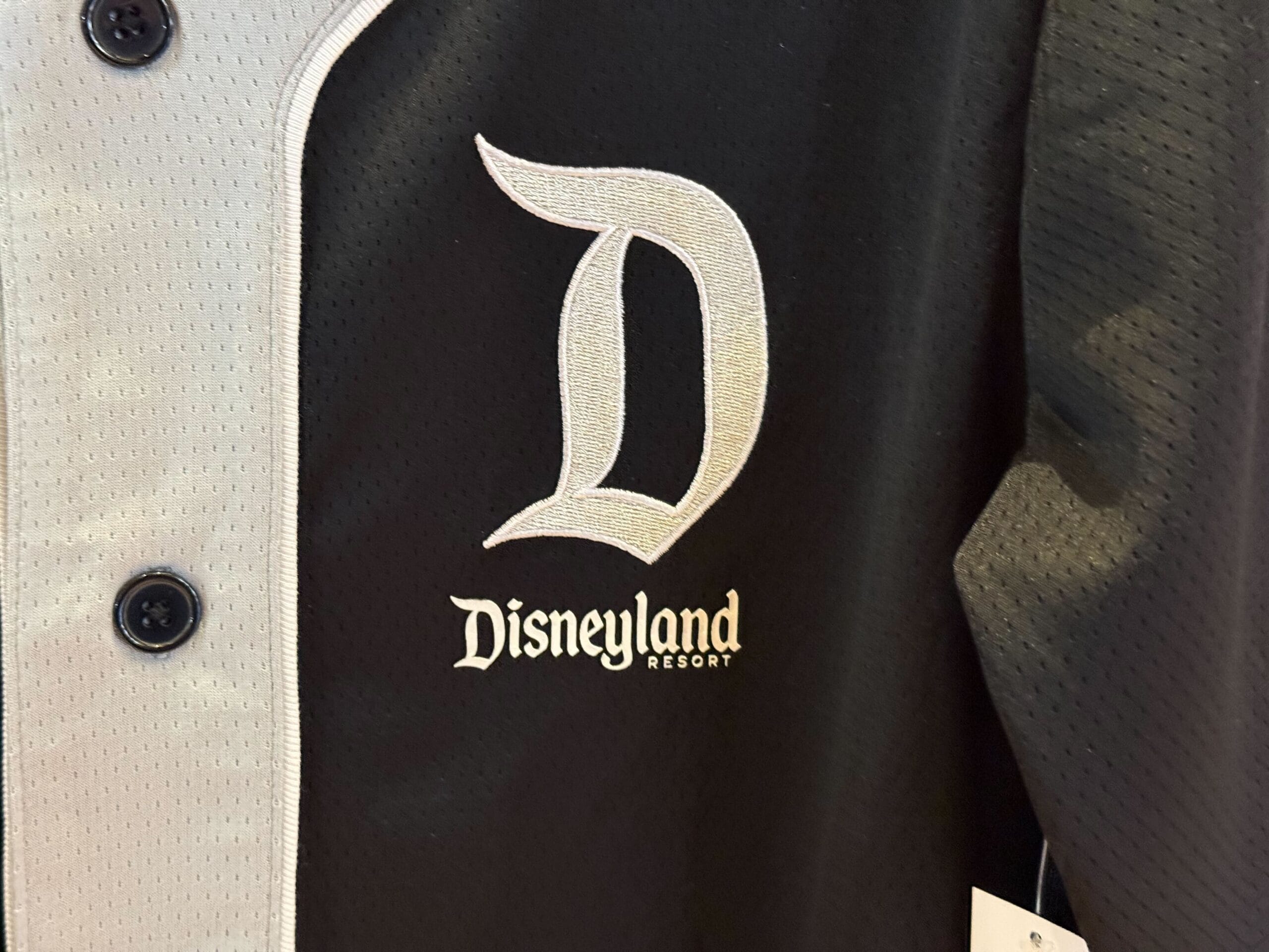This jersey is black with gray trim on the cuffs, neck, and chest. It has black plastic buttons. The D logo and Disneyland Resort wordmark are in gray on the left chest.