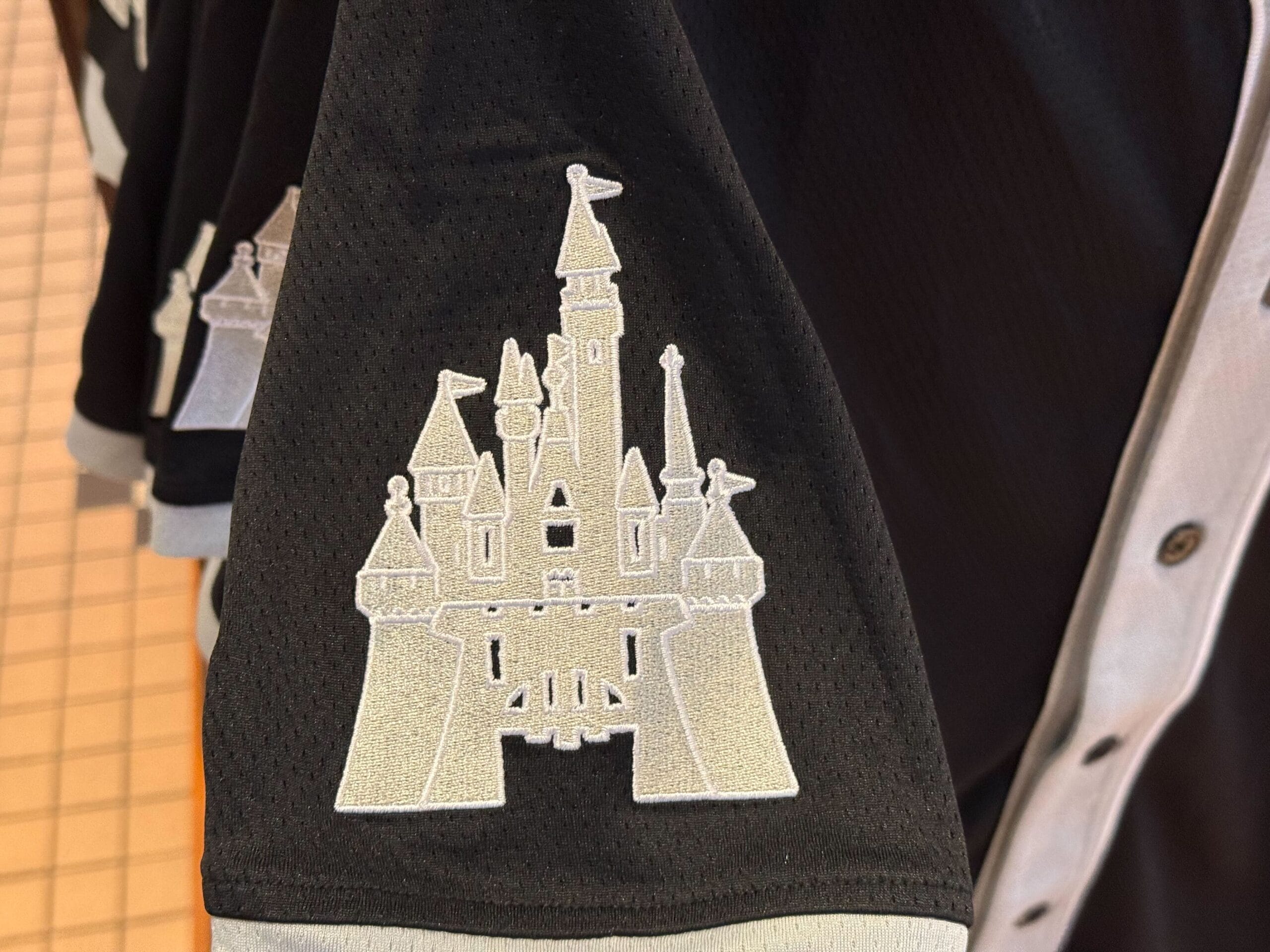 A gray depiction of Sleeping Beauty Castle is on the right sleeve with white embroidered borders.