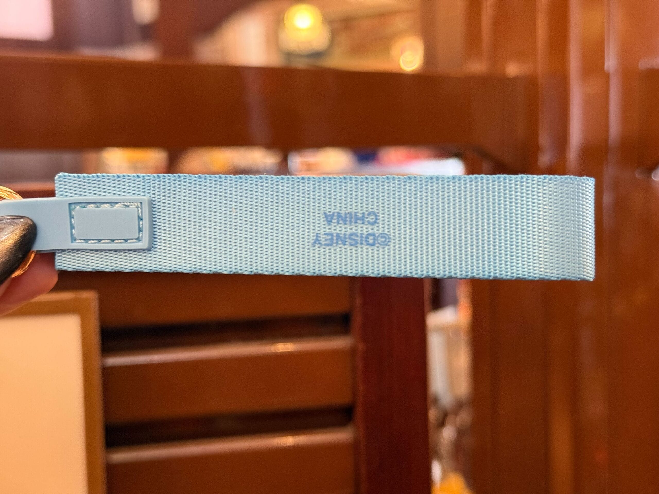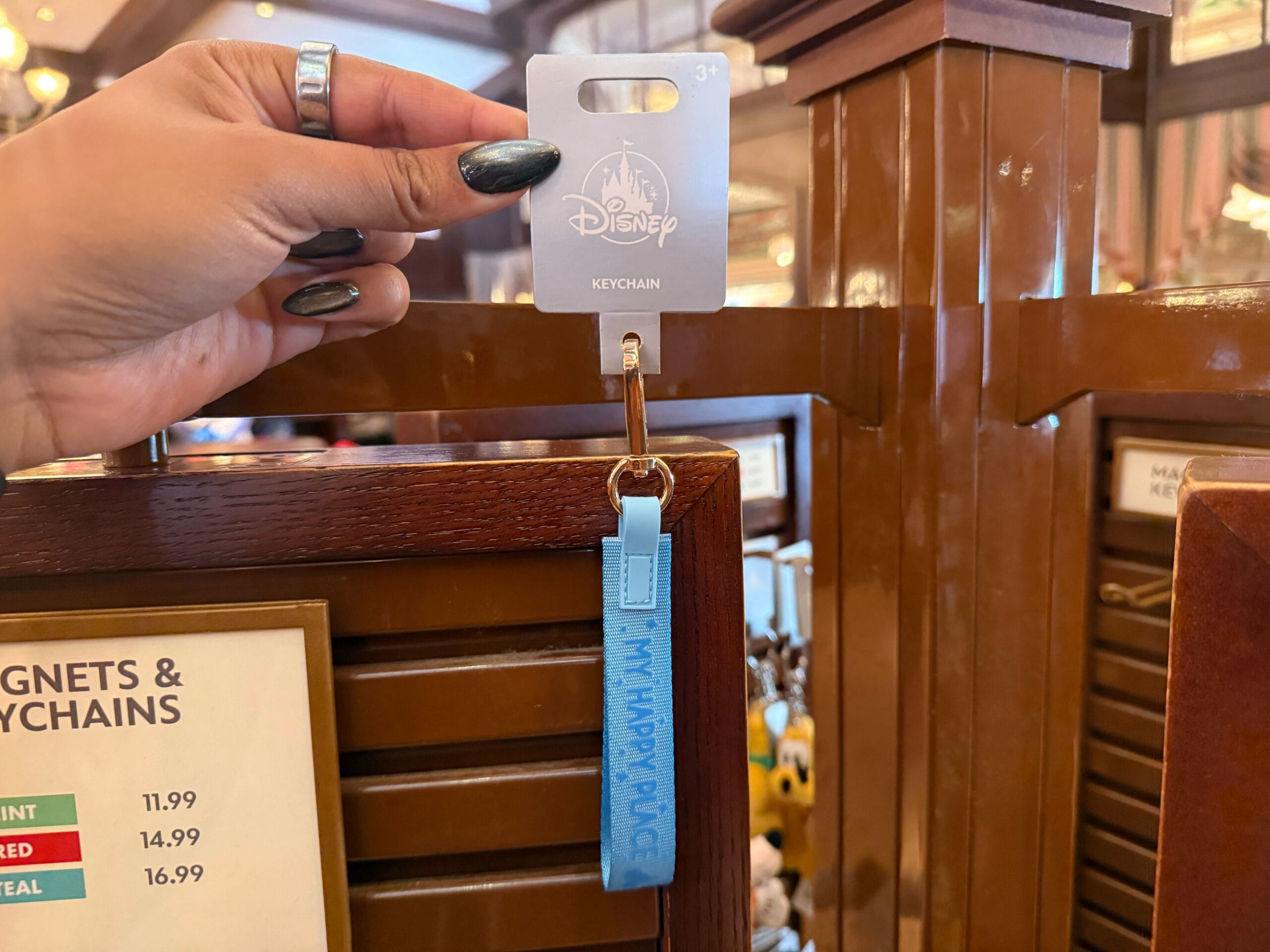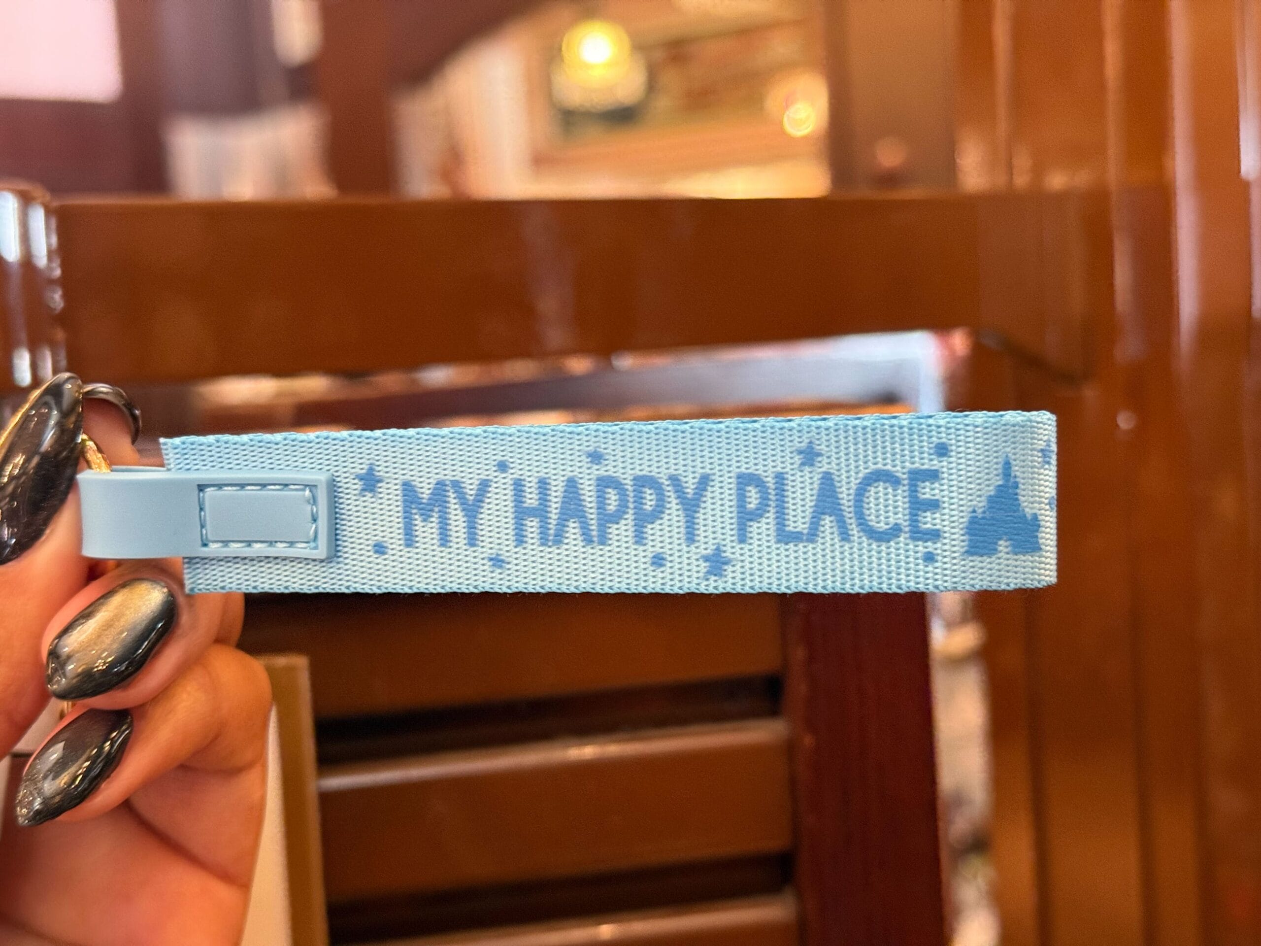 This keychain is a gold-tone lobster clip with a light blue wrist strap. On the strap are stars and the castle’s silhouette next to “My Happy Place.”