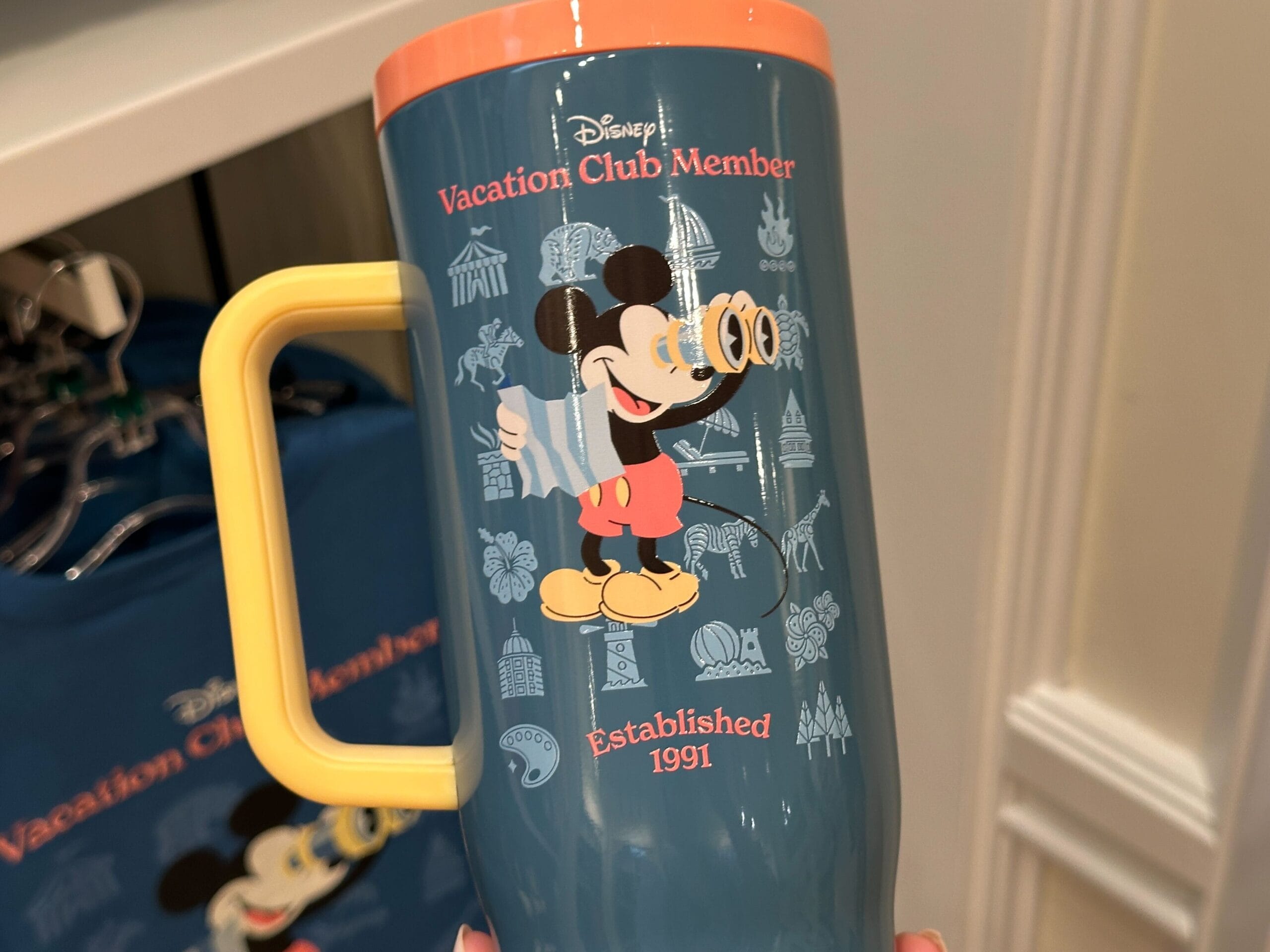 The blue Corkcicle travel tumbler features Mickey with his binoculars and map in front of the DVC Member Resort logos in light blue. The text “Disney Vacation Club Member” is printed above Mickey, with “Established 1991” below.