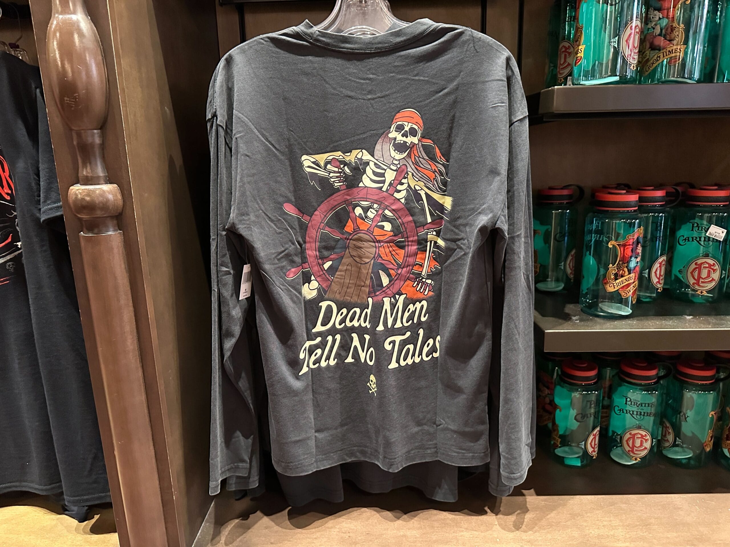 The skeleton is on the back of the long-sleeved black tee, appearing to steer a ship despite his lack of flesh. “Dead Men Tell No Tales” is in bone white lettering below the artwork, along with a skull and crossbones.