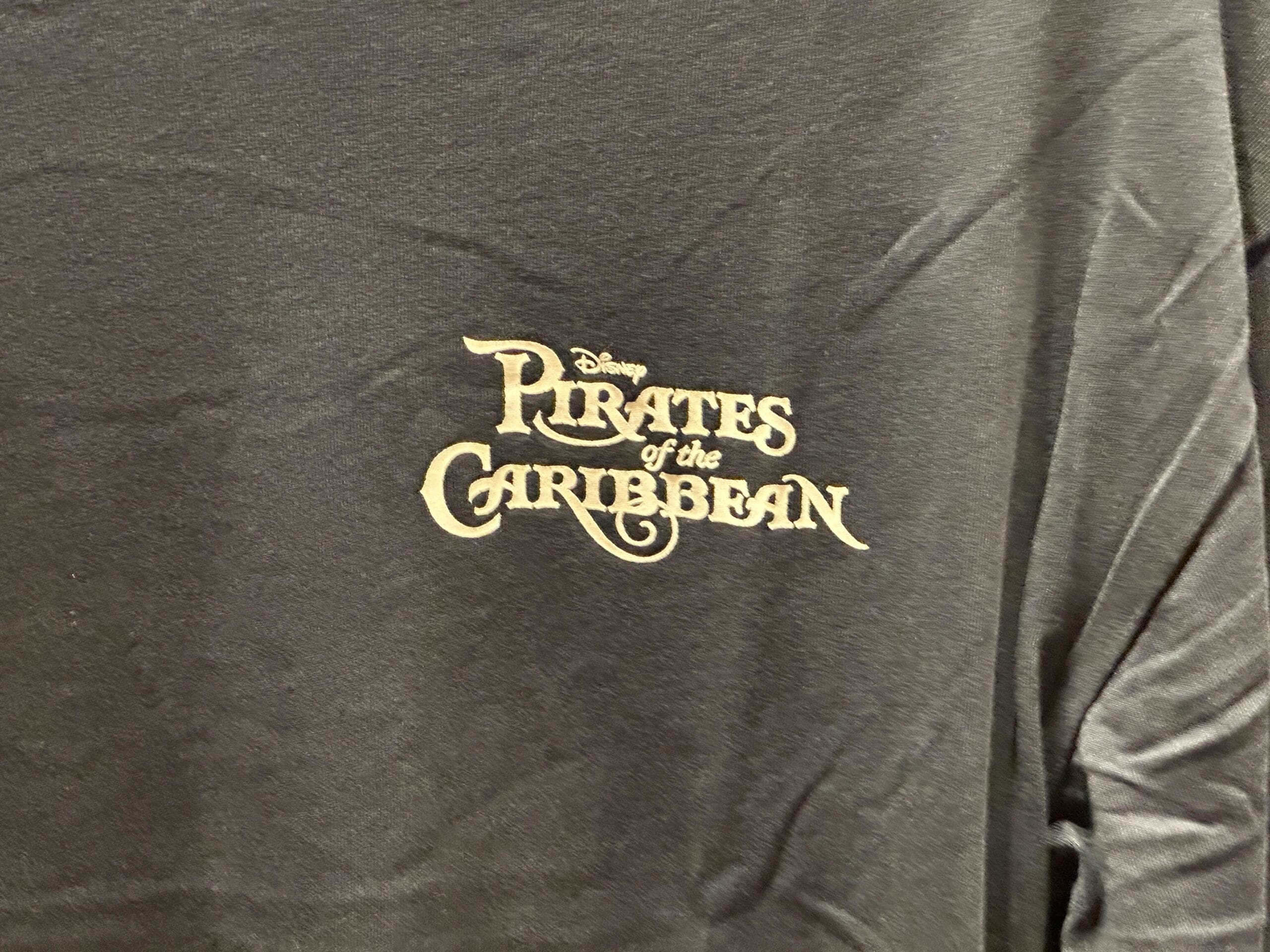The Pirates of the Caribbean wordmark is in white on the left chest.