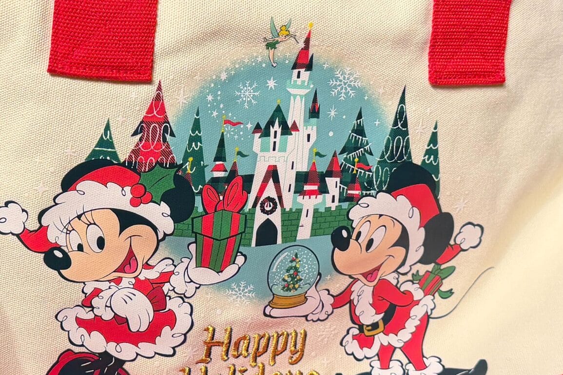 On the front of the zippered tote are Minnie and Mickey in the festive red and white holiday wear. Both Minnie and Mickey are holding a green and red package for the other, while Mickey is also holding a holiday tree snowglobe in his other hand.