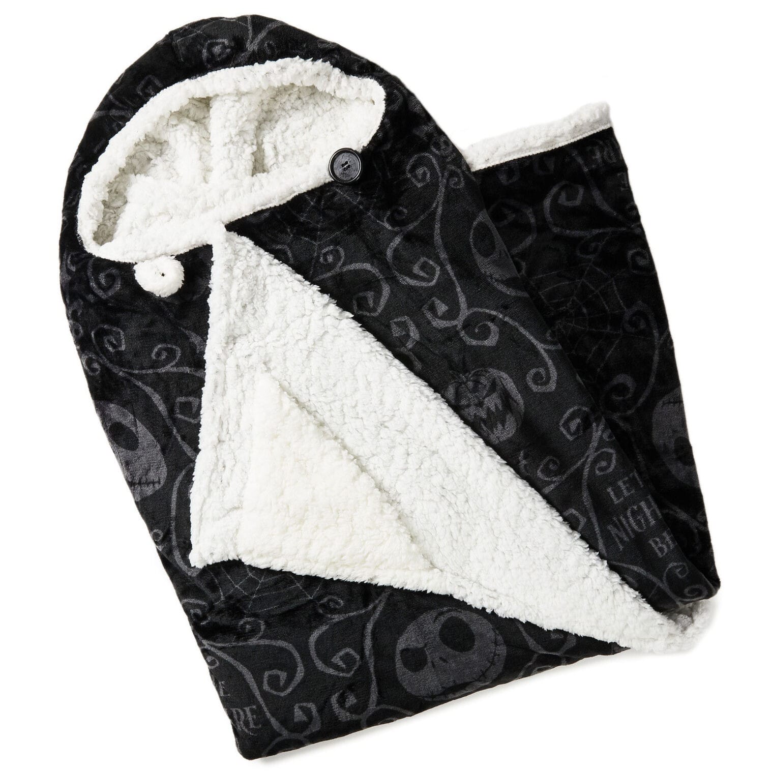 This is a sherpa-lined fleece blanket with a hood, corner pockets, and a button closure with a loop. “Let the nightmare begin”, Jack’s face, jack-o’-lanterns, and spiderwebs are patterned on the exterior. It’s 70″ x 50″.