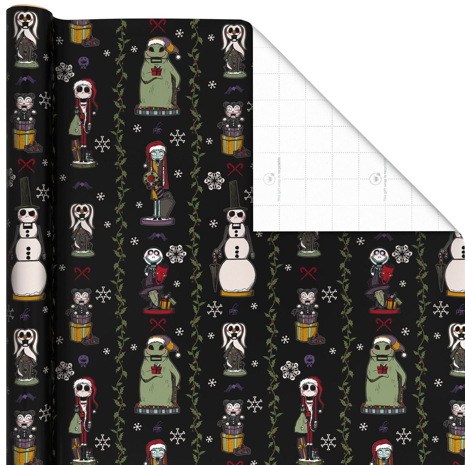 This 70 square foot roll is also recyclable. The black paper features stripes of Nightmare Before Christmas-inspired nutcrackers based on Jack, Sally, Oogie Boogie, Zero, the trick-or-treaters, and the Scary Teddy.