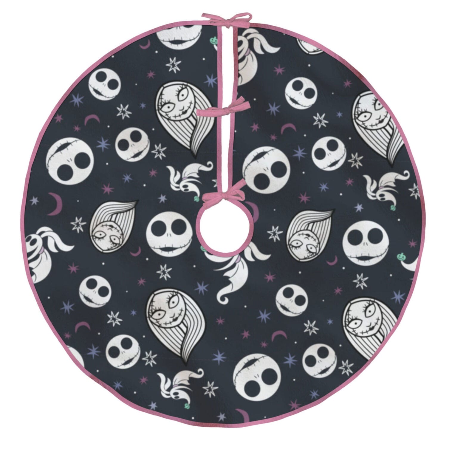 The tree skirt is dark blue with pink trim and ribbons. It’s patterned with Jack and Sally’s faces, plus Zero, pink crescent moons, and stars. The diameter is 48″.