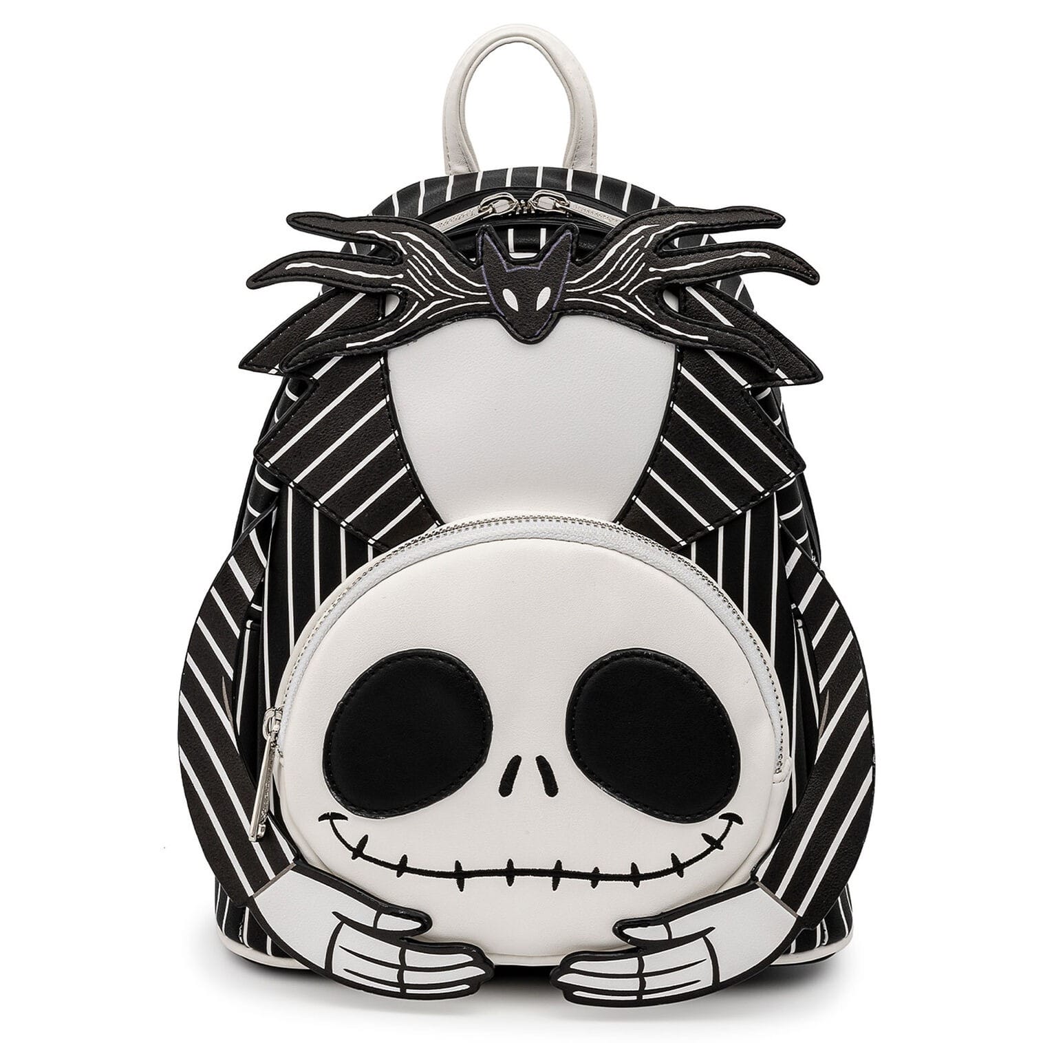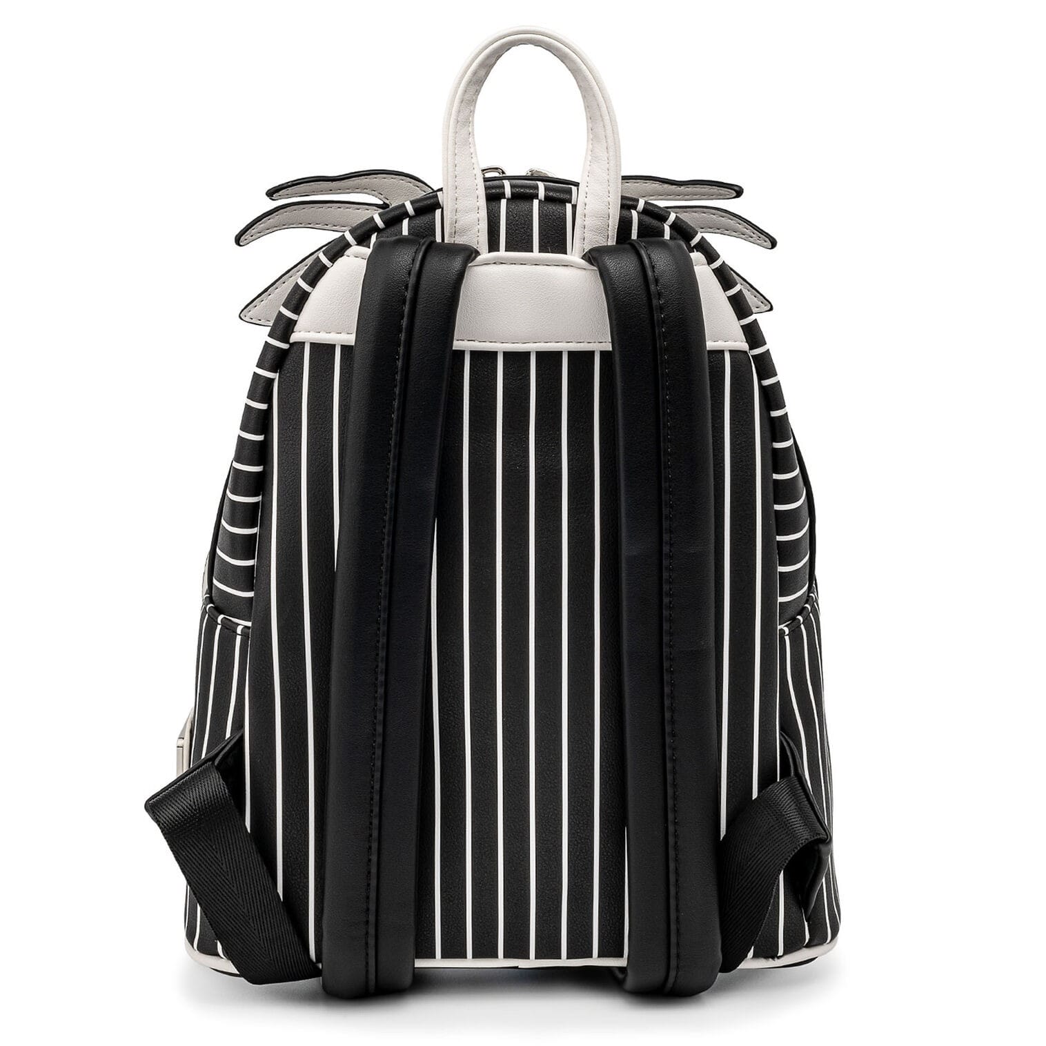 The Loungefly depicts Jack holding his own head, which acts as the front zip pocket. Dimensional arms on the sides hold the skull. Appliqués create his collar and bat bowtie. Most of the bag is pinstriped white and black. It has a white top carry handle and black shoulder straps.