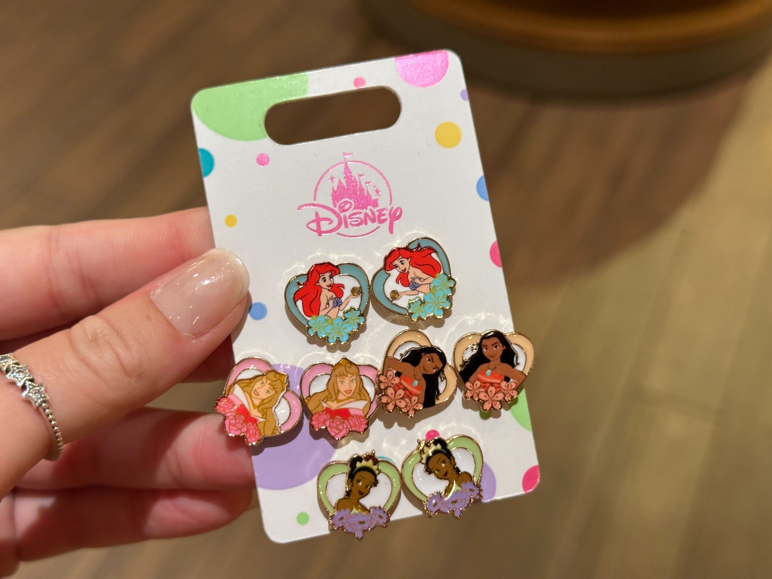 The set of Disney Princess earrings comes with Ariel, Aurora, Moana, and Tiana on color coordinated hearts. Each character has flowers below lining the bottom of the heart.