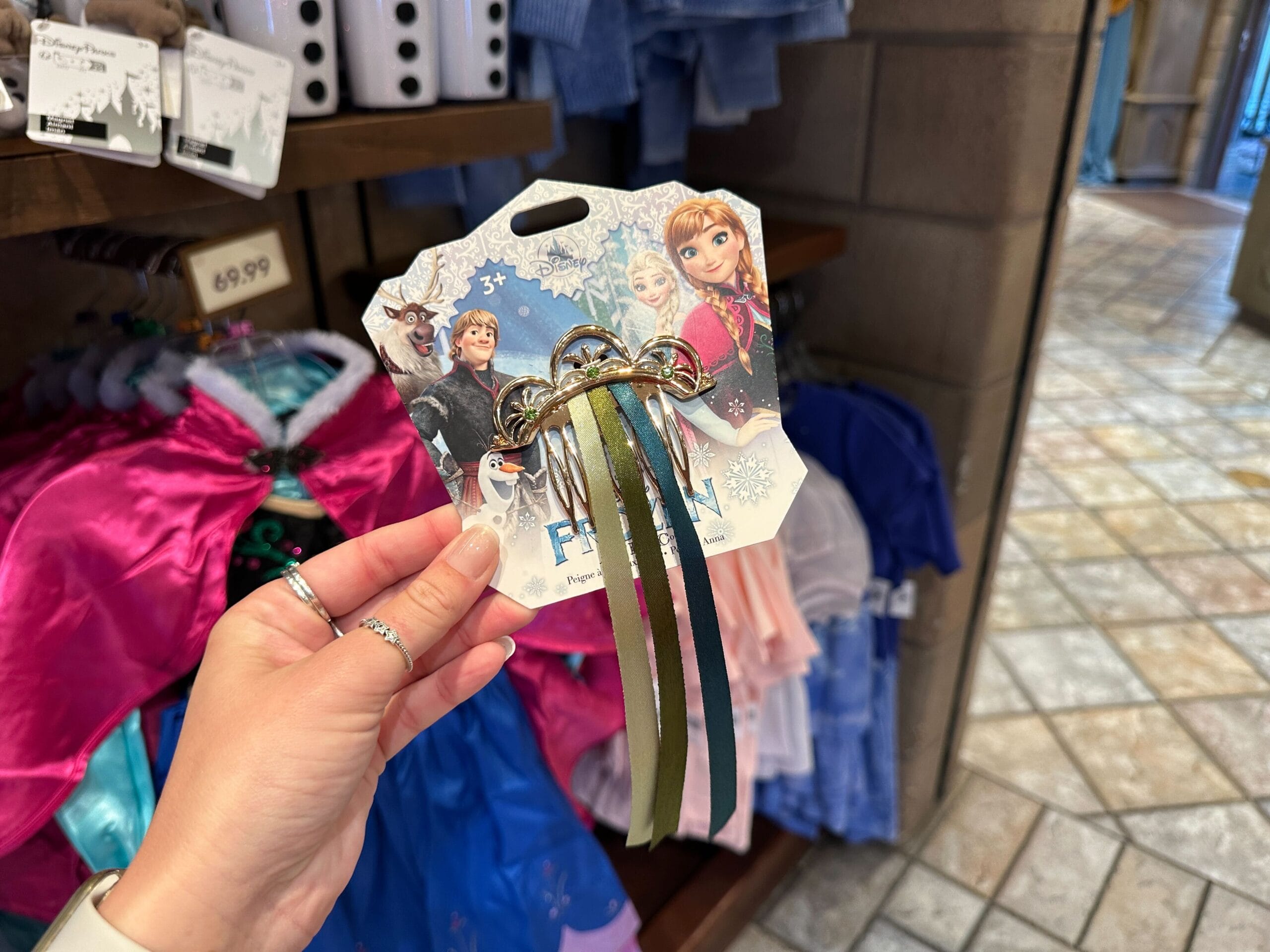 A hair clip resembling Princess Anna’s crown from the first Frozen film is also available. Streamers of greens and blue hang from the crown.