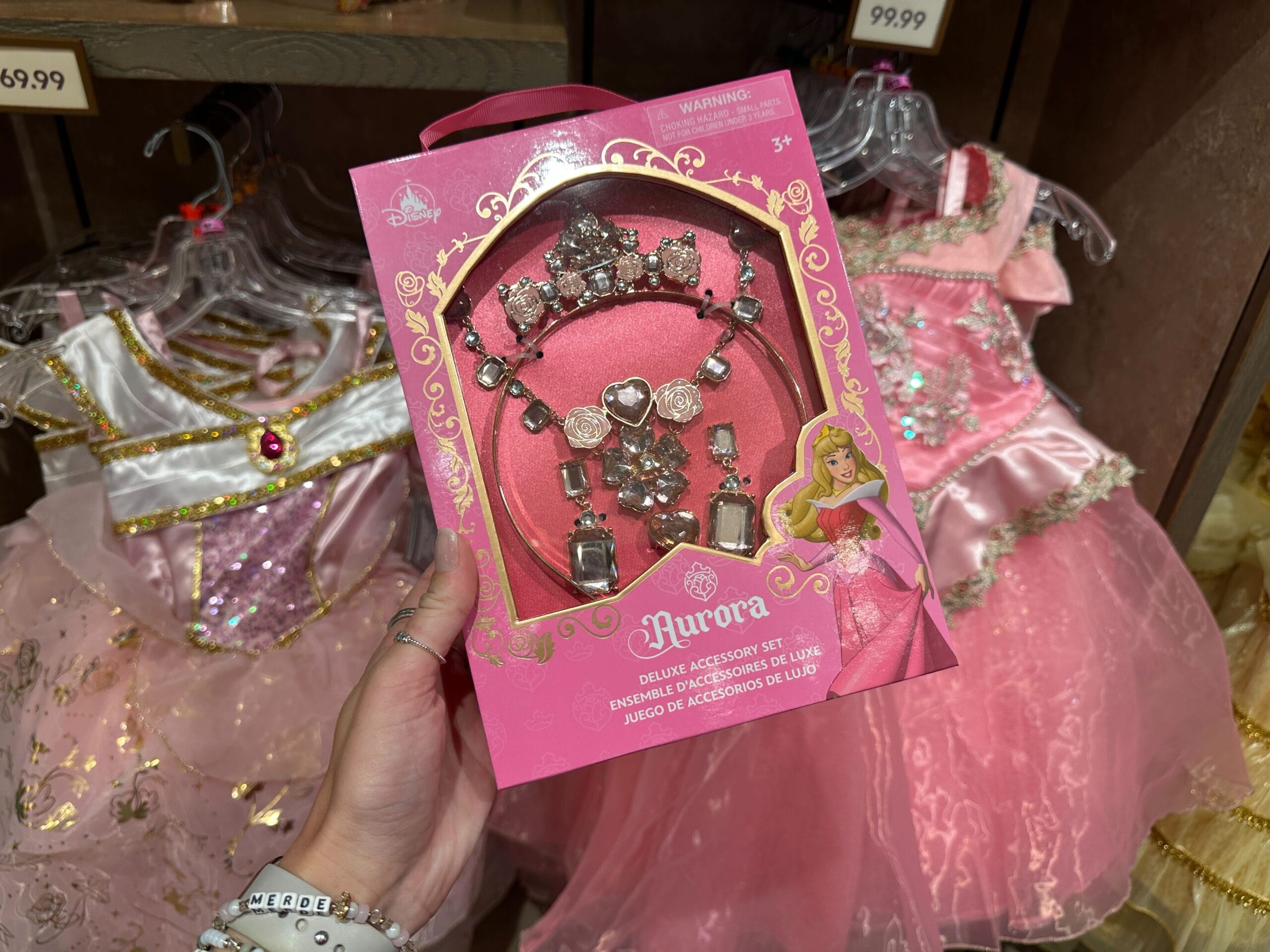 Three gifts sets with costume jewelry are available for princesses in training. The first is an Aurora set with a crown, necklace, and earrings all included.