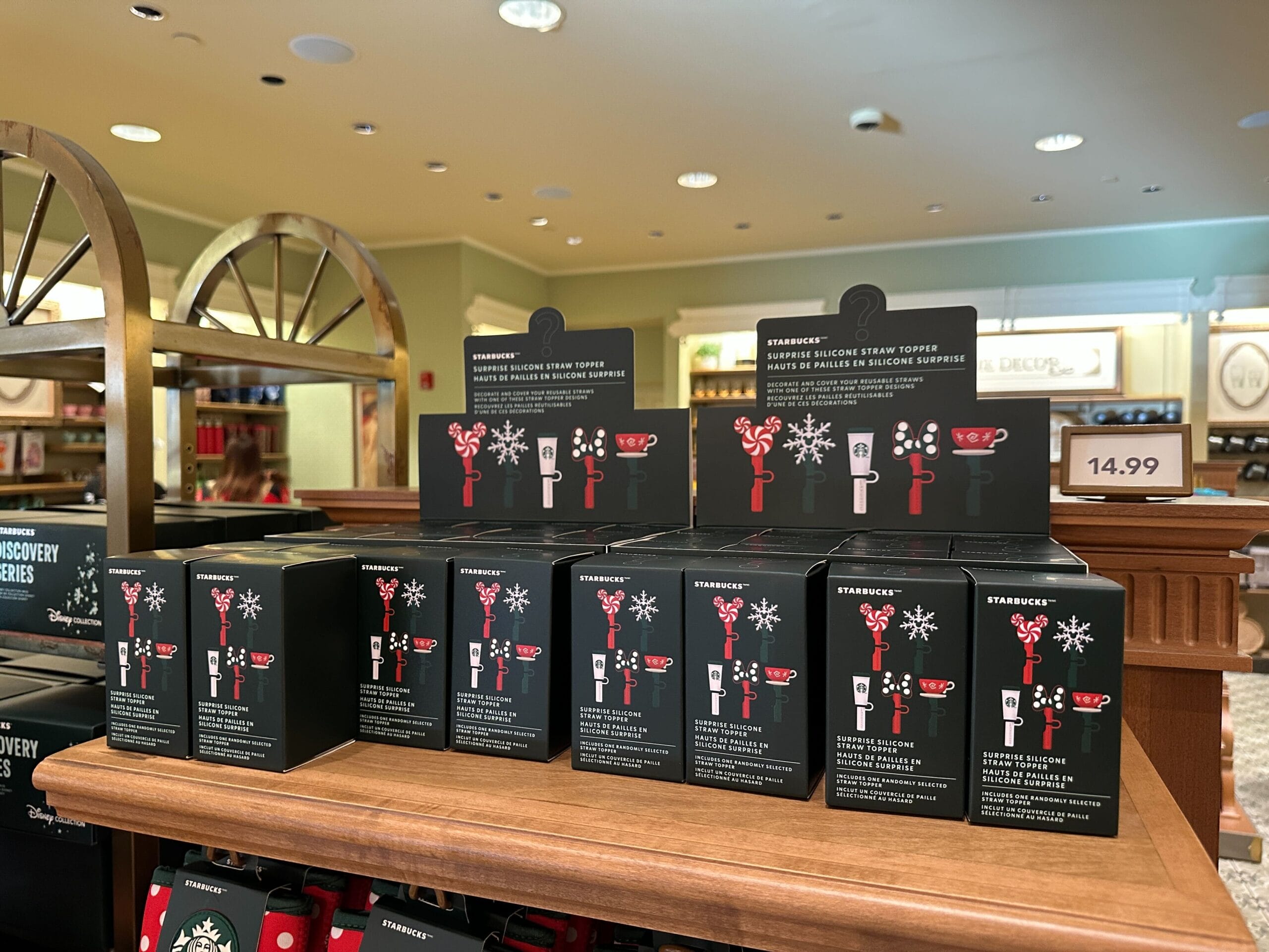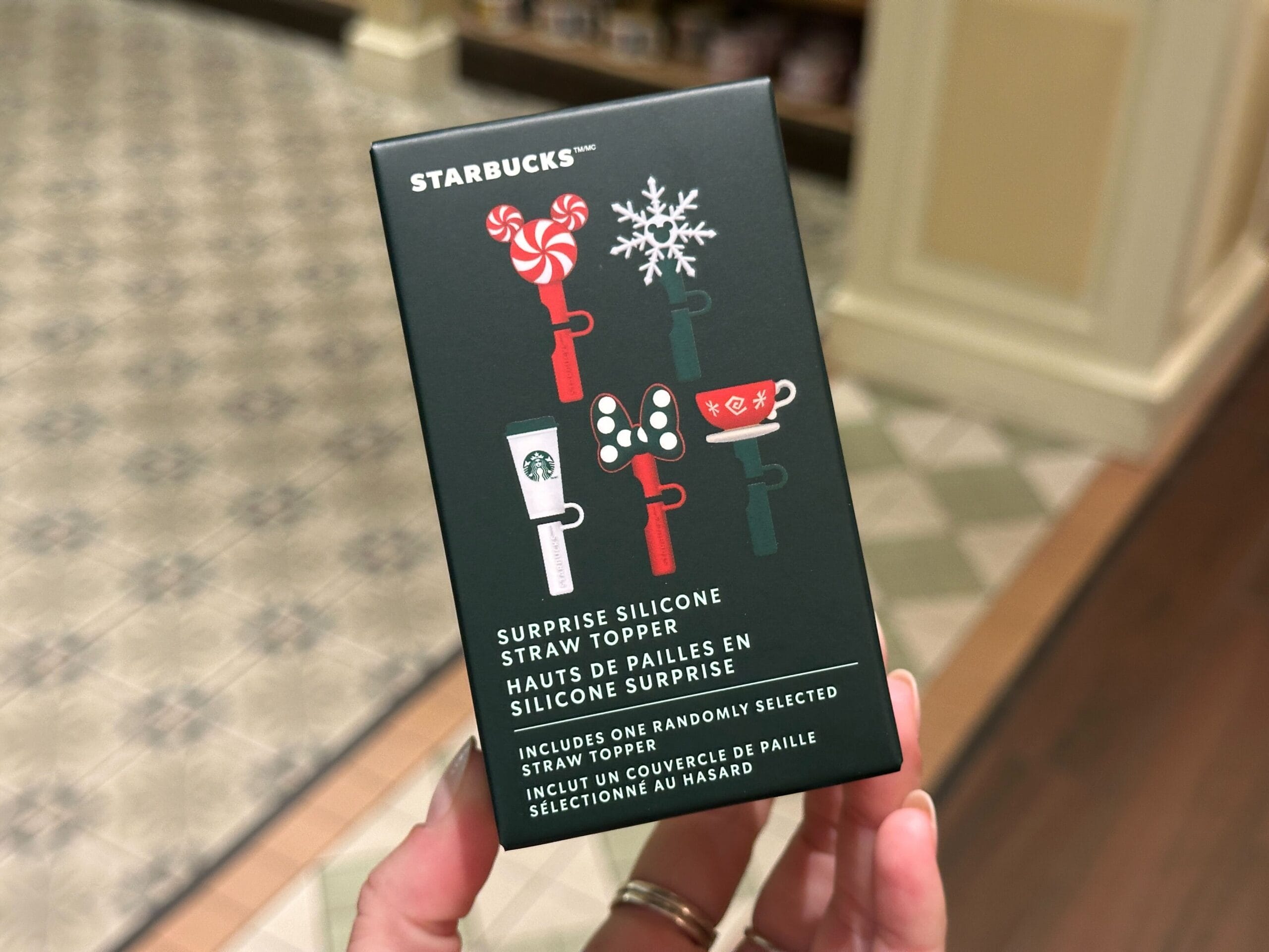 Protect and decorate your reusable straw with a surprise topper. There are five different designs, including a candy cane swirl Mickey icon, white snowflake with a Mickey icon in the center, a classic Starbucks cup, green Minnie bow with white polka dots, and a red Christmas-themed tea cup.