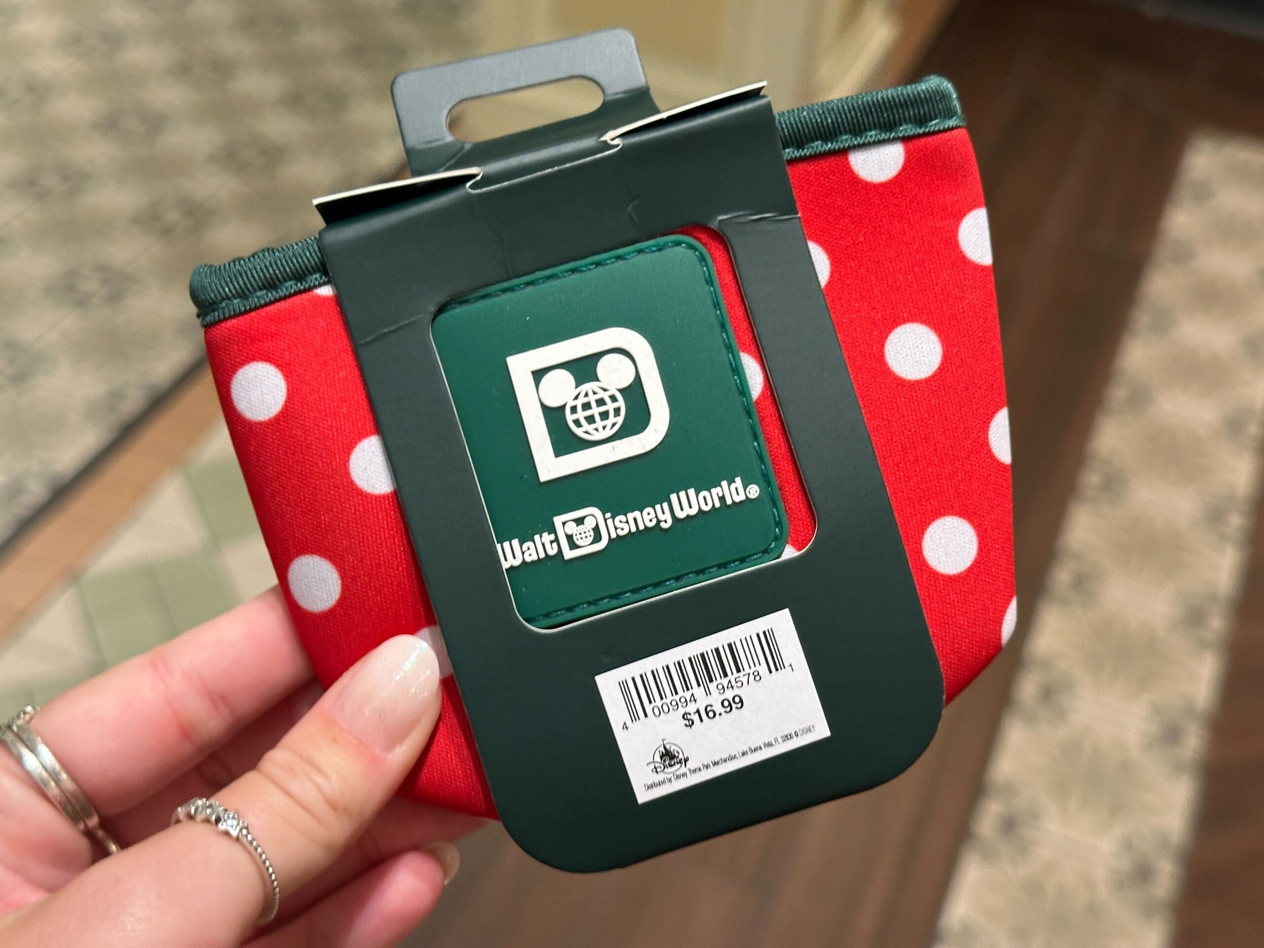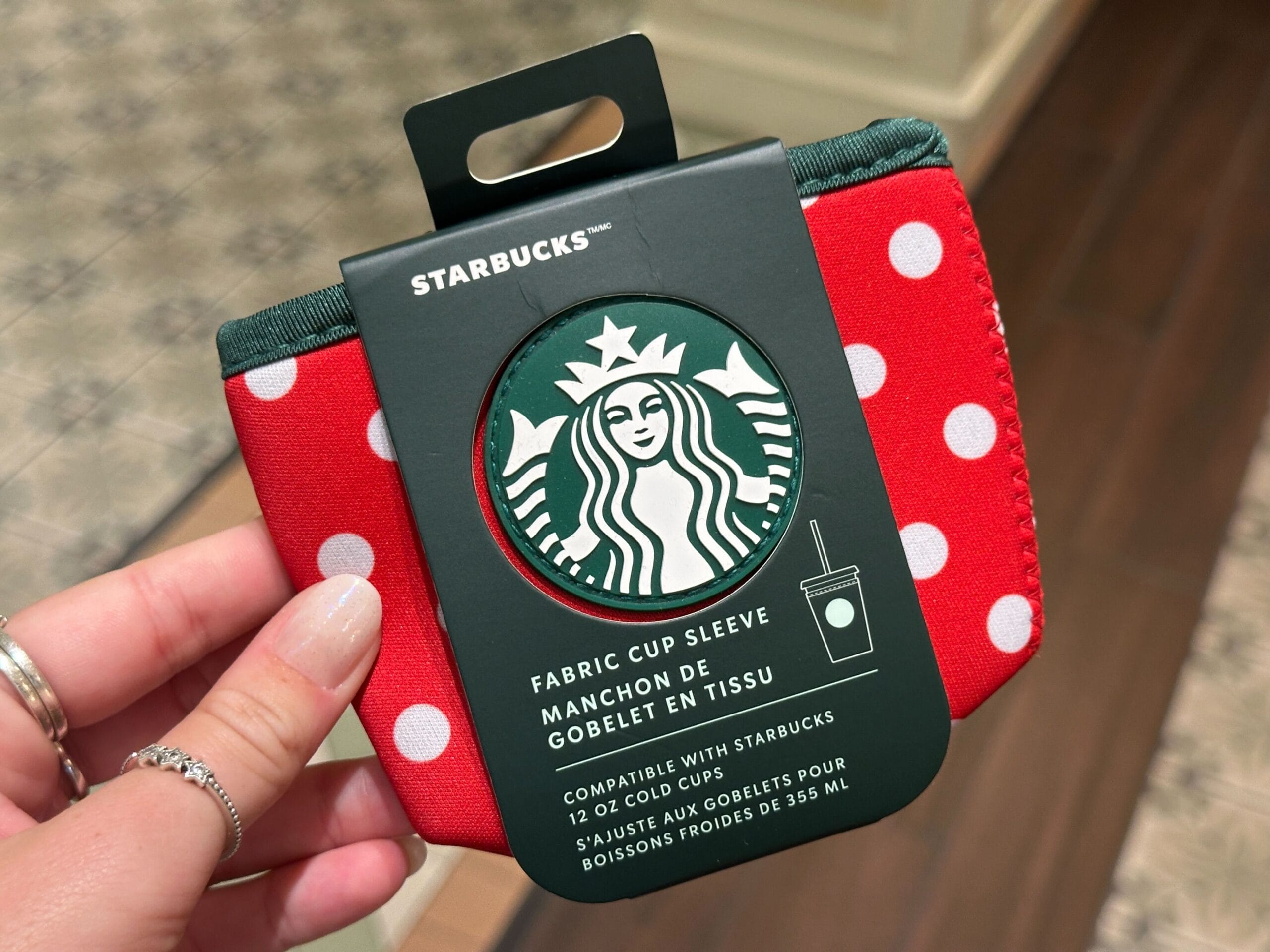 The fabric cup sleeve is compatible with Starbucks 12 oz cold cups. It is red with white polka dots and green stitching on the top. One side has the green Starbucks logo, and the other side has a green square patch with the Walt Disney World logo.