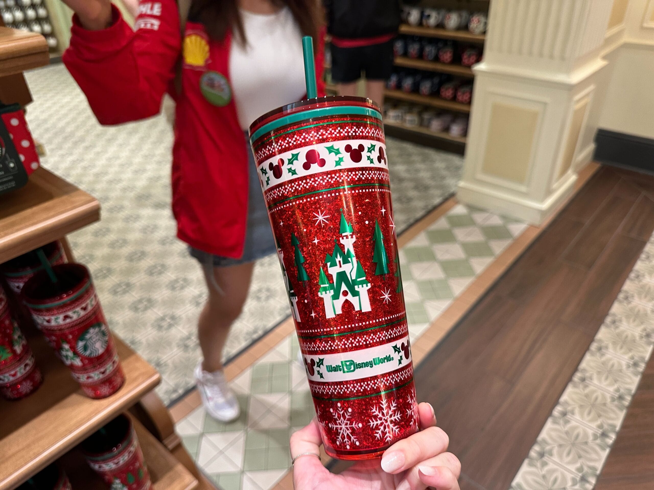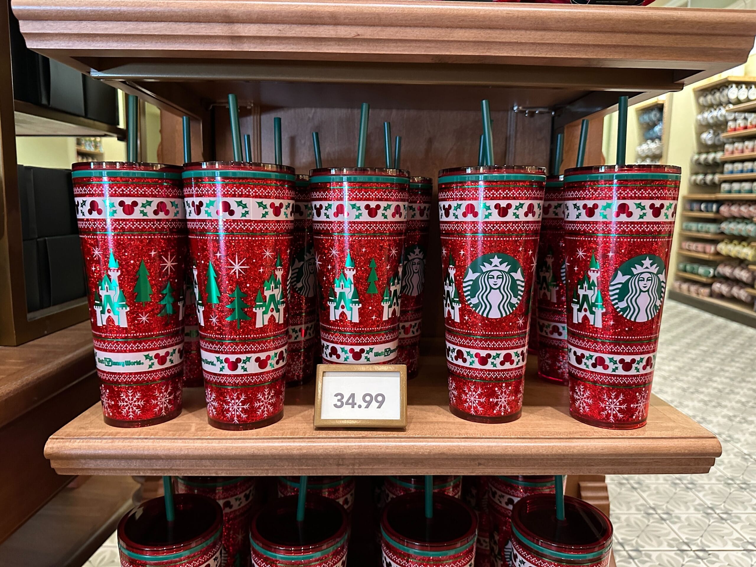 There are Mickey icon holly berries, snowflakes, the Starbucks logo, Cinderella Castle, Christmas trees, and the Walt Disney World wordmark.