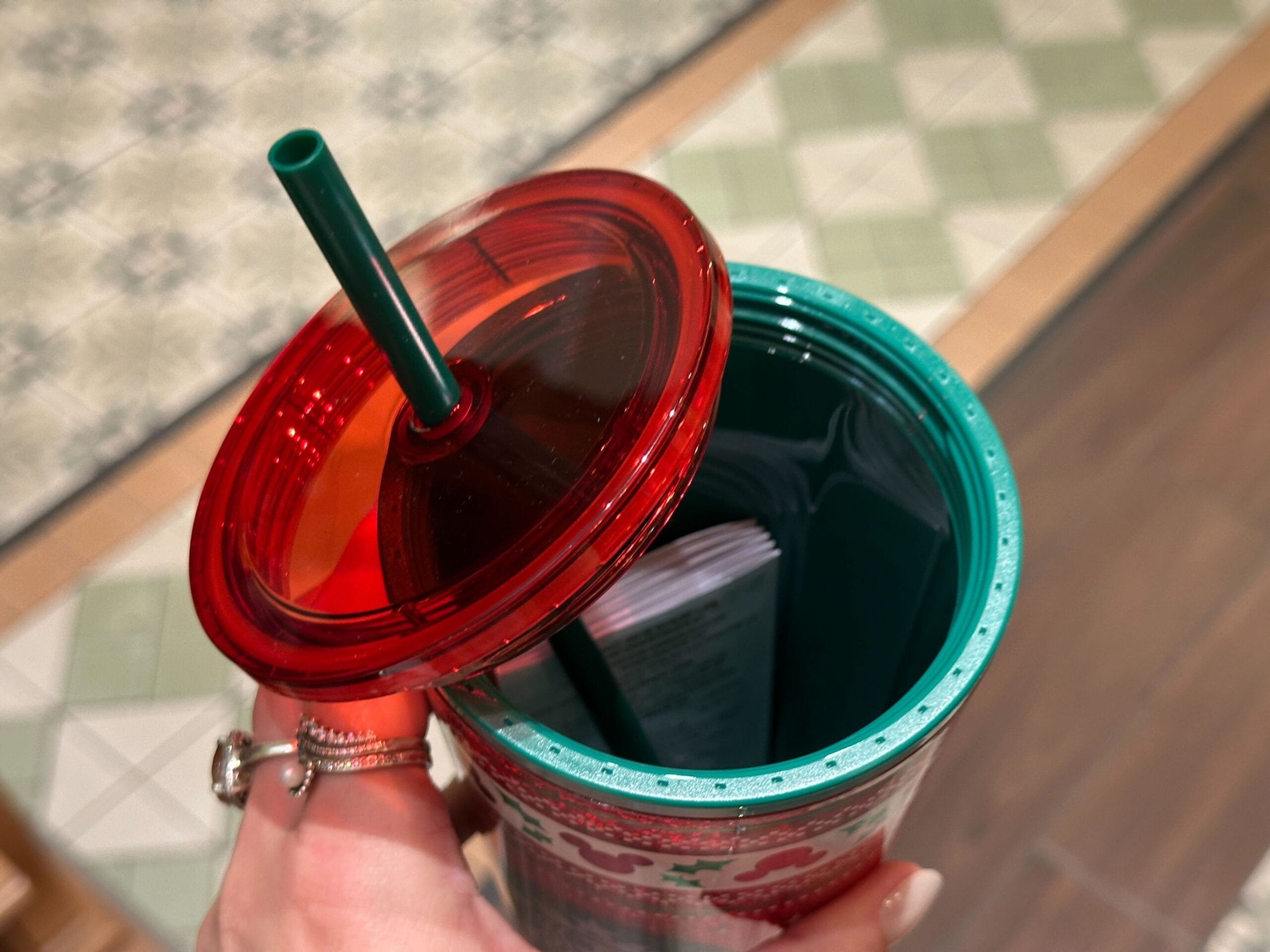 Get in the Christmas spirit with the new Starbucks Christmas tumbler, which is a glittery red color. There are various Christmas & holiday images in green, white, and red surrounding the tumbler.