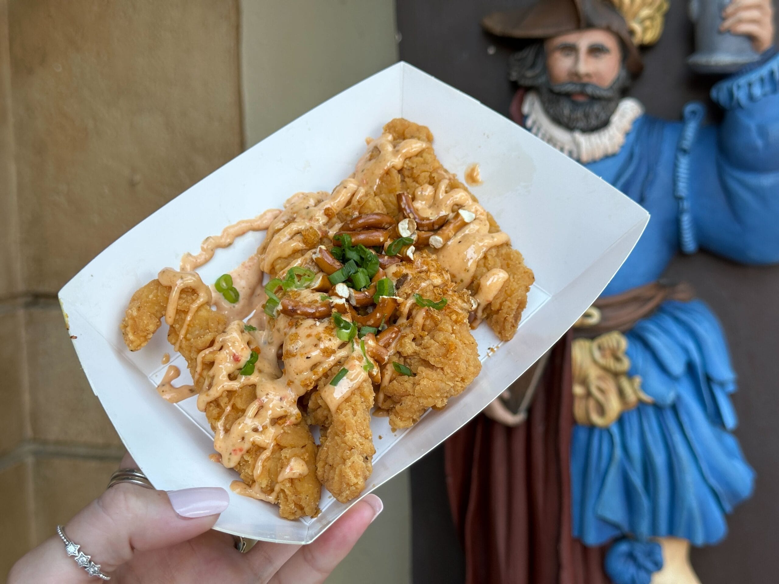 The Seaside Chicken is a decent option in terms of Chicken Strip options at Disney World, but the texture is strange. The pretzels, which seem odd to be included in a “seafood” dish, are softer than the crispy chicken breading.