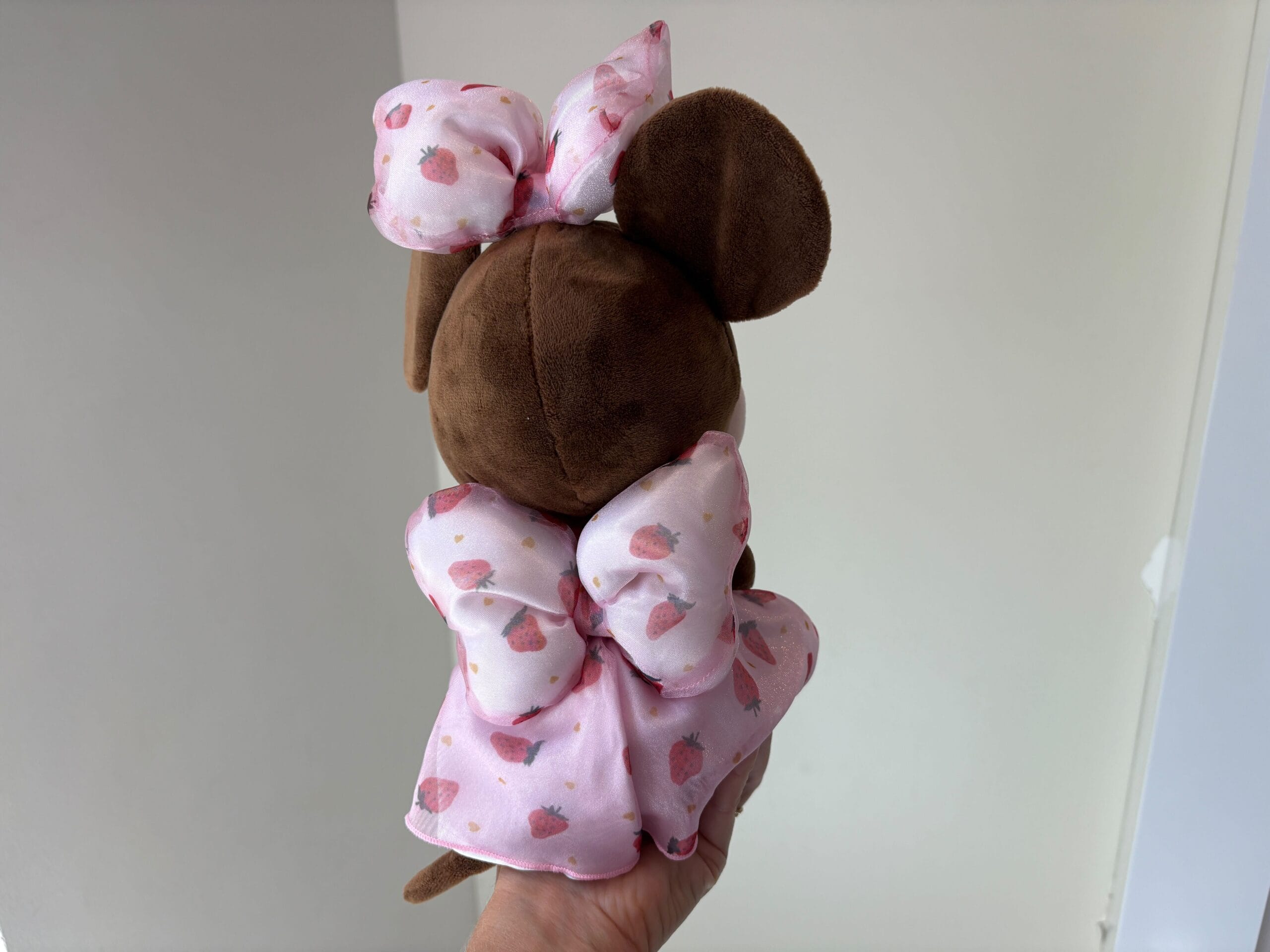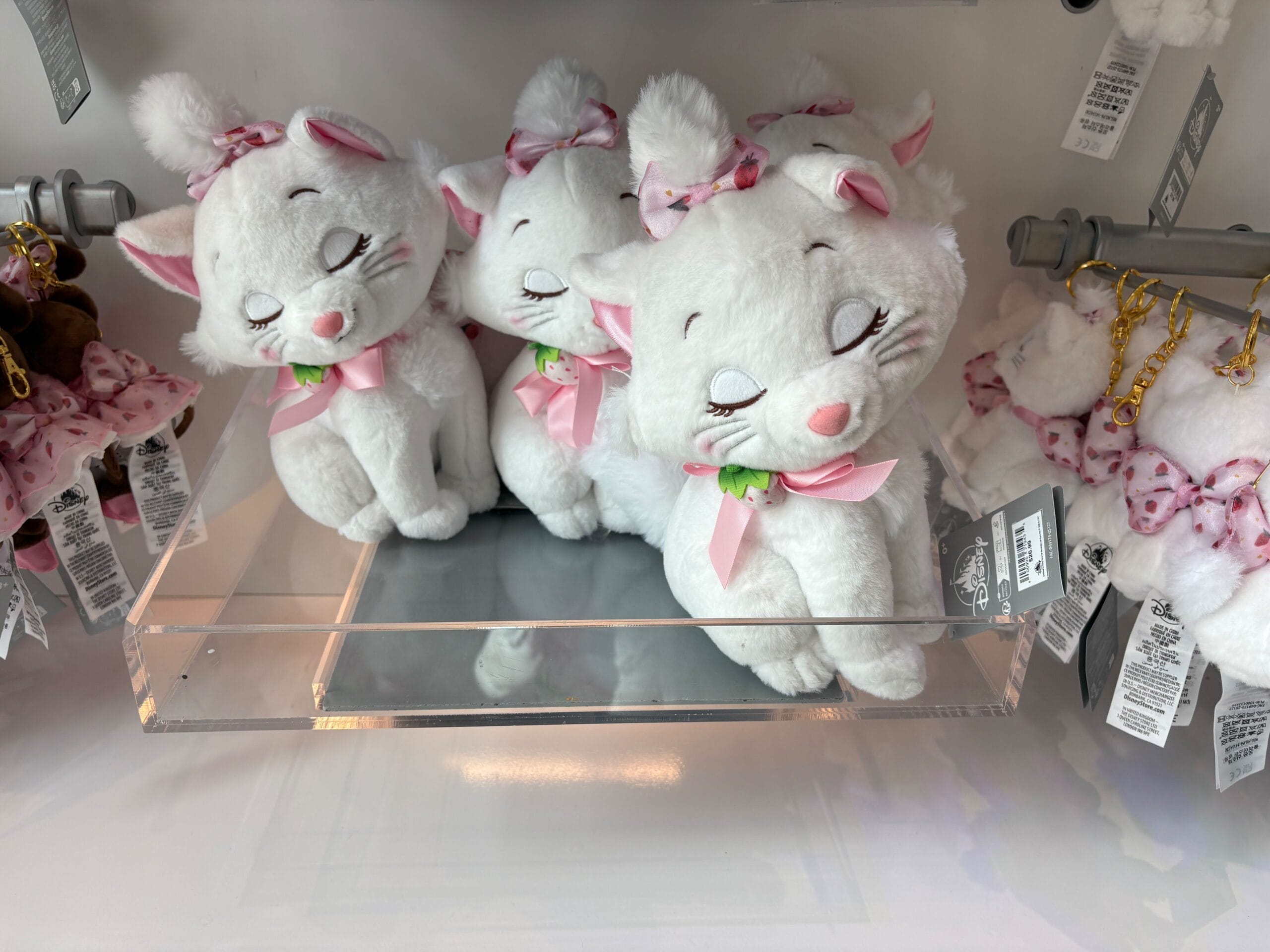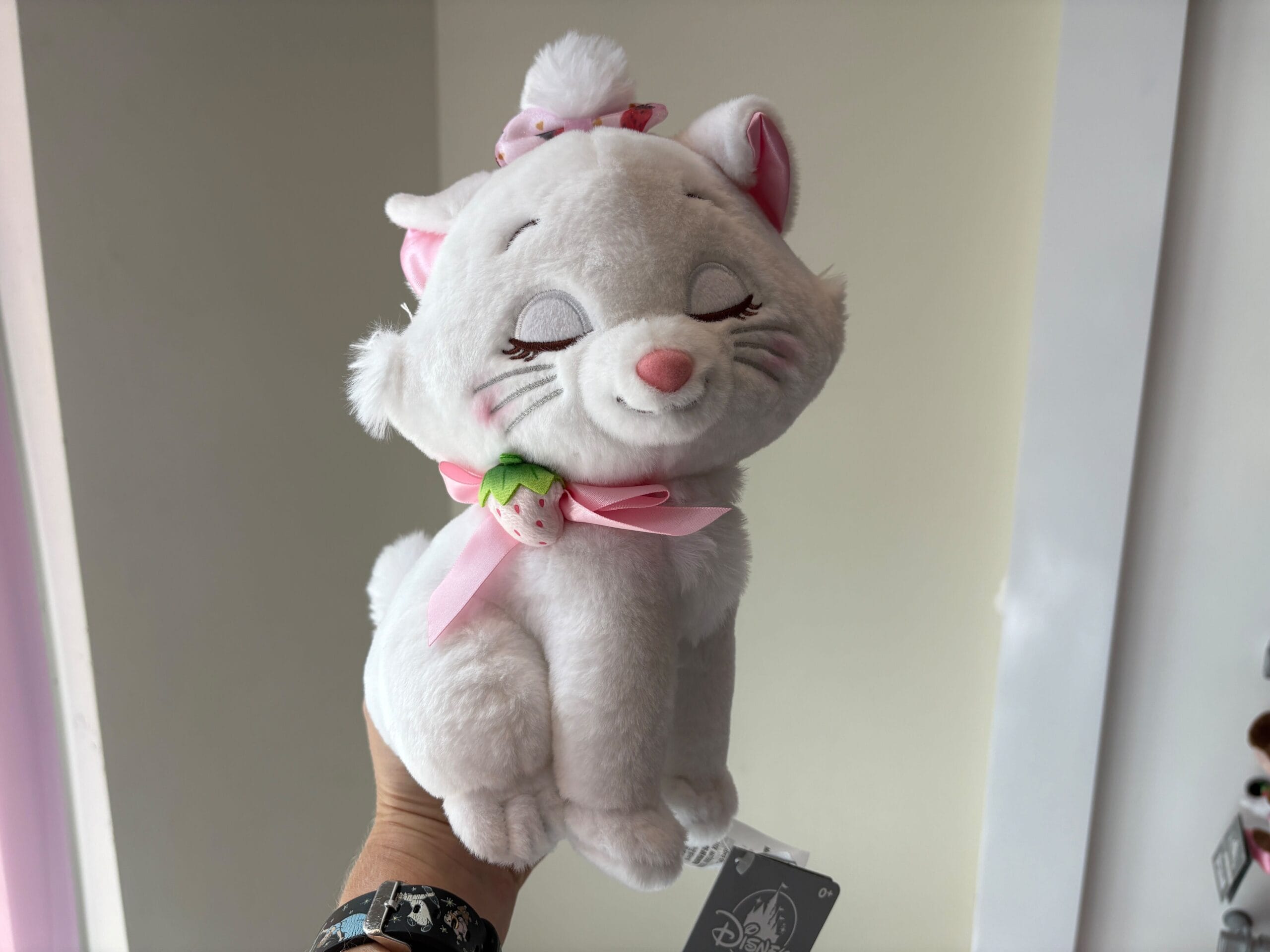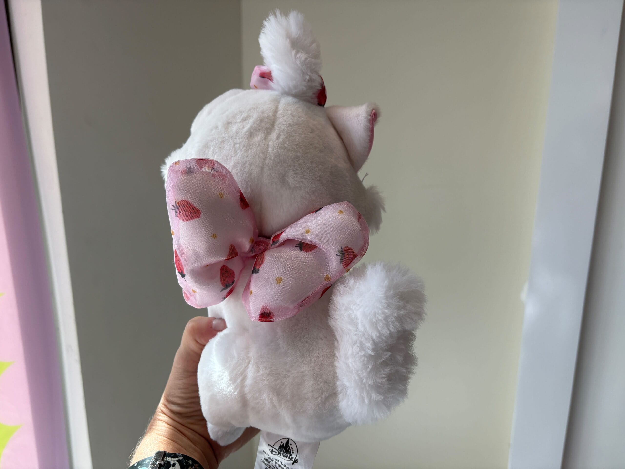 Marie has a trio of bows: a ribbon in the front with a pink plush strawberry charm, a puffy pink bow with the same strawberry print as Minnie’s dress, and a matching bow tied around the tuft of fur on top of her head.