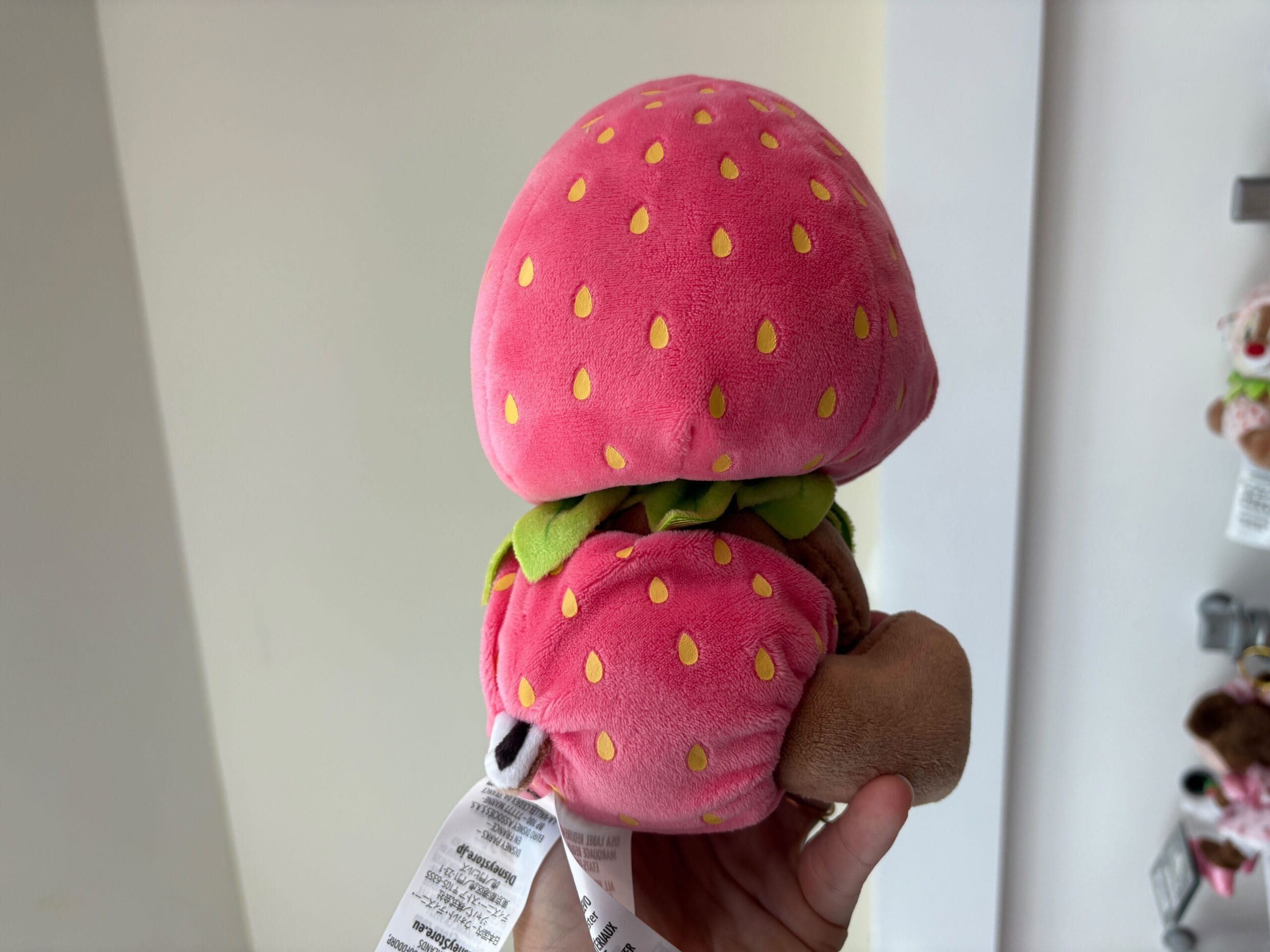 Chip is clad in a bright red strawberry costume with yellow seeds and a collar of green leaves. His fuzzy cheeks blush sweetly with pink spots. His tail peeks out of the back.