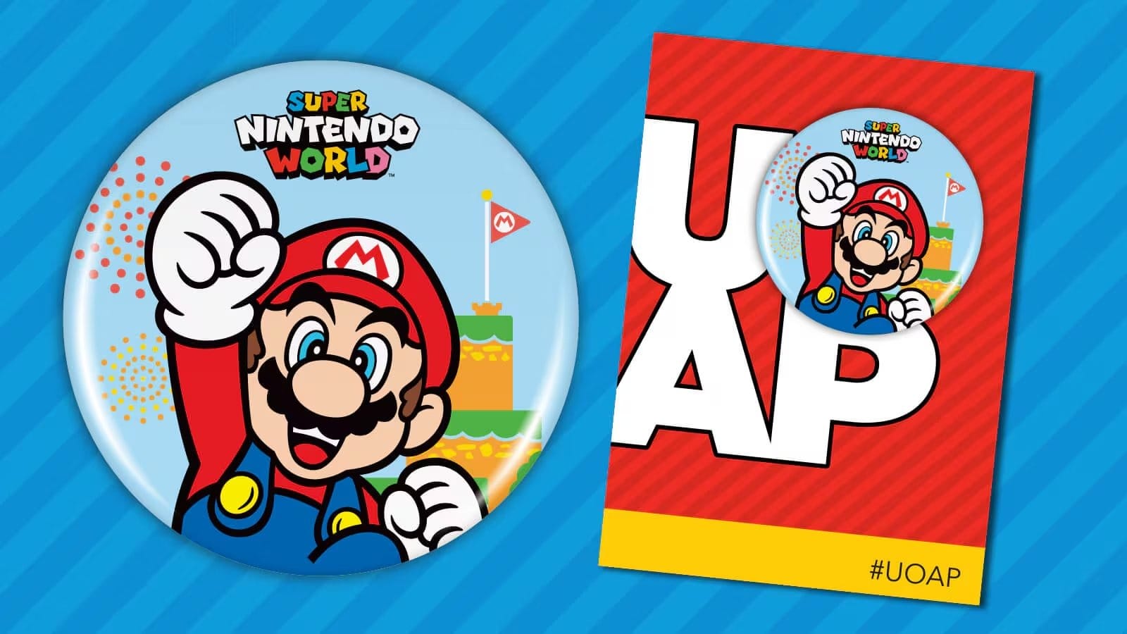 As previously teased, this button is based on Super Nintendo World at Epic Universe. It features Mario in front of Mt. Beanpole with fireworks and the Super Nintendo World logo. It comes on a red “UOAP” backing card.