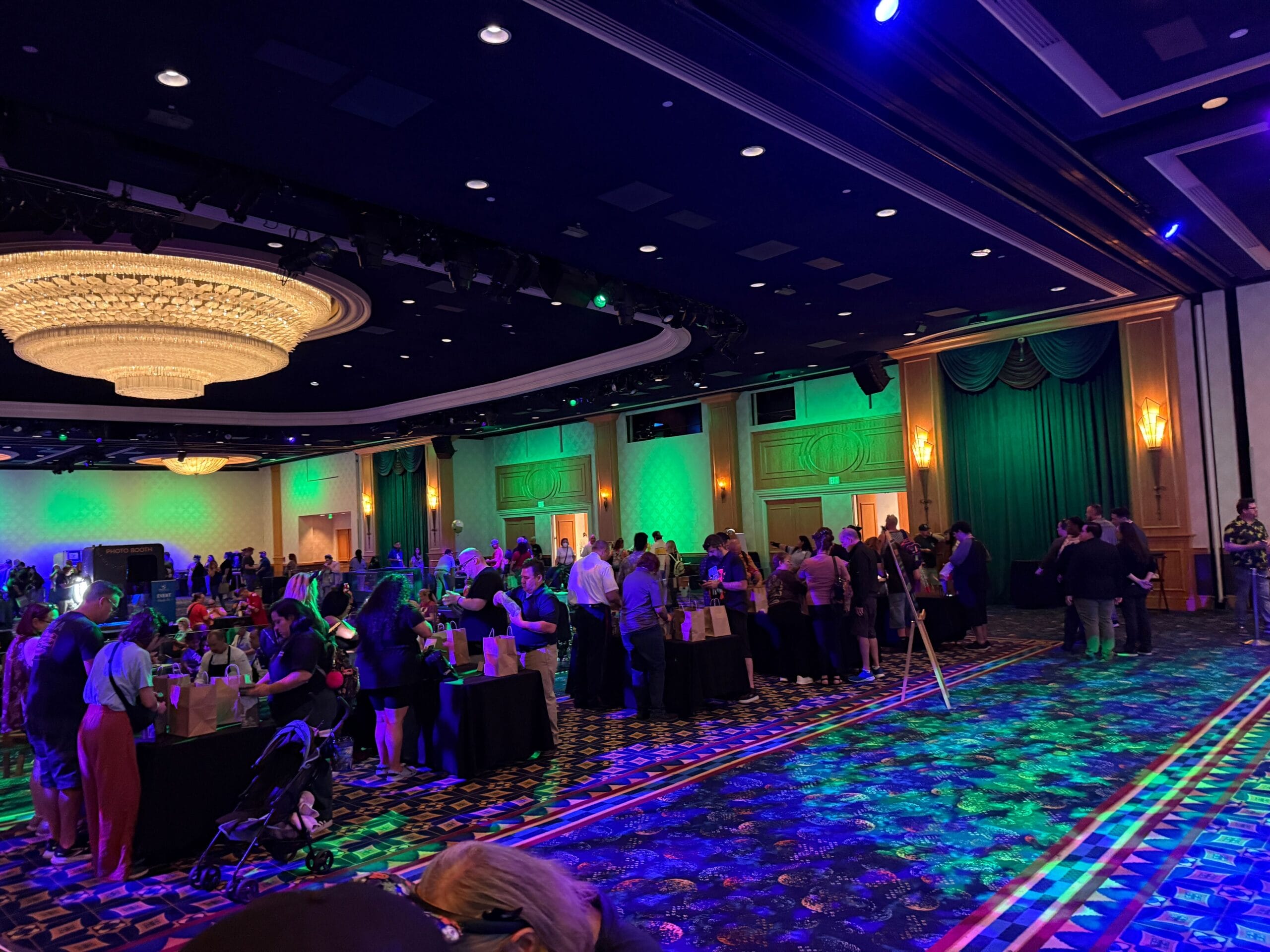 The Grand Ballroom was decorated using appropriately sinister lighting and a stage setup of stained glass windows. There was also a bar area.