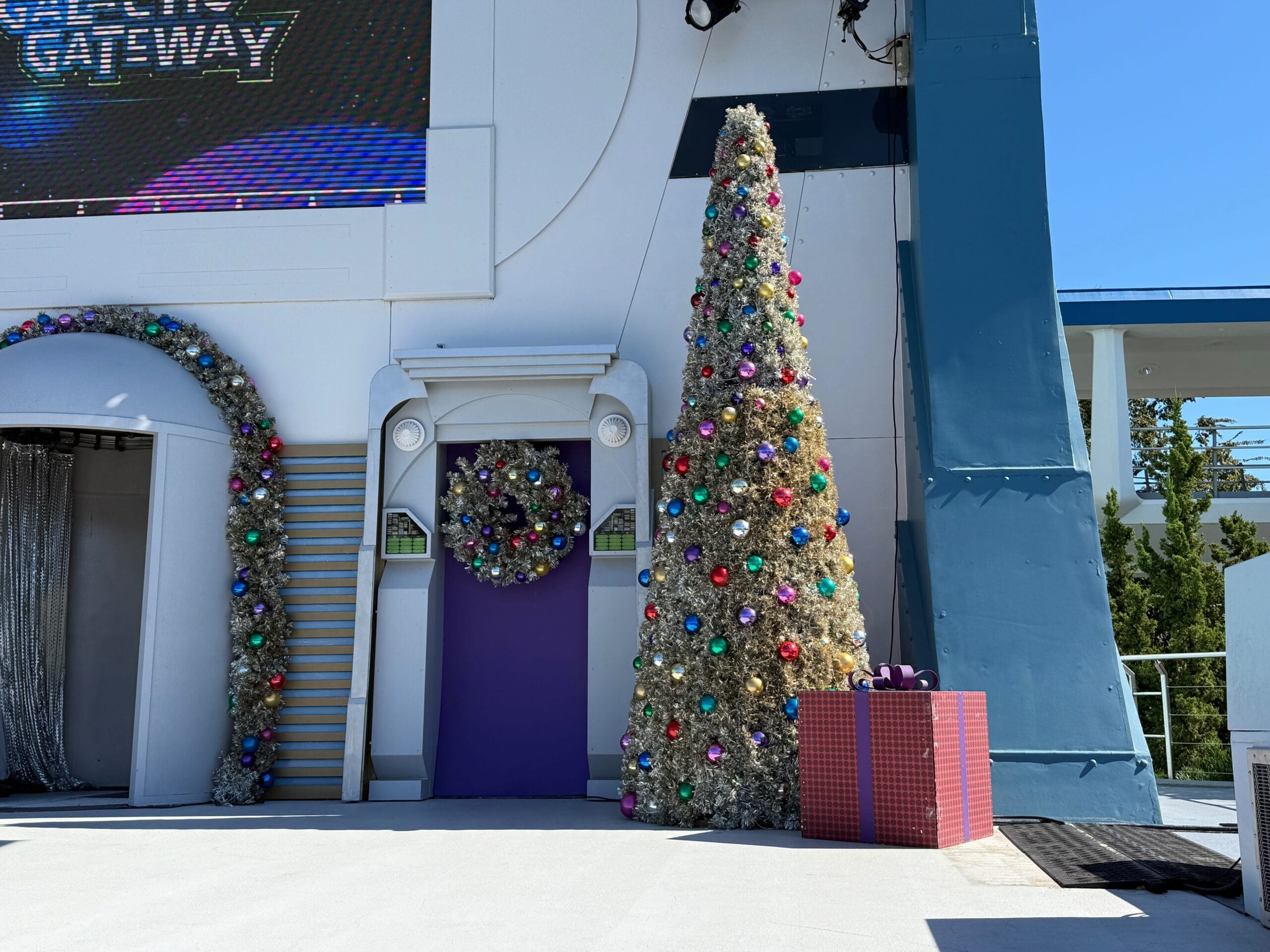 The Rocket Tower Plaza Stage in Tomorrowland at Magic Kingdom has been decorated for the 2025 holidays season.