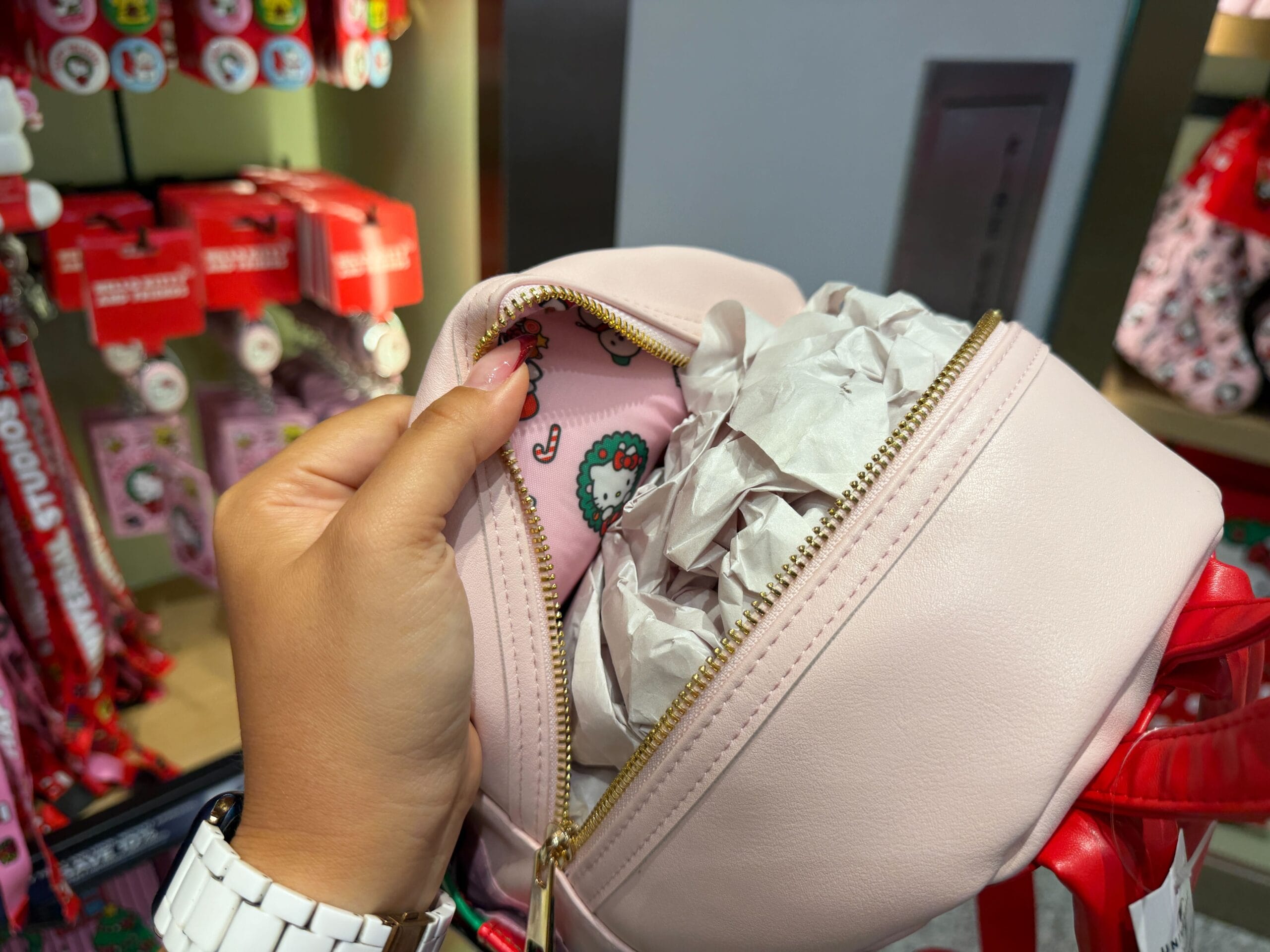 The mini backpack is pink with red straps and green side pockets. On the front, 3D images of Kitty, her friends, and other Christmas items are placed in front of a Christmas scene. The side pockets have red bows on the pockets to make them look like presents, but there is a bow for a touch of Hello Kity. Inside, a pink link has an allover print of Kitty and various Christmas items.