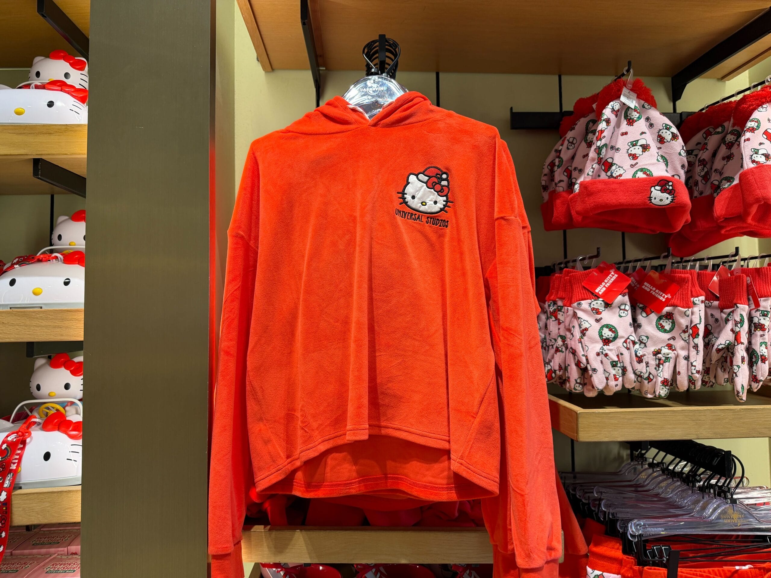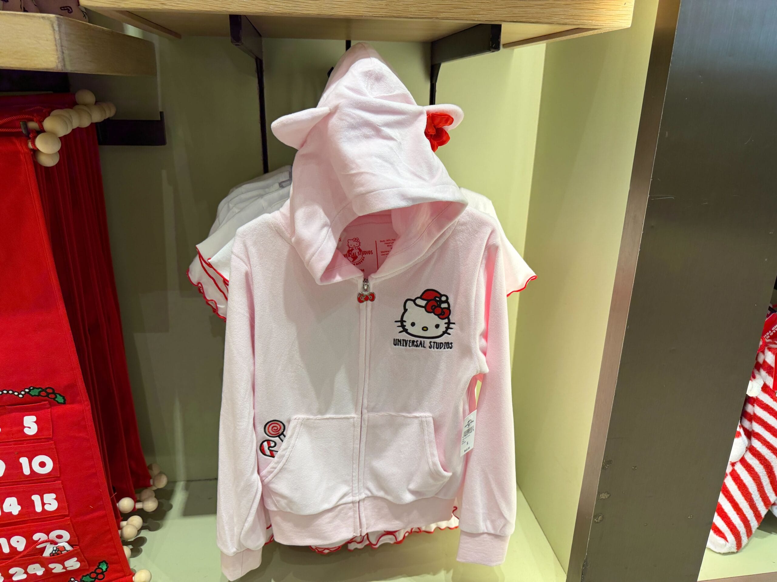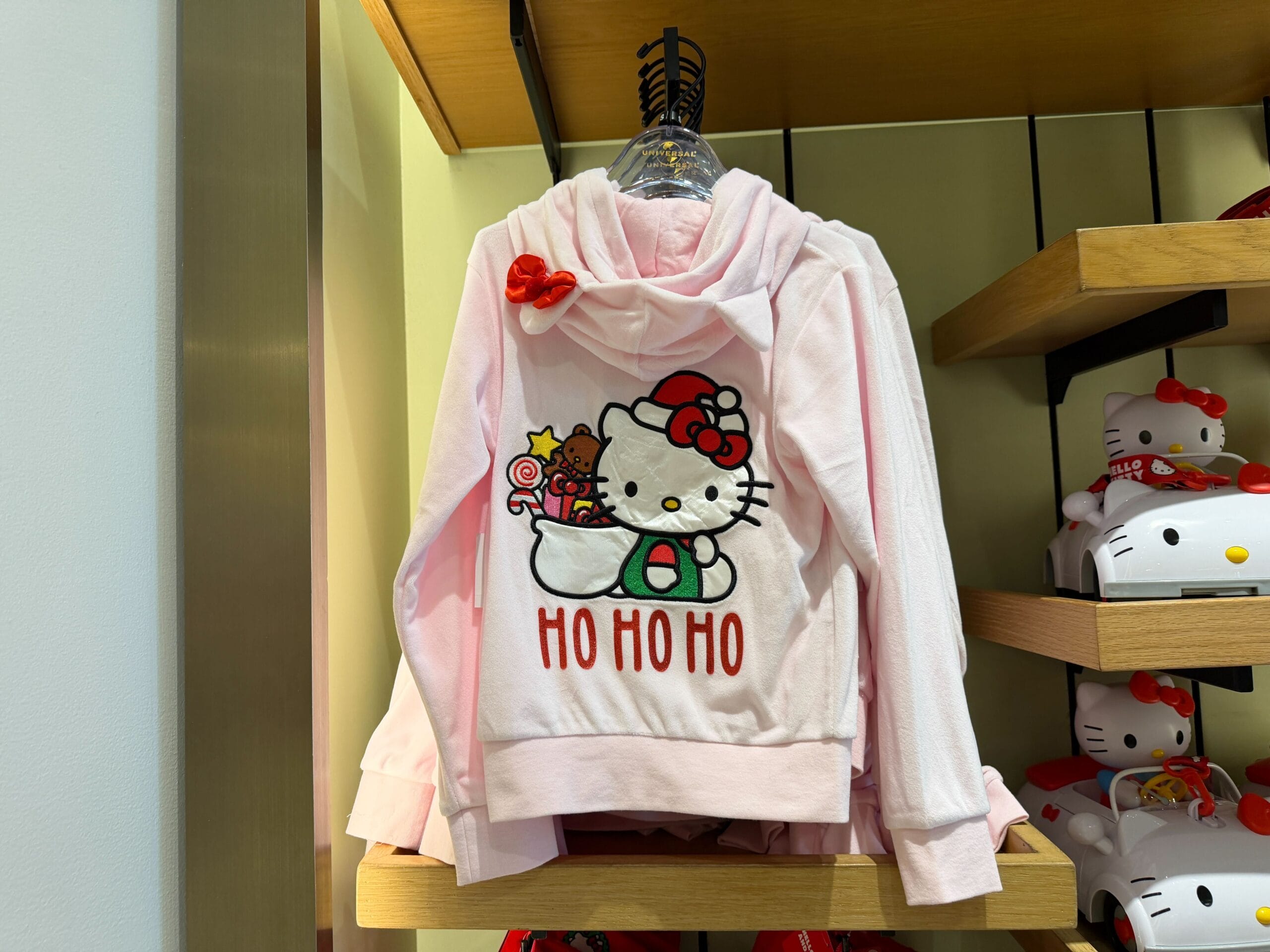 The youth-sized hooded sweatshirt features 3D ears on the hood, a metal bow charm on the zipper, and two front pockets. Kitty wearing a Santa hat and “Universal Studios” text is on the front chest, and a candy cane and lollipop peek out of one of the front pockets. The back has a puffy image of Kitty carrying a sack of toys and “Ho Ho Ho” text underneath.
