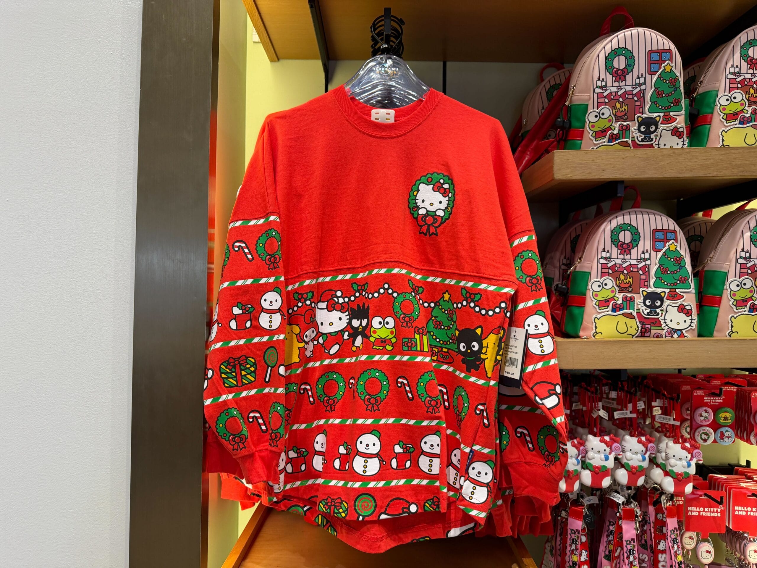 This red Spirit Jersey has Hello Kitty inside a wreath on the chest, and an “ugly sweater” print that runs along the front and back of the Spirit Jersey. It has images of Kitty, her friends, wreaths, candy canes, snowmen, stockings, and more. The back shoulder has “Hello Kitty and Friends” in white, puffy text.