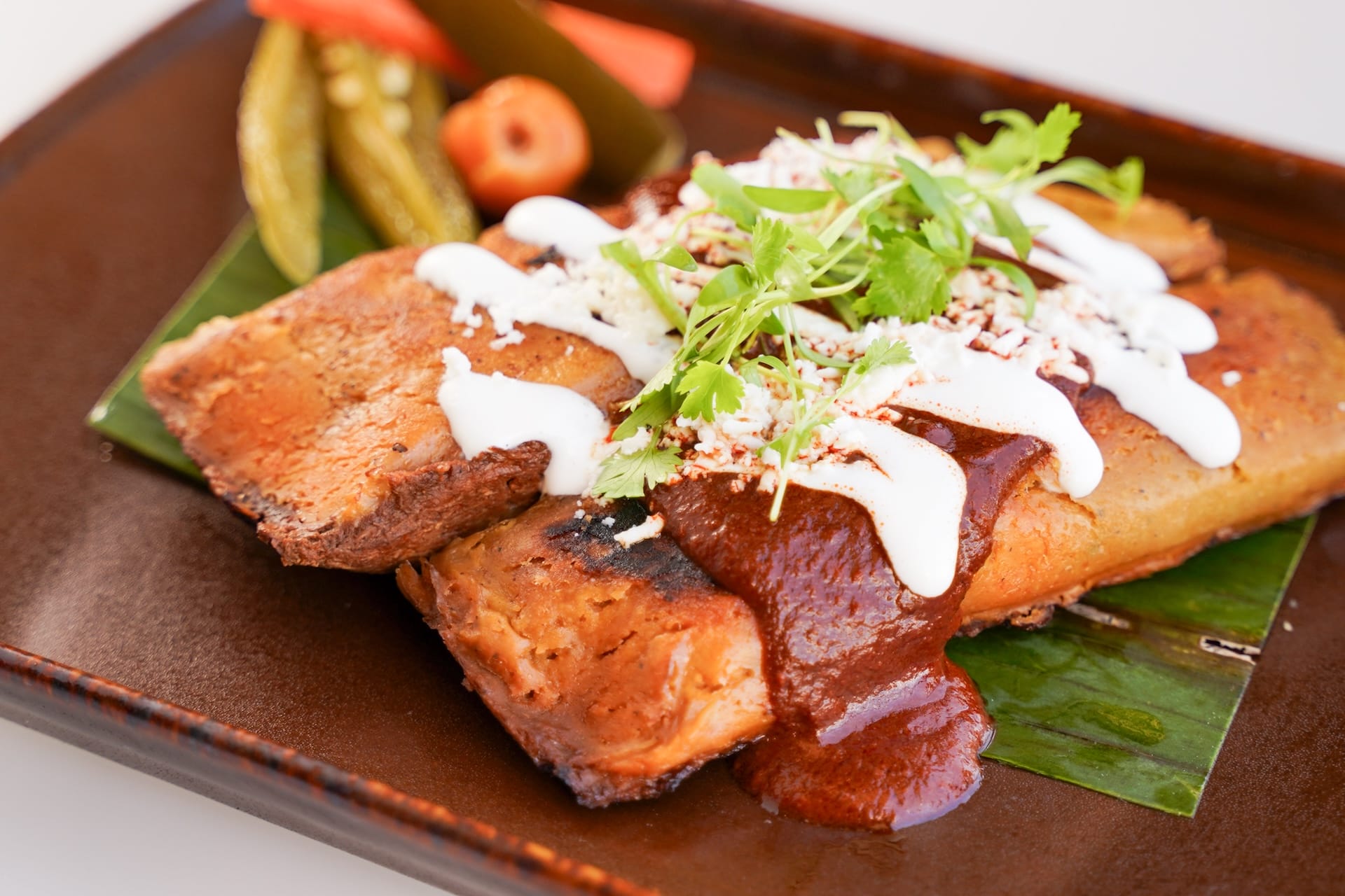 - Chicken Tamal: Oaxacan style tamal, with mole rojo, braised chicken, and pickled jalapeños, carrots, and squash veggies (New)