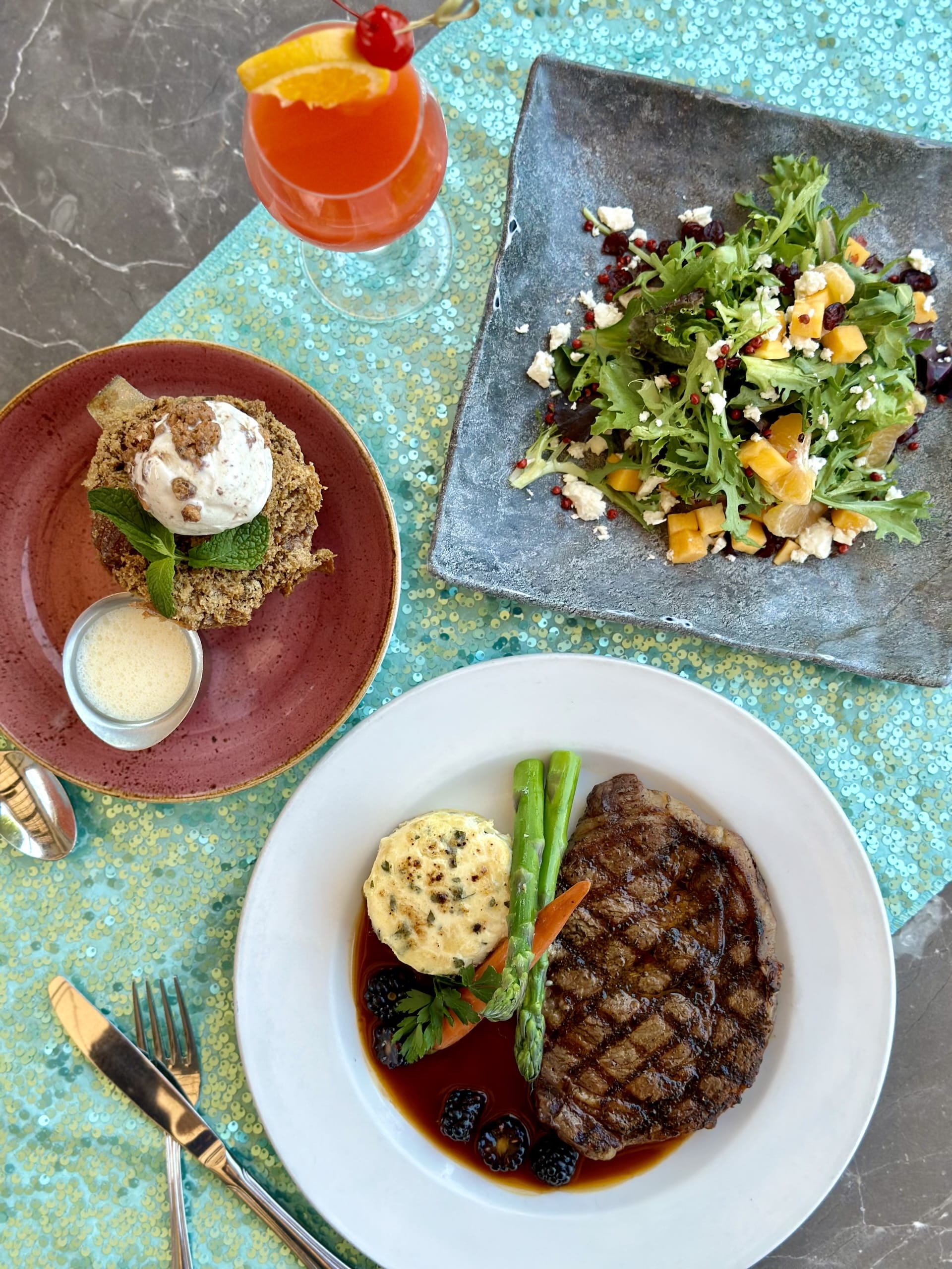 - Main – Grilled Ribeye: Dauphinoise potato, honey glazed baby carrots, butter poached asparagus, and blackberry merlot reduction (New)