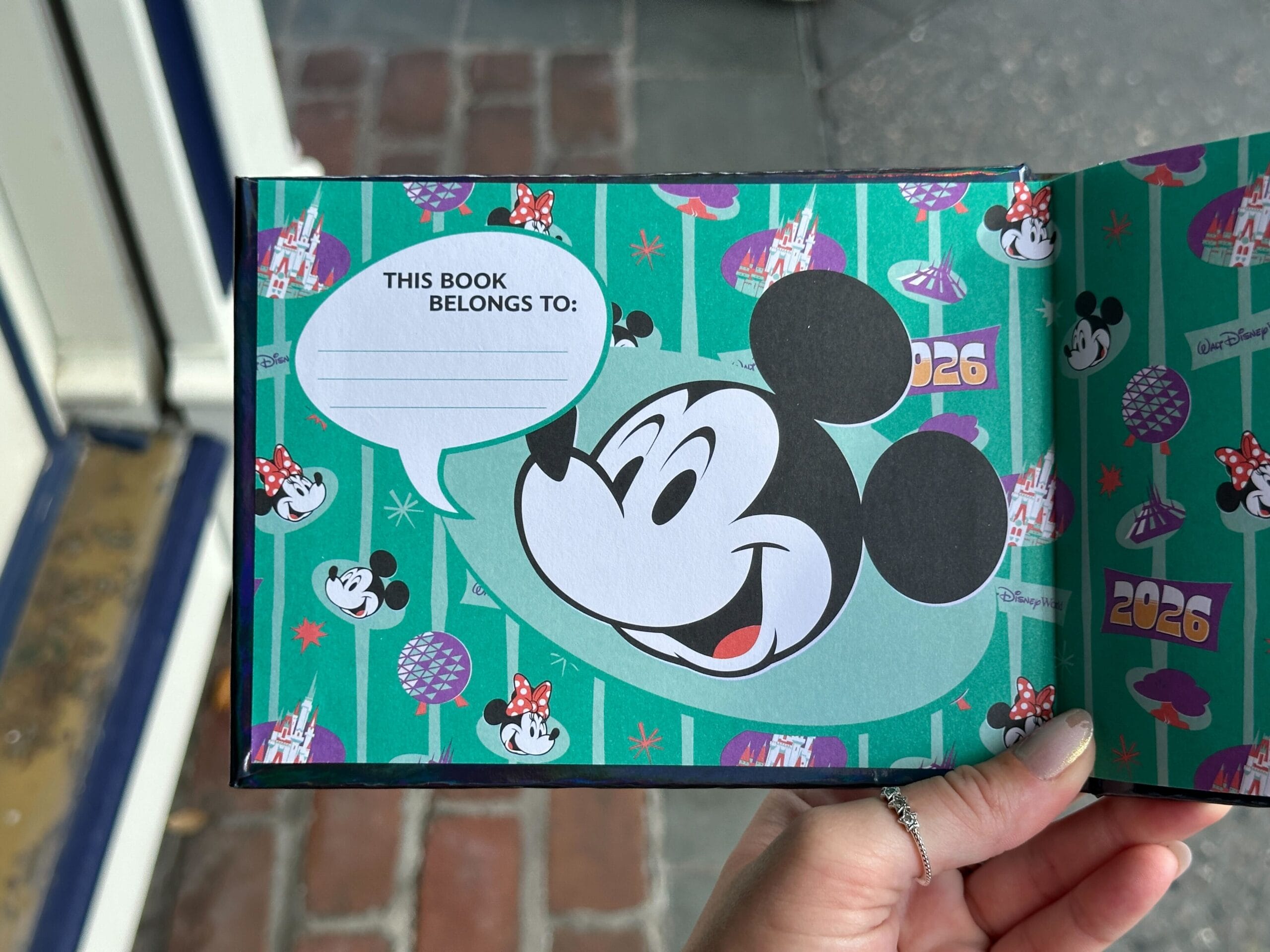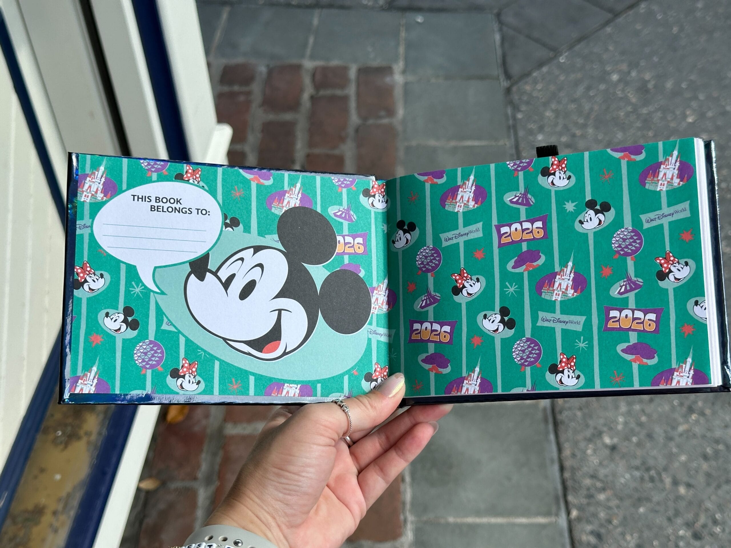 The interior and flyleaves of the covers are green pages with teal striping. They are patterned with the park icons, Mickey and Minnie, 2026, and the Walt Disney World wordmark.