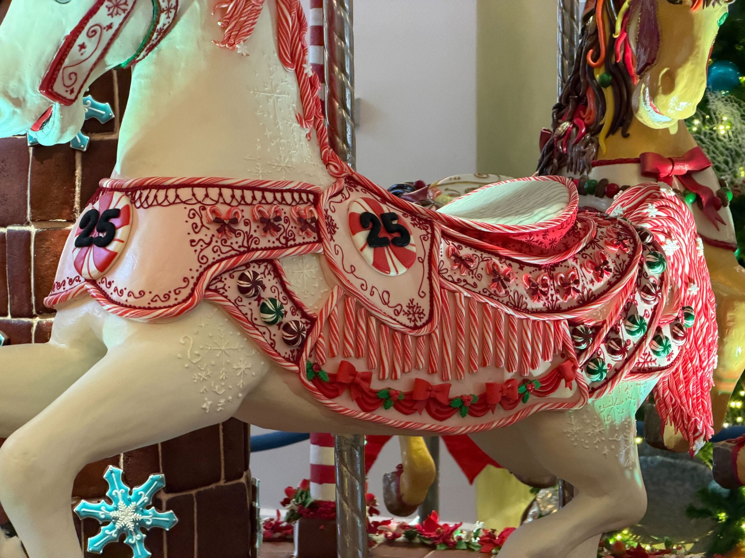 A white horse on the carousel features snowflake details and candy horseshoes. Its saddle, bridle, mane, and tail are all candy cane and peppermint-inspired.